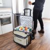 The rugged exterior of the Wheeled Cooler is water and stain repellent so that it wipes clean easily. It includes an expandable, insulated front compartment and an easy access lid that allows you to quickly grab a drink or sandwich without having to open the entire cooler.