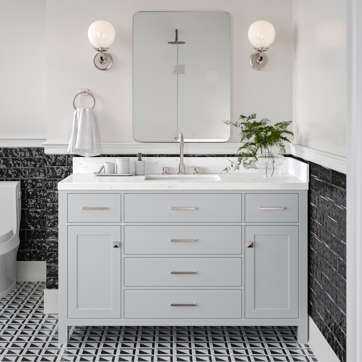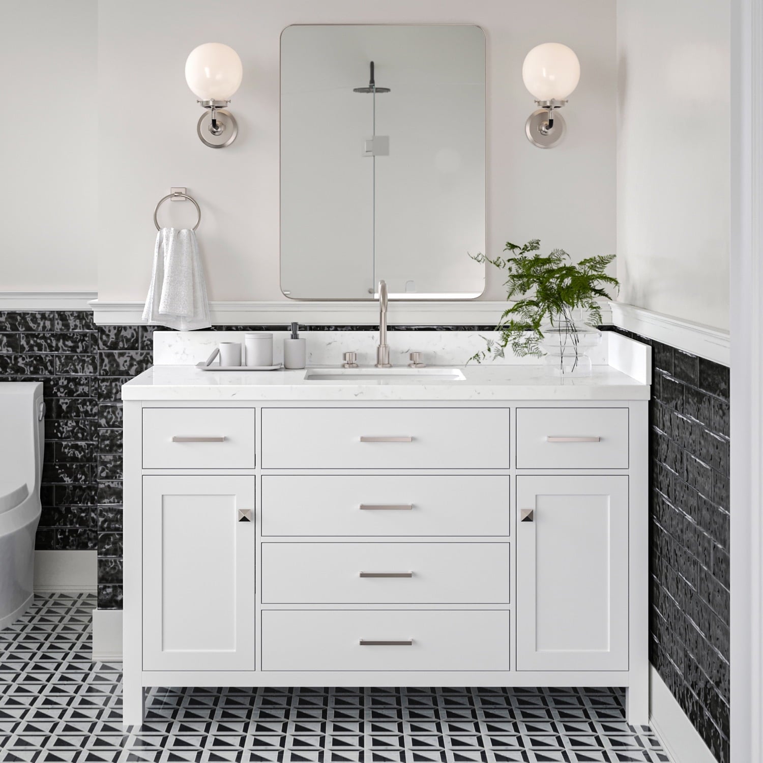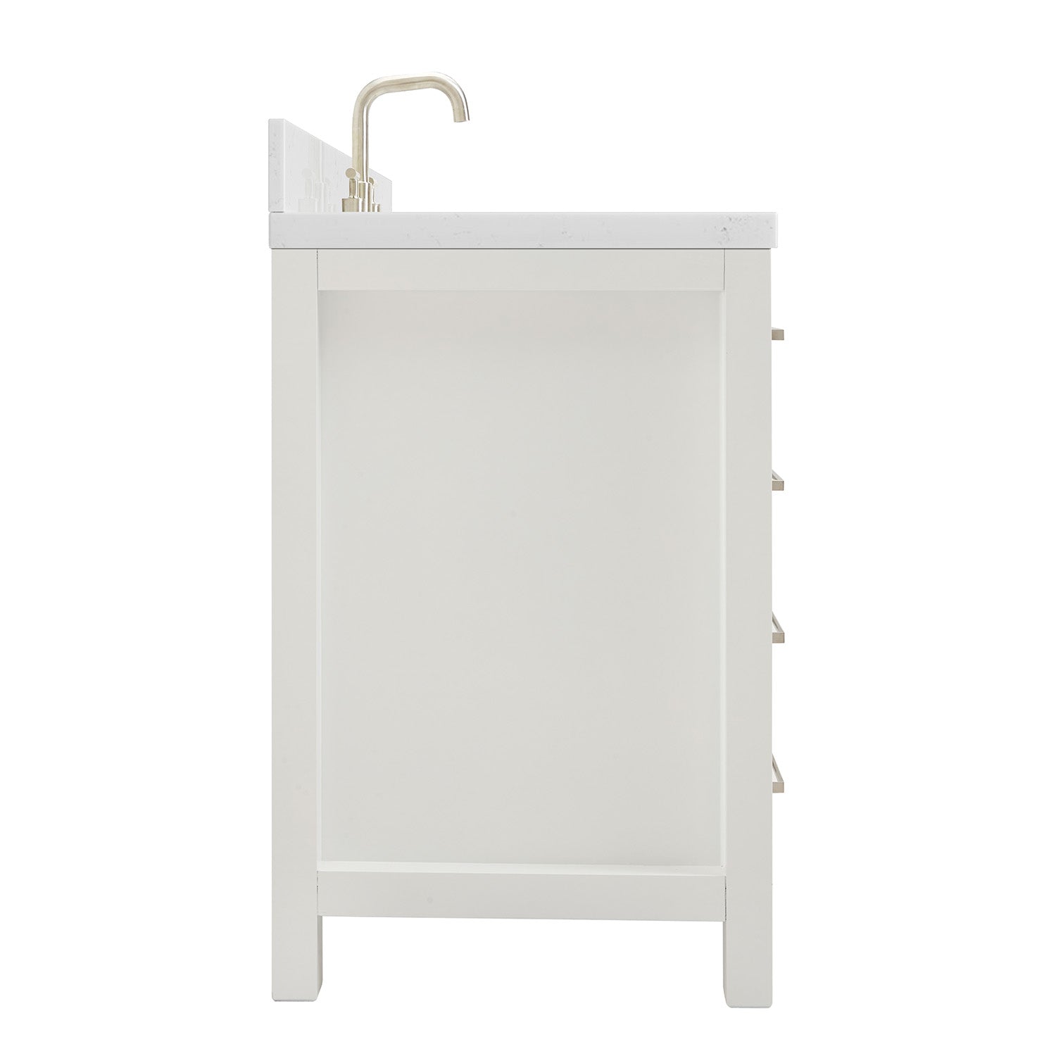 • 【Luxurious Carrara White Quartz Countertop】Featuring a double-polished, 1.5-inch mitered edge Carrara white quartz countertop, this vanity combines elegance with enduring quality. The countertop is non-porous, sealed for maximum moisture resistance, and easy to clean—making it both stylish and practical for busy homes. A matching 4″ backsplash is included for a seamless, designer finish.