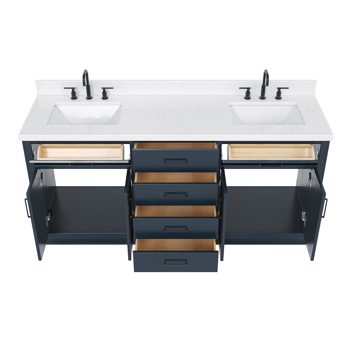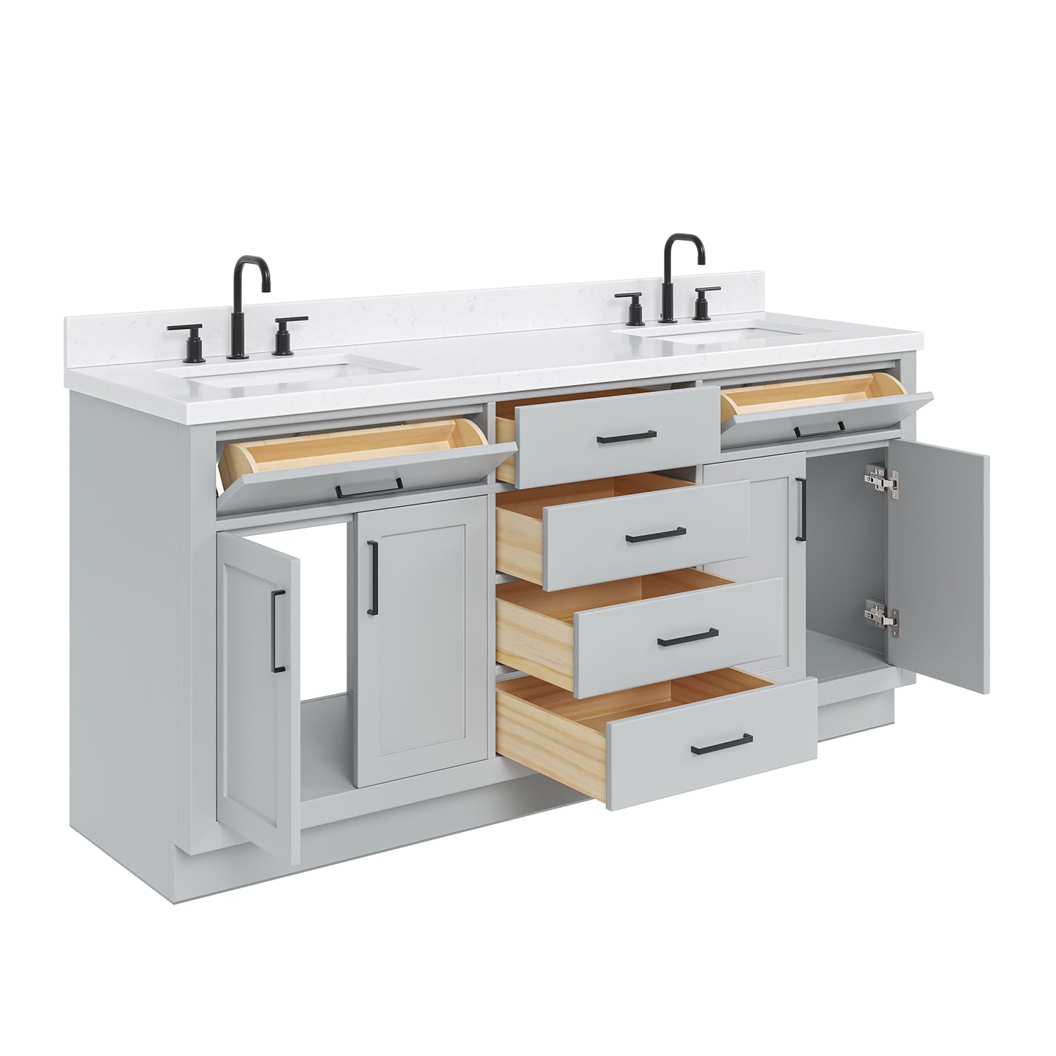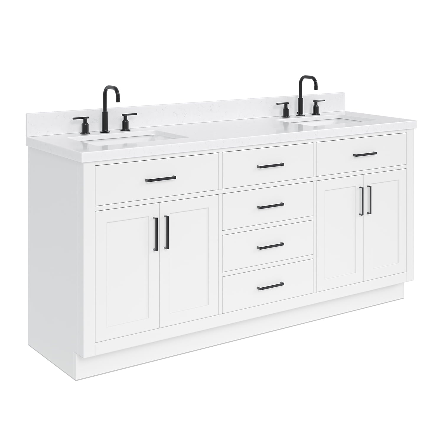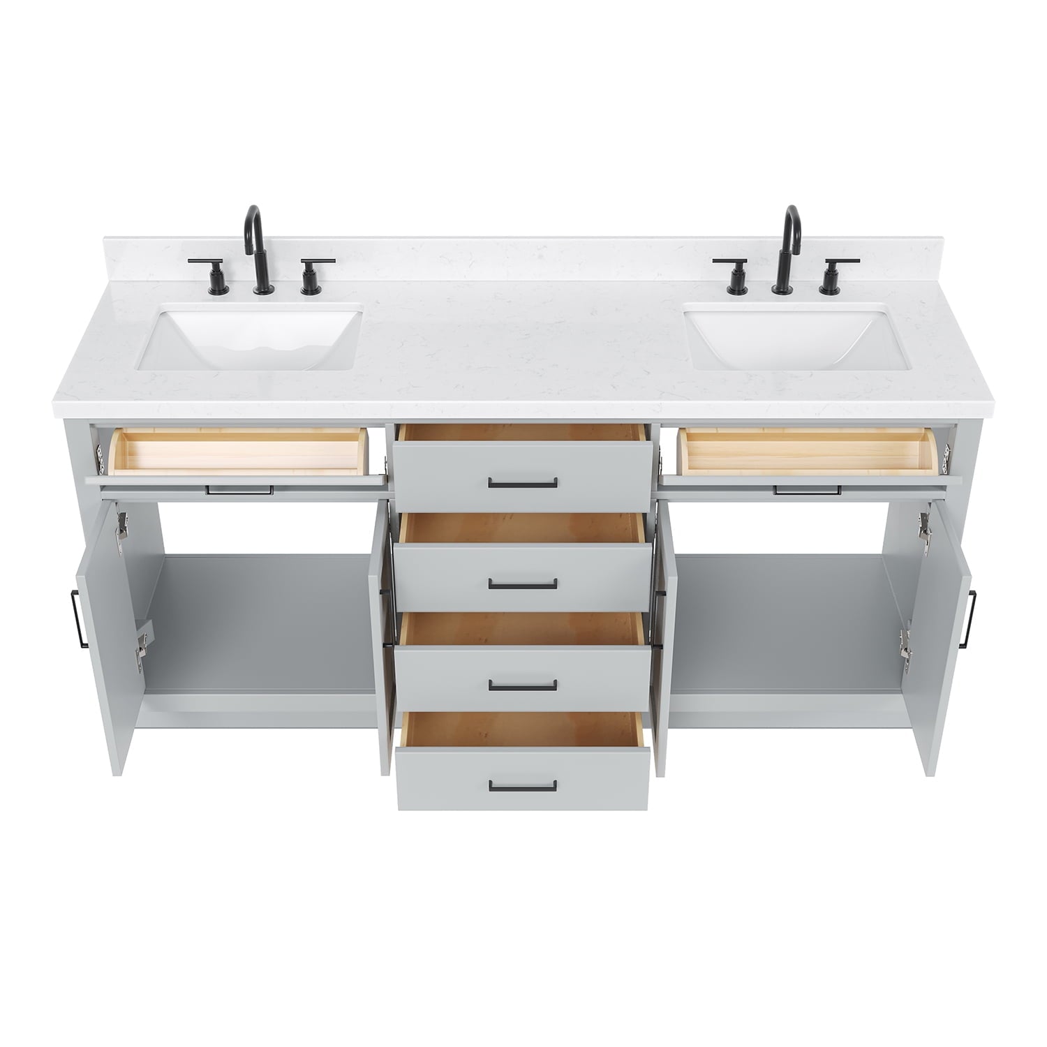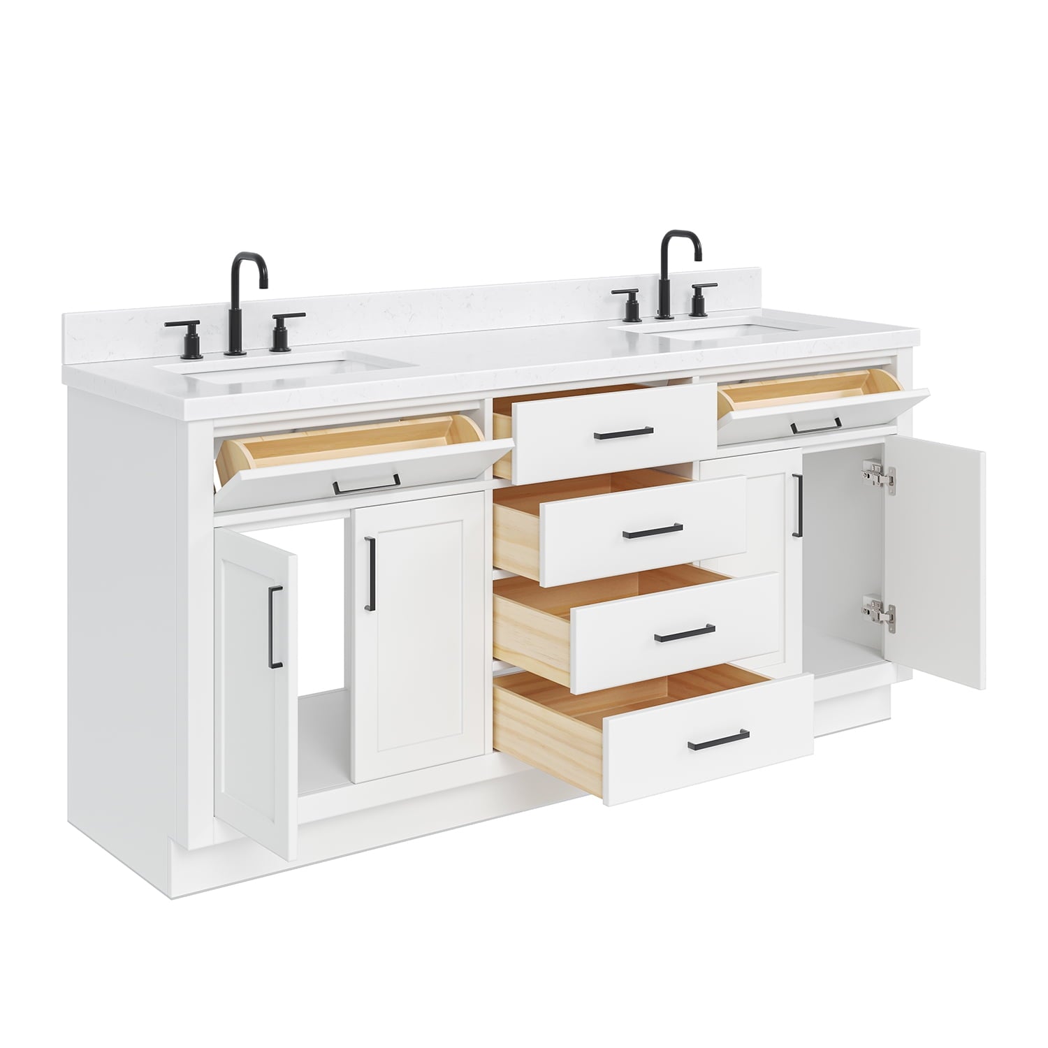 - 【Luxurious Carrara White Quartz Countertop】Featuring a double-polished, 1.5″-thick Carrara White Quartz countertop with a mitered edge, this vanity delivers enduring elegance and functionality. The non-porous surface is sealed for maximum stain and moisture resistance, while the 4″ matching backsplash protects your wall from water splashes, making maintenance effortless and preserving its pristine appearance for years.