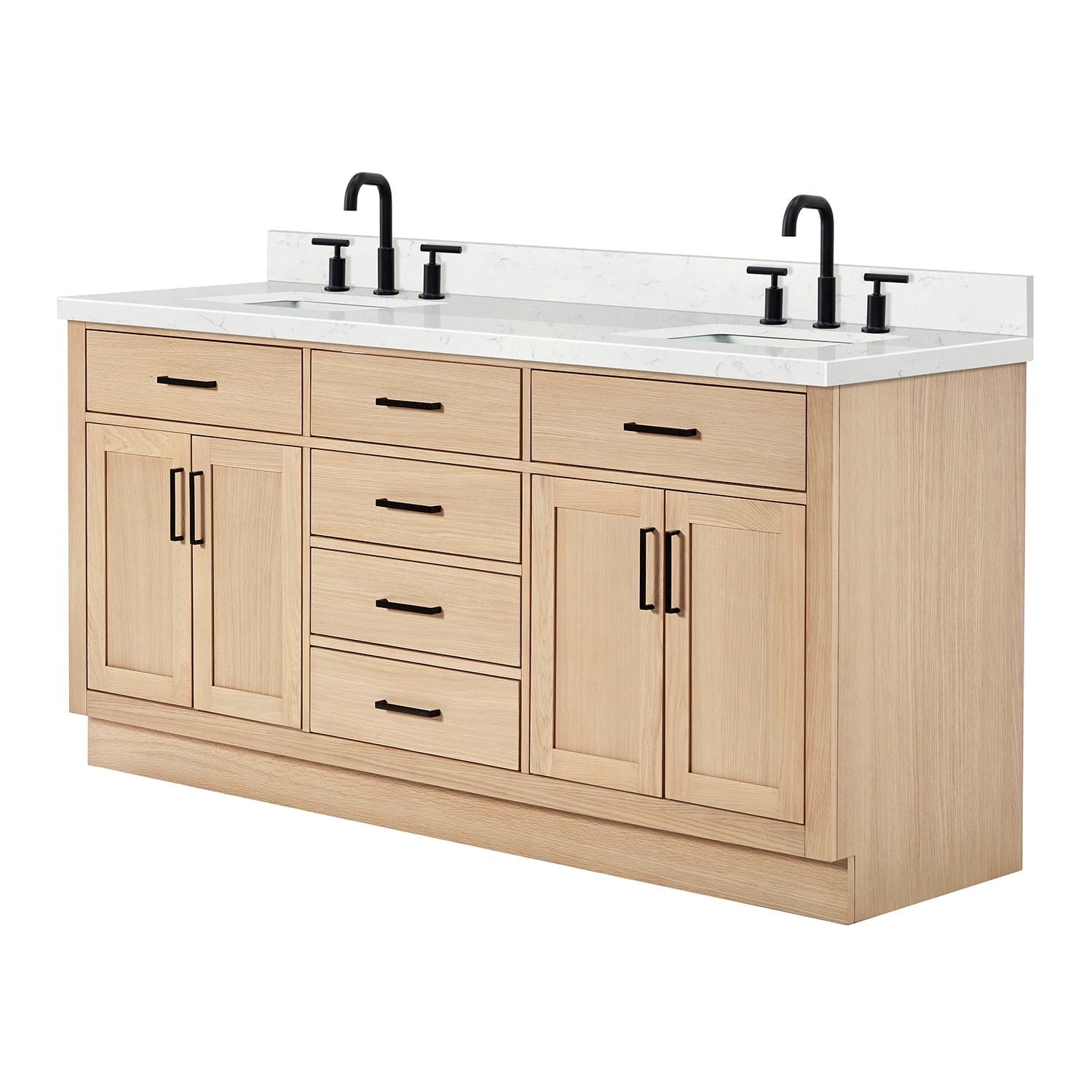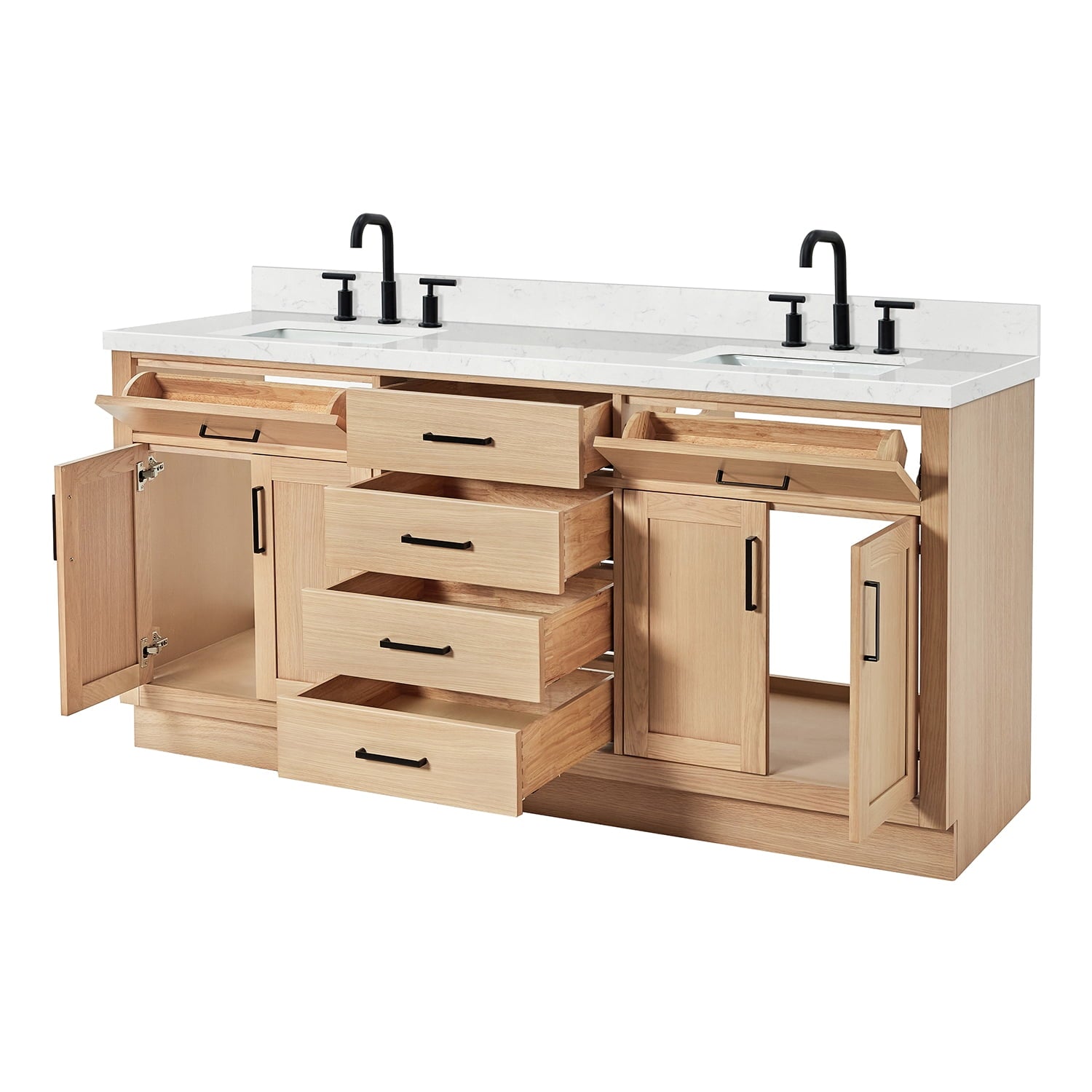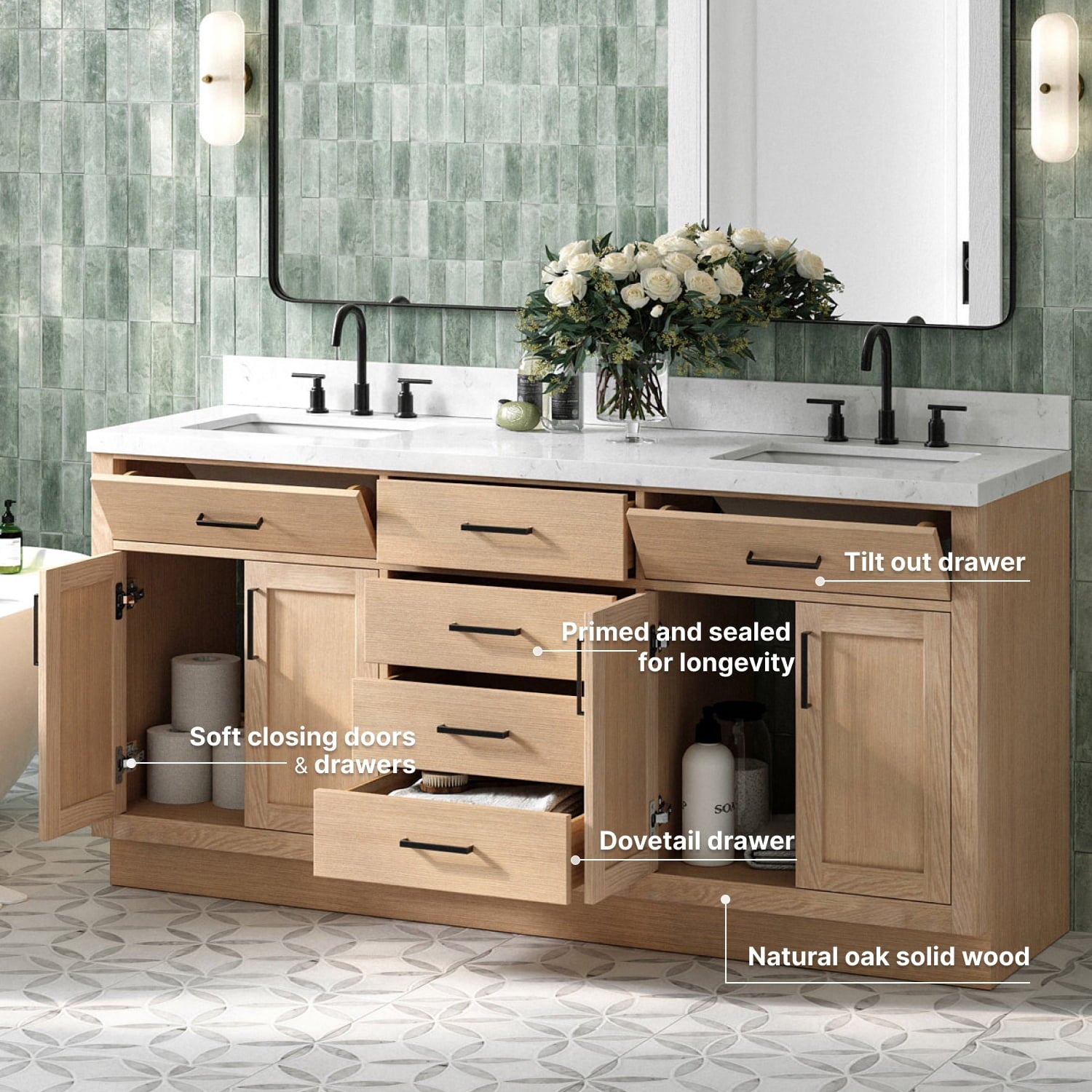 - 【Premium American Oak Craftsmanship】Expertly constructed from genuine American Oak with an elegant Oak Veneer, the ARIEL Hepburn 72 Inch Double Sink Vanity combines strength and sophisticated style. The natural wood grain creates a cohesive, elevated look, with every oak board hand-selected to ensure minimal color variance and a superior grain pattern. No MDF, dowels, or staples are used, offering unmatched durability and long-lasting beauty for your bathroom.