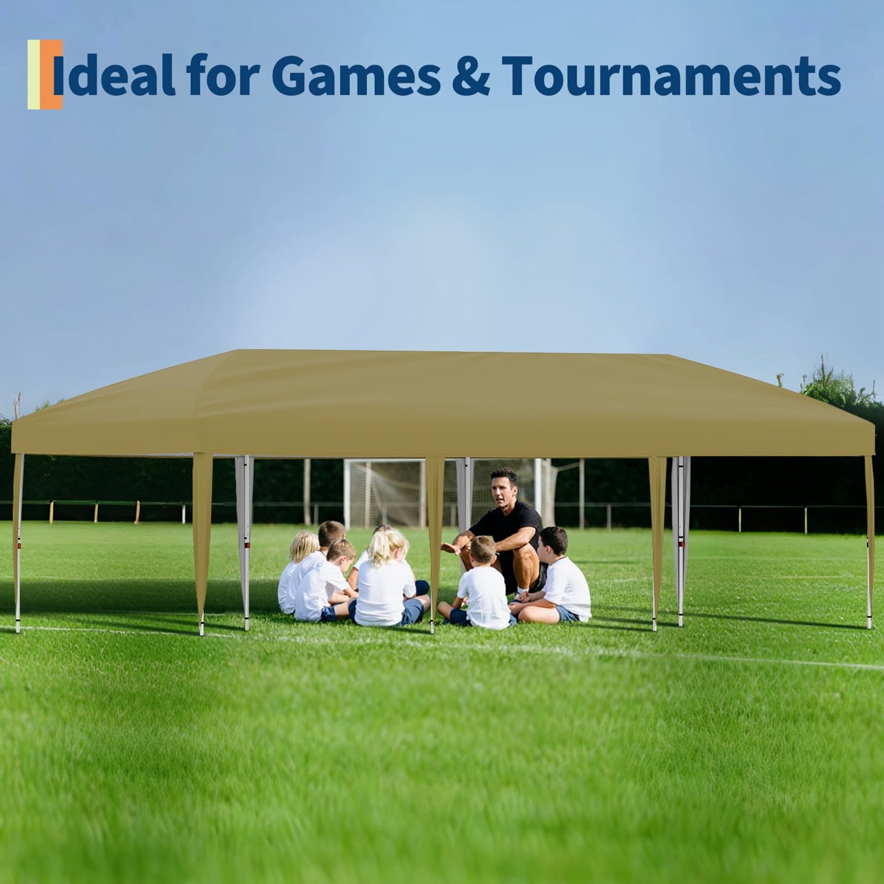 - Offers ample shade for up to 30 people with no overhead crossbars, improving headroom and comfort