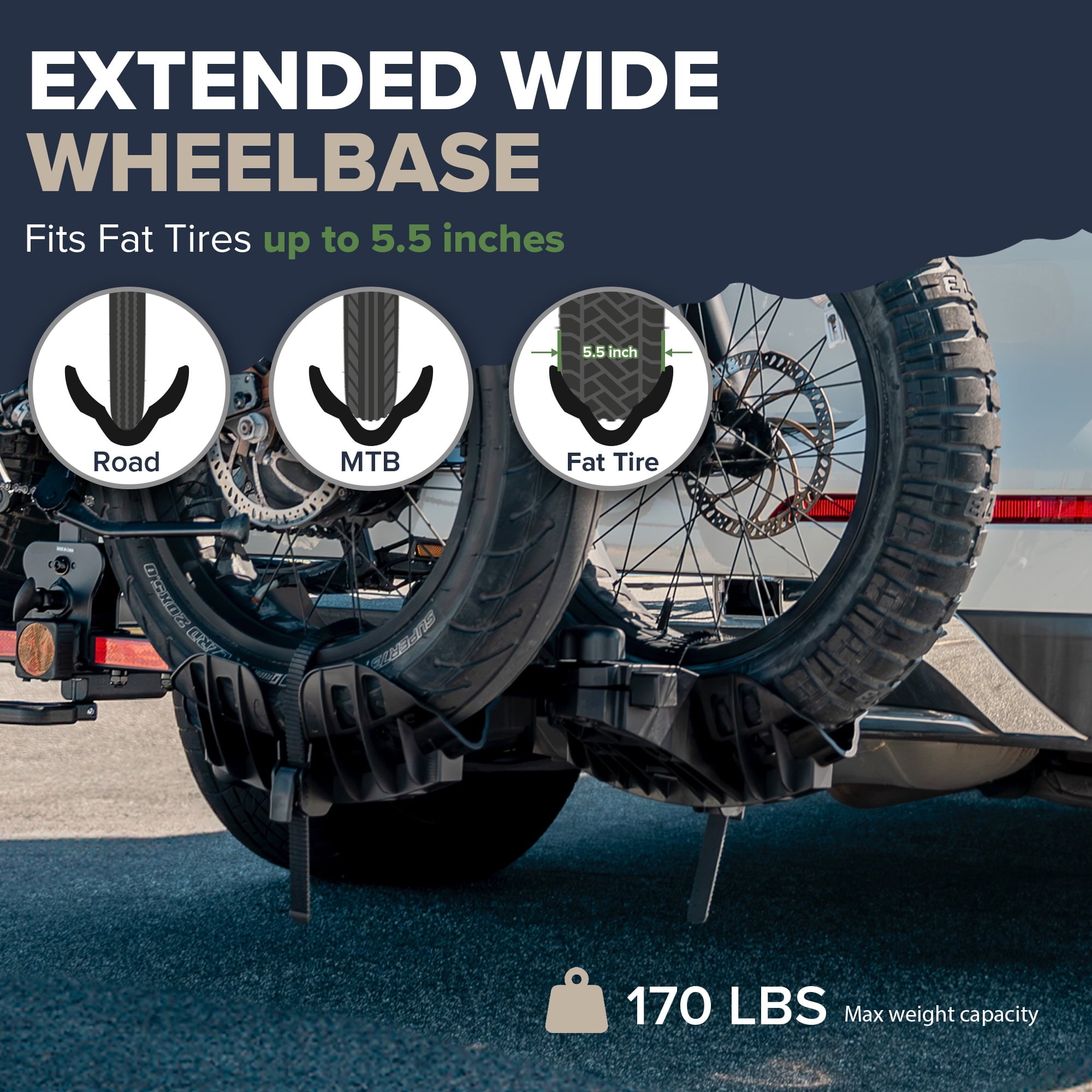 - Fits both narrow and wide bike tires, up to 5.5″ in width & wheelbases up to 49″.