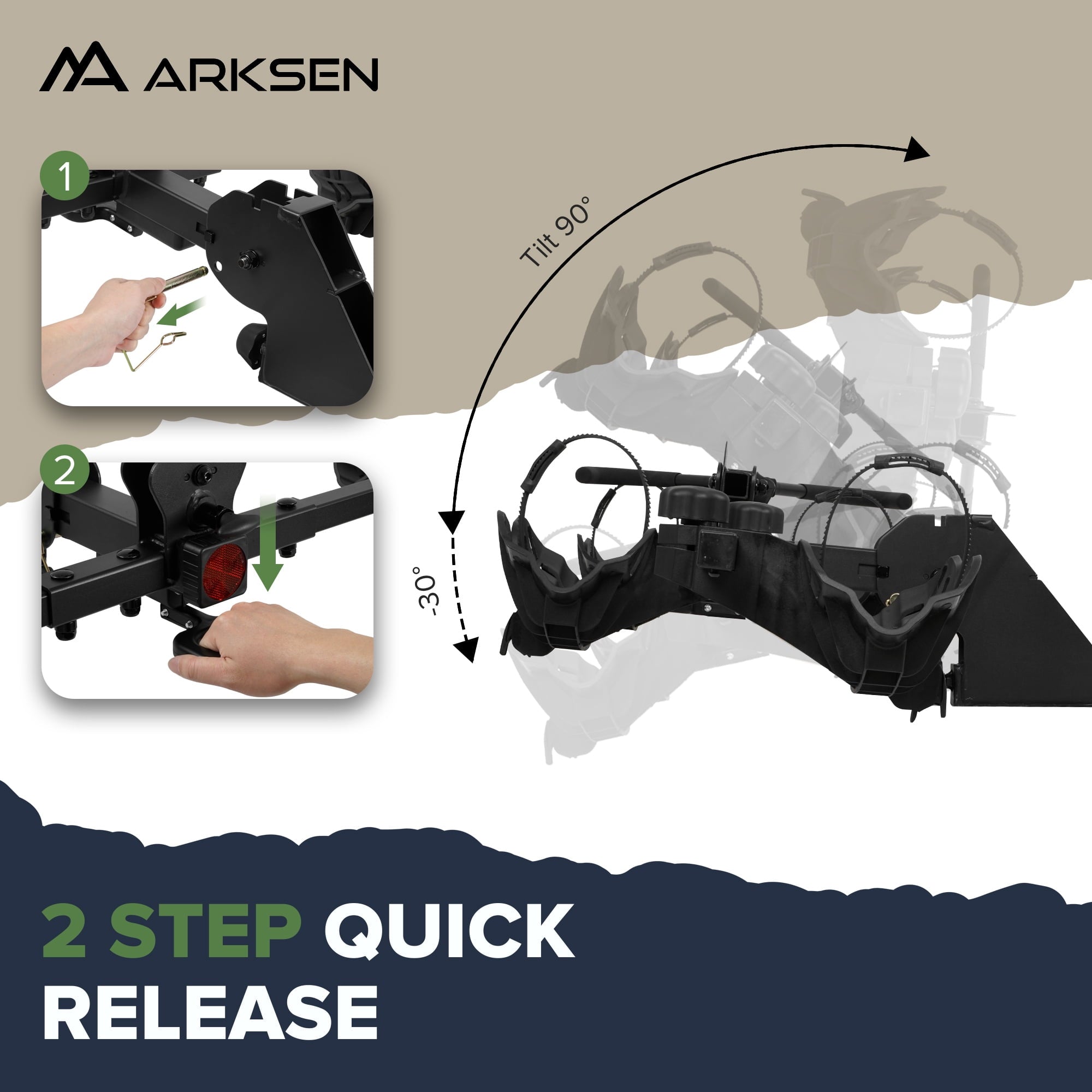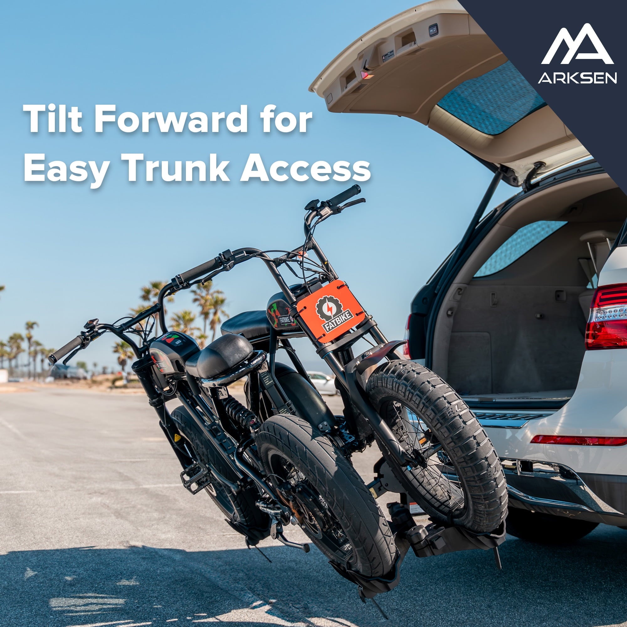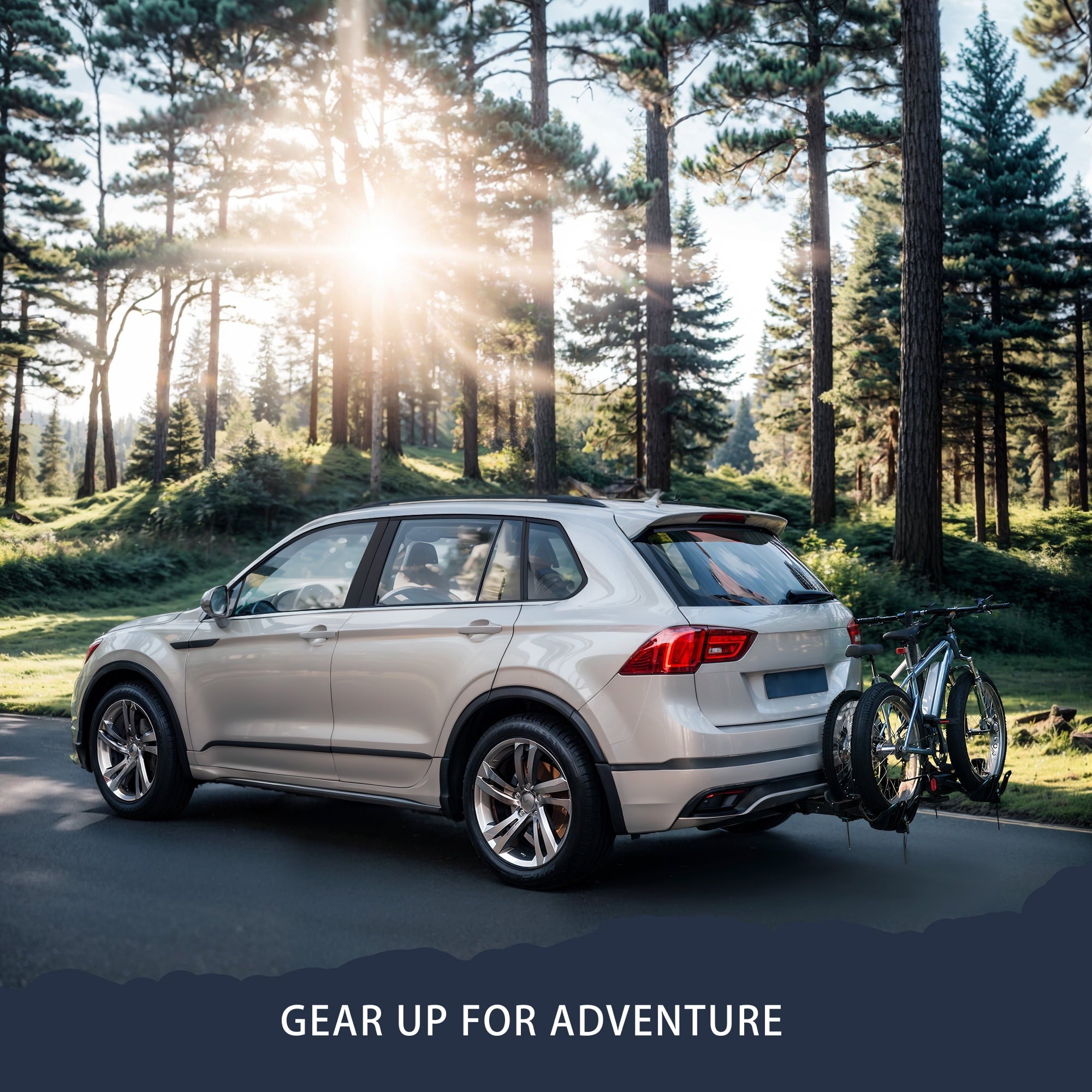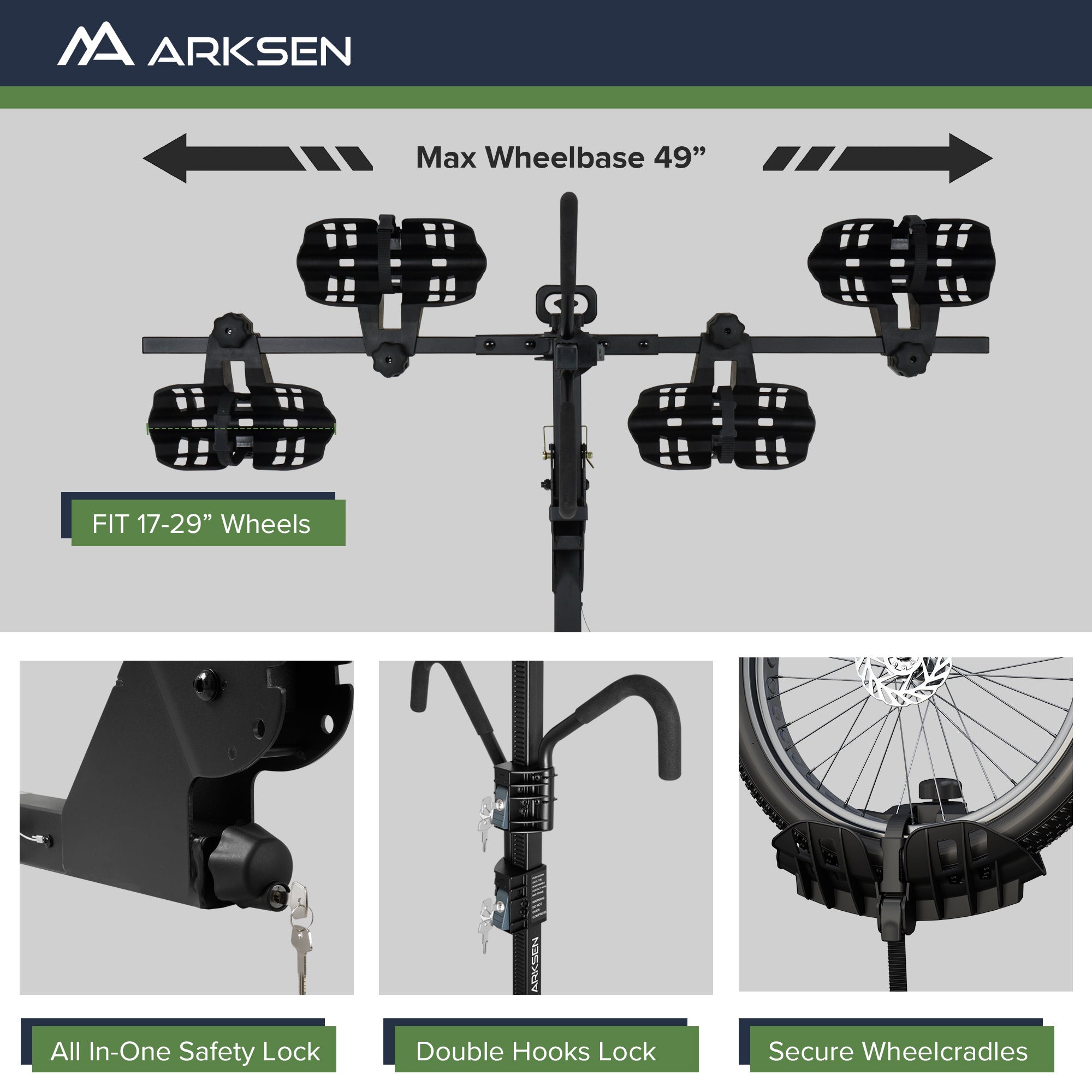 Embark on your next electric biking adventure with our ARKSEN foldable heavy-duty bike rack. Designed for 2-inch tow hitches, it offers newfound freedom to transport your E-bike or regular bicycle effortlessly. Confidently secure your bikes with adjustable wheel holders and a built-in anti-wobble system. The padded hook fasteners ensure a tight fit, and everything is locked in place with ergonomic handles or keys. Experience convenience with its tilting feature and quick-release handle, making post-ride errands a breeze. Expand your active lifestyle and seize new opportunities with this versatile bike rack. Order yours today and discover the joy of taking your favorite electric bikes anywhere!