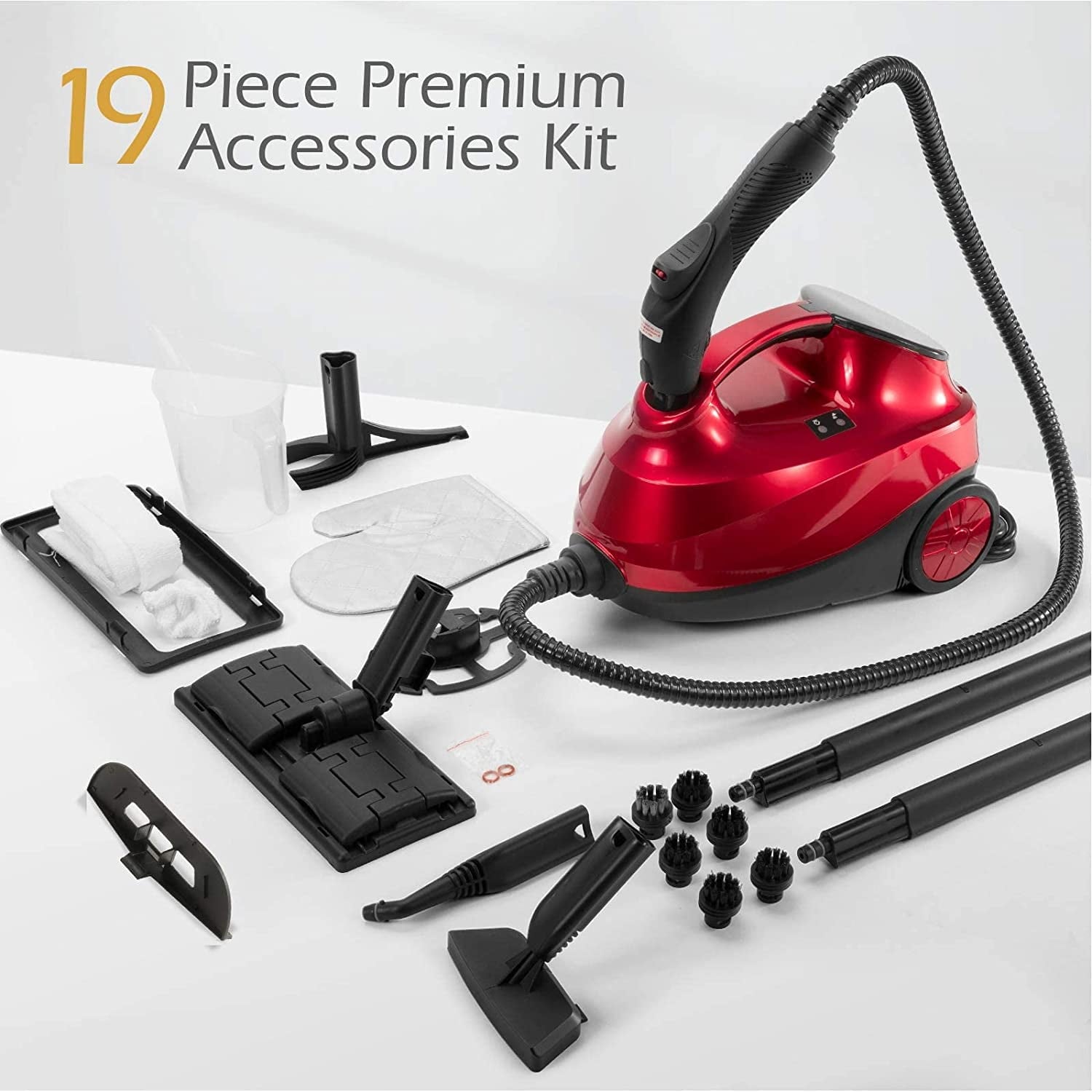 - [19 Versatile Accessories]: The portable steam cleaner includes 19 different accessories such as a glove, measuring cup, 2 extension tubes, ironing brush, glass brushing, big nozzle, and so on, widely used in kids’ toy, pet mattress, sofa, curtains. Meanwhile, the steam cleaning machine is served as iron to smooth the wrinkles of clothes.
