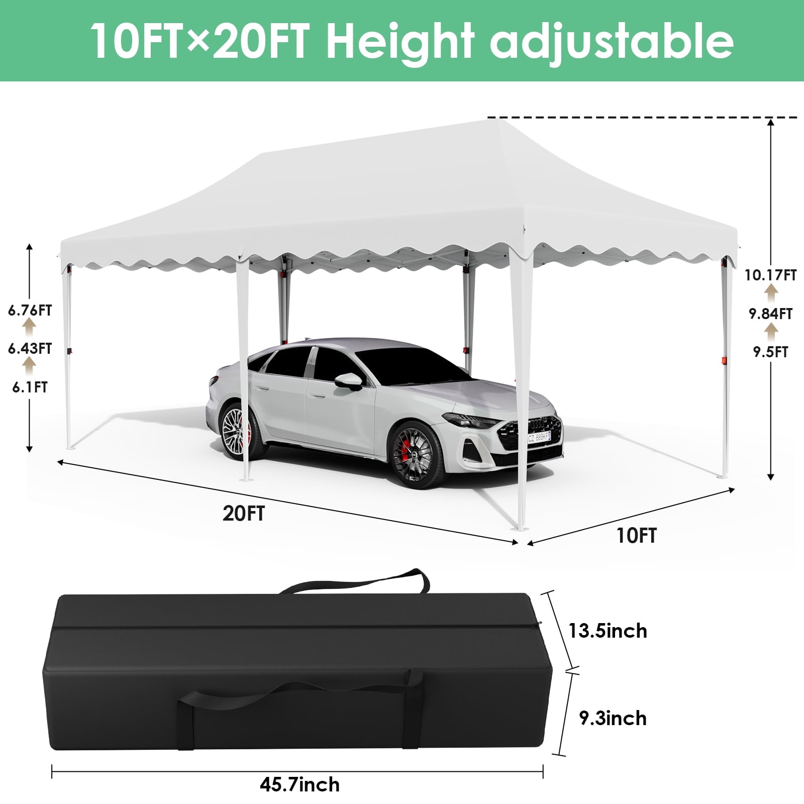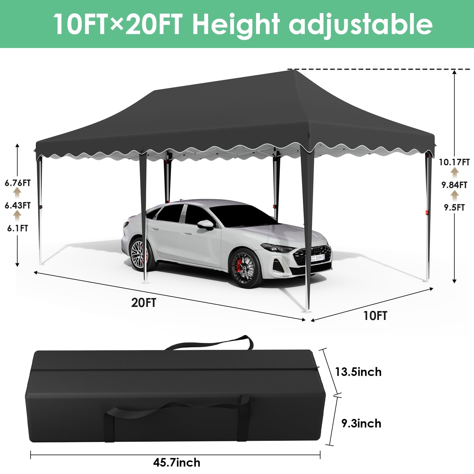 Measuring an expansive 10×20 feet, this large tent is ideal for various events, whether you need a carport or an activity tent for weekend gatherings, weddings, or commercial vendor setups.
