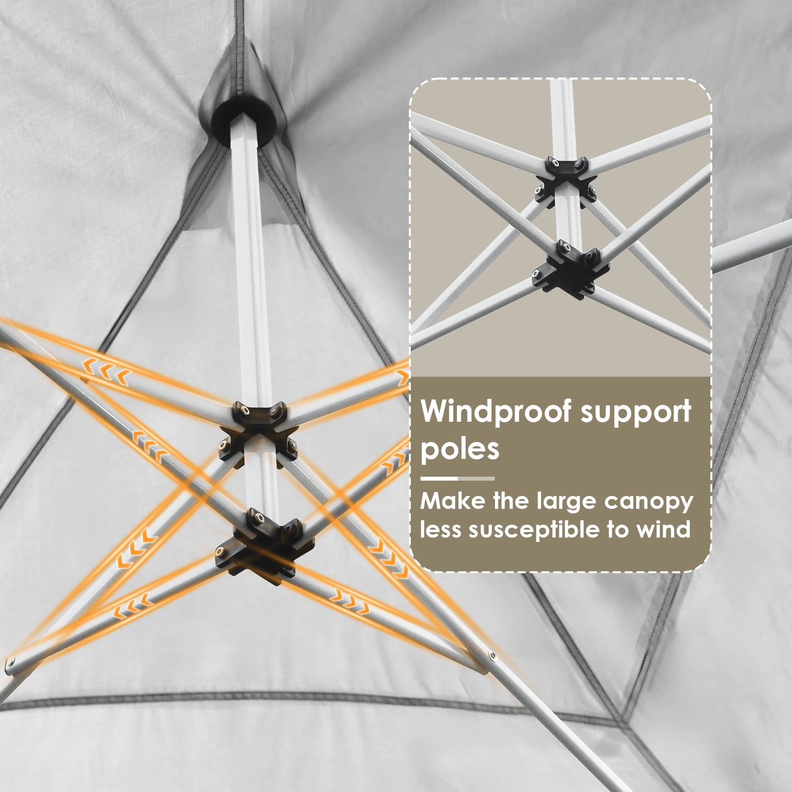 • Arlopu 10×20 pop up canopy tent features an upgraded frame. When supported, three center roofs automatically extend upwards, enhancing support for the top fabric. The truss junctions have thickened plastic parts, and the powder – treated brackets ensure durability. To boost stability, 6 windproof ropes, 12 steel stakes, and 6 sandbags are included.