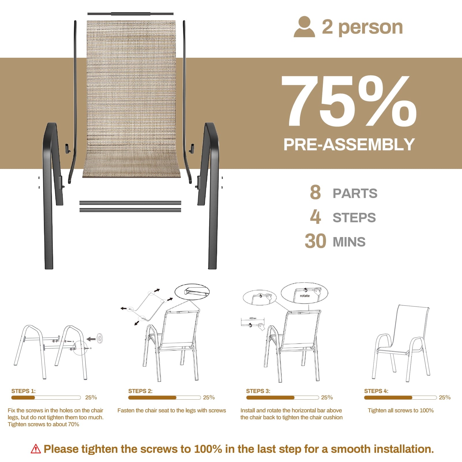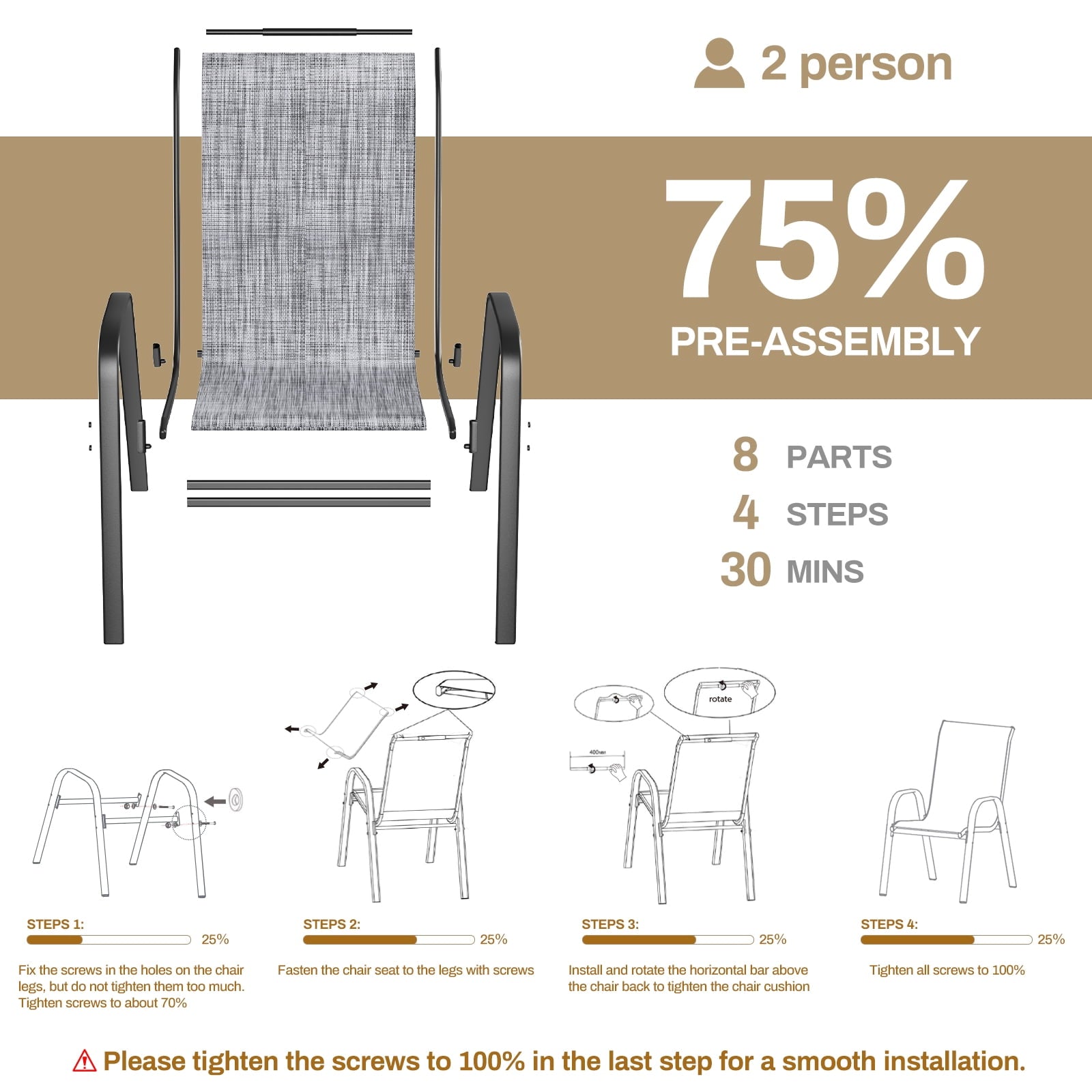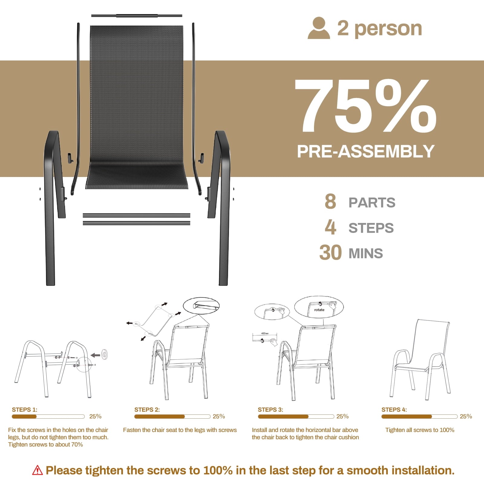 Arlopu 8 pcs patio stackable chairs come with breathable, quick-drying mesh fabric, which is ideal for spring, summer and fall. It’s a great patio funiture set for you to relax and enjoy the outdoor time with family and friends. Outdoor dining chairs can be stackable to save space when not in use. If there is any problem, such as missing parts or damaged, please feel free to contact us.