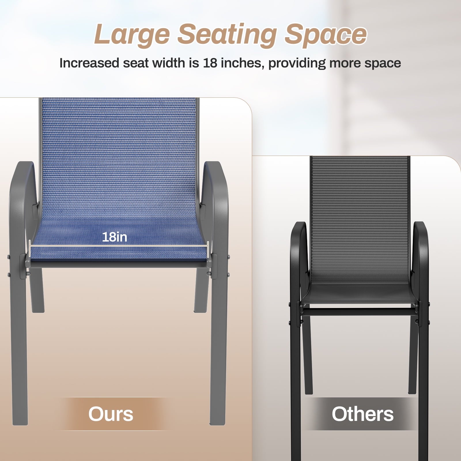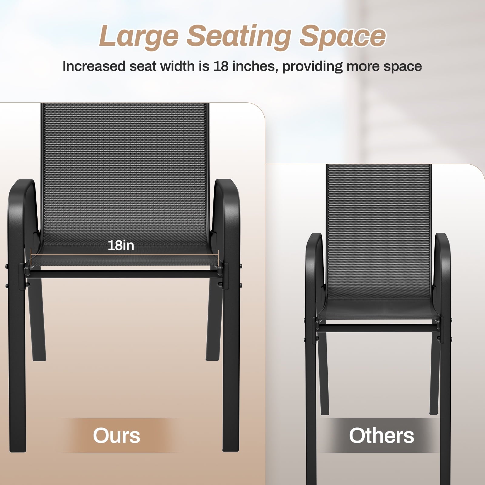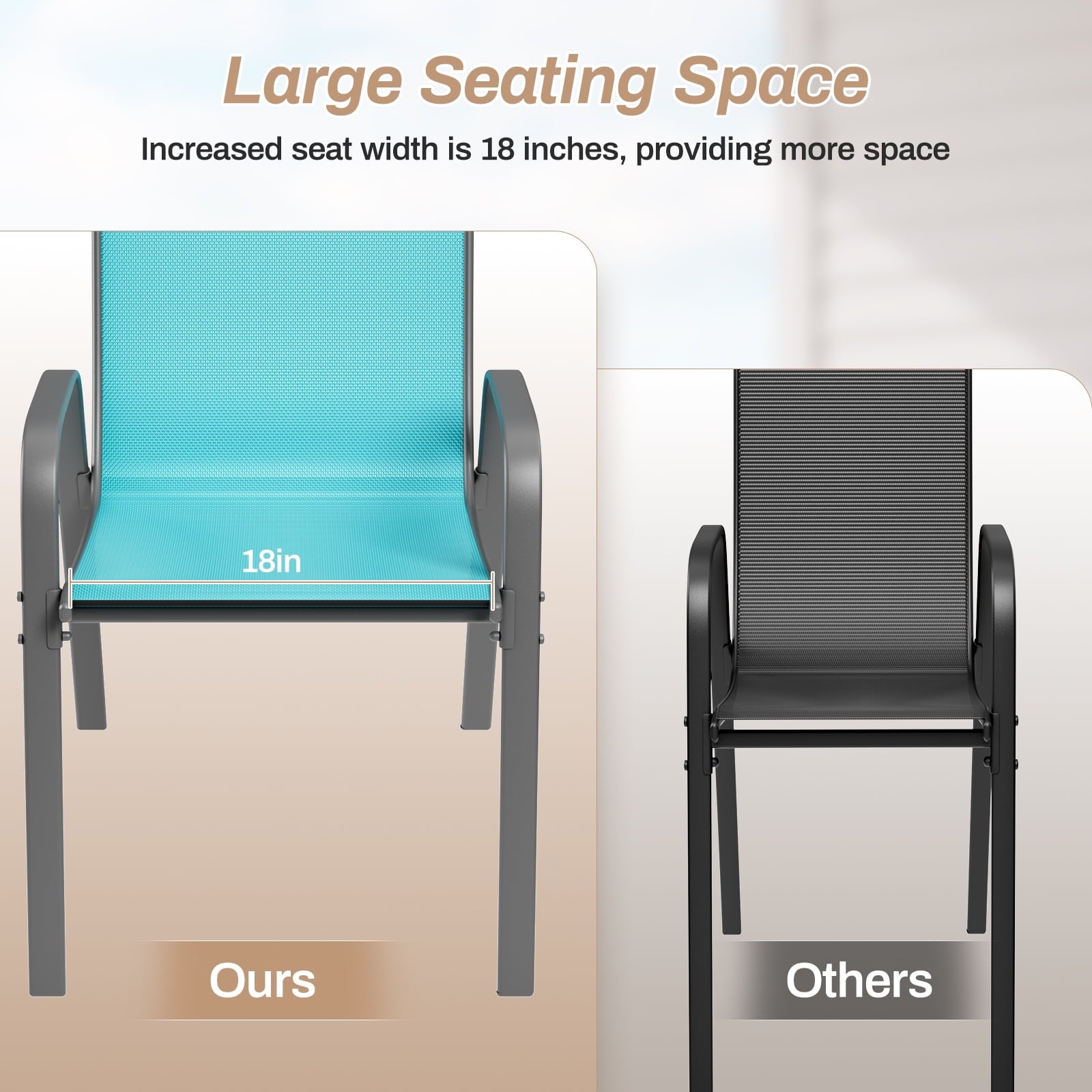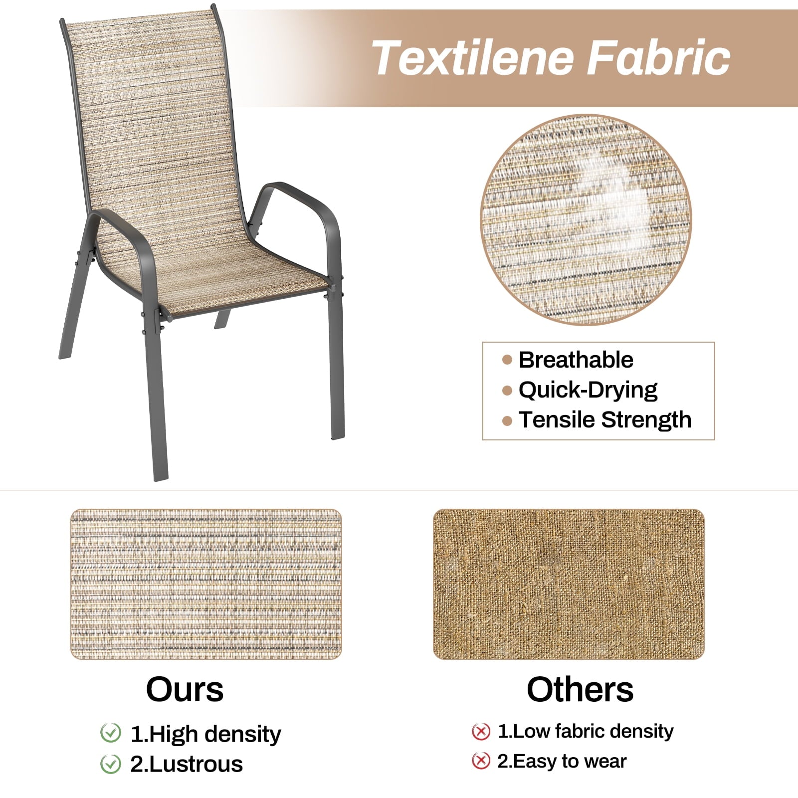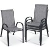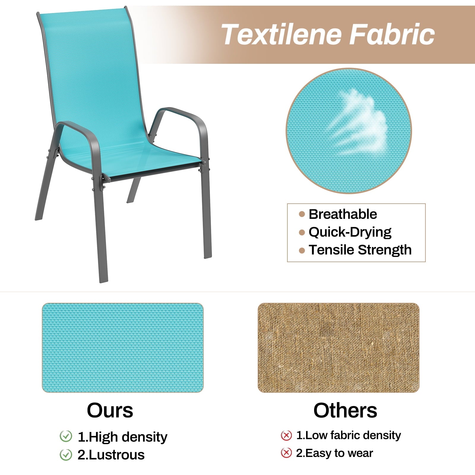 - Stackable patio chair is made of textilene fabric, which has excellent breathability and quick-drying characteristics. You won’t feel stuffy even if you sit in the chair for a long time. In addition, this fabric is tear-resistant and has a longer service life.