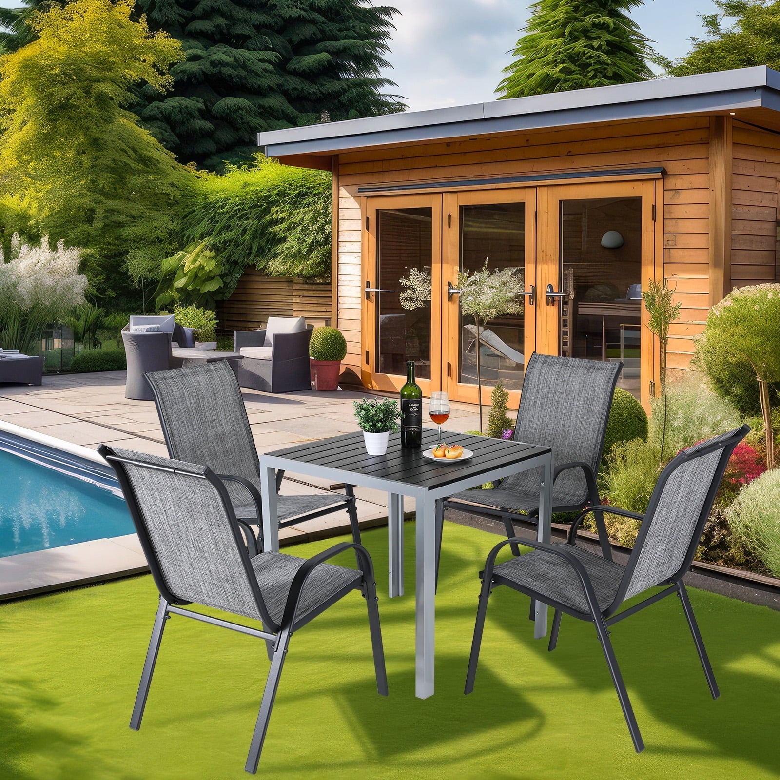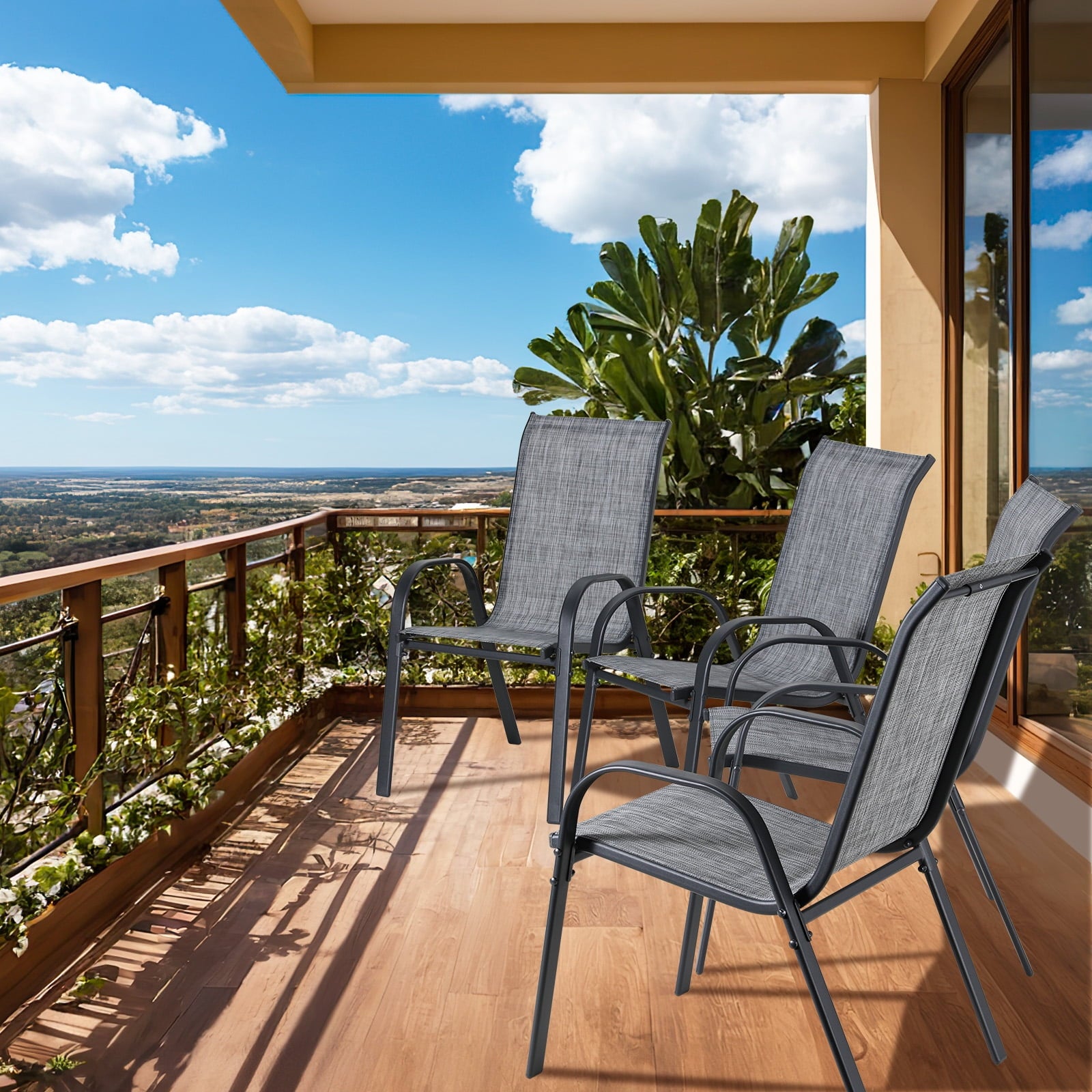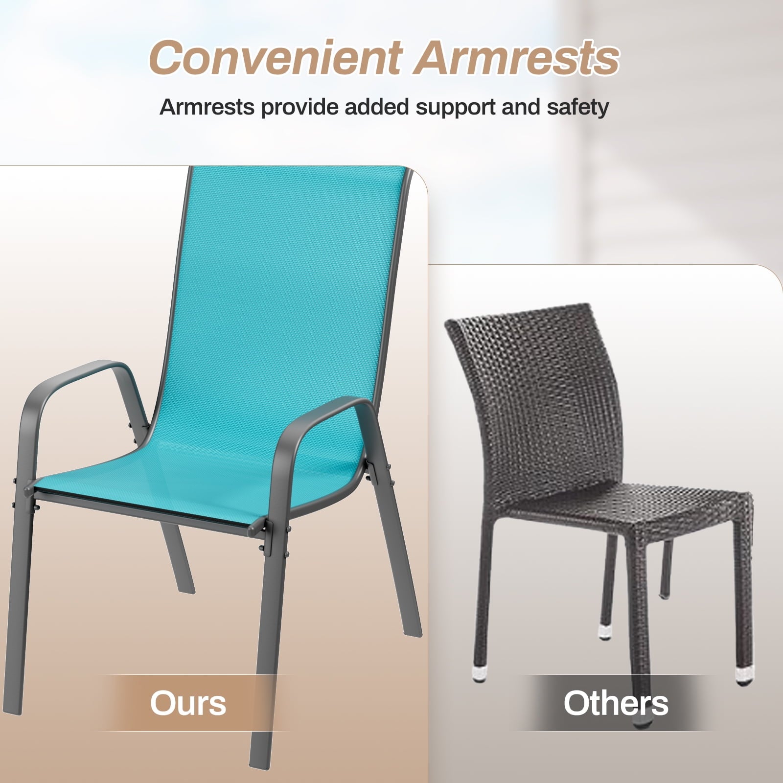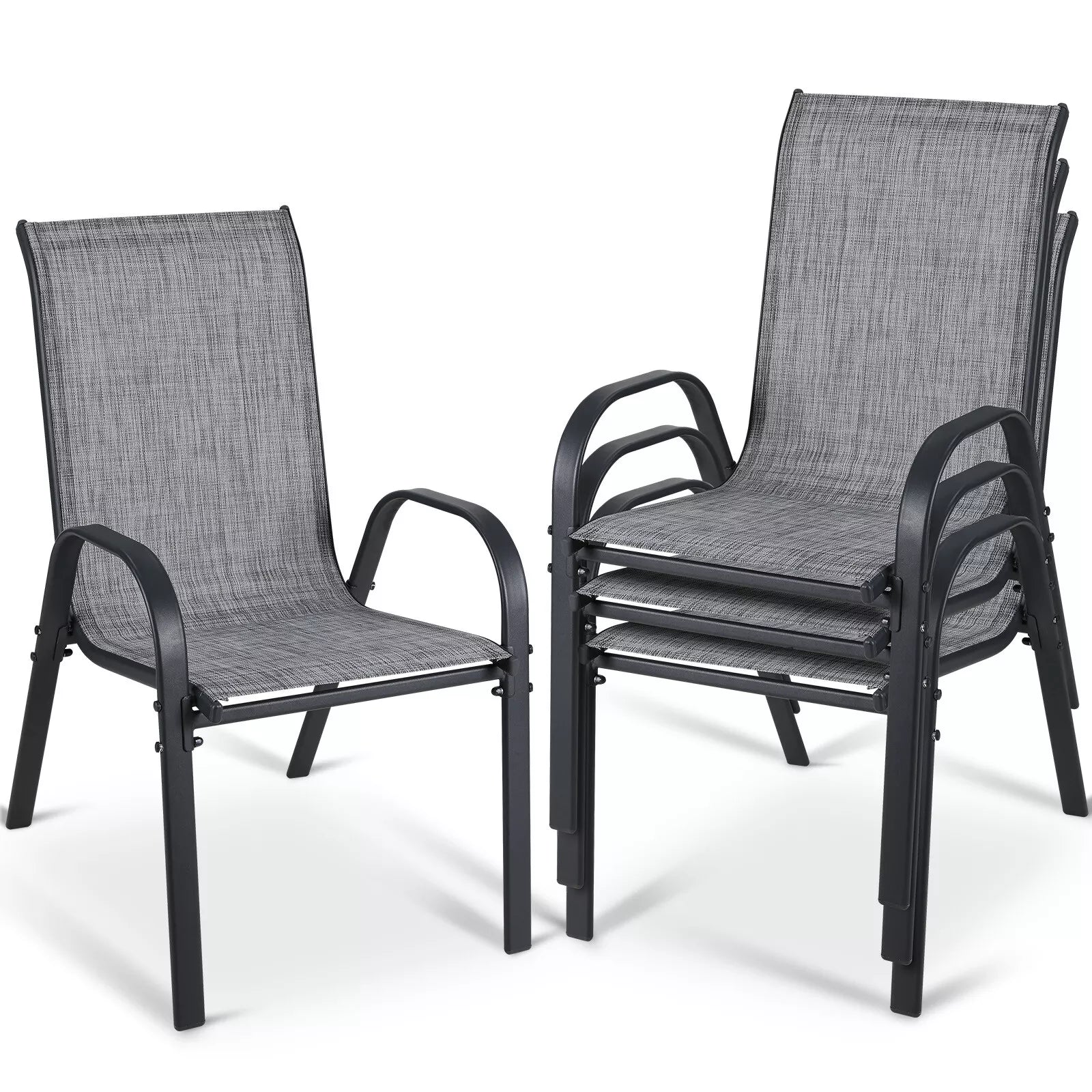 - Arlopu patio chair adopts a stackable style design, and eight chairs can be completely stacked together to save you more space. Lightweight design allows you to easily transport it to other places. It can be quickly put away when not in use.