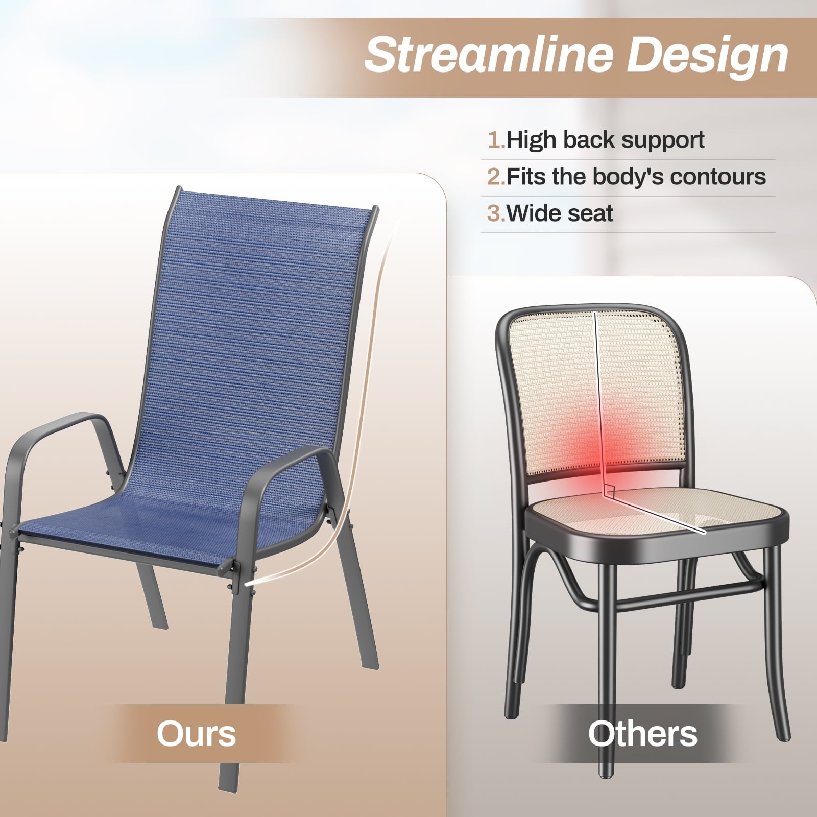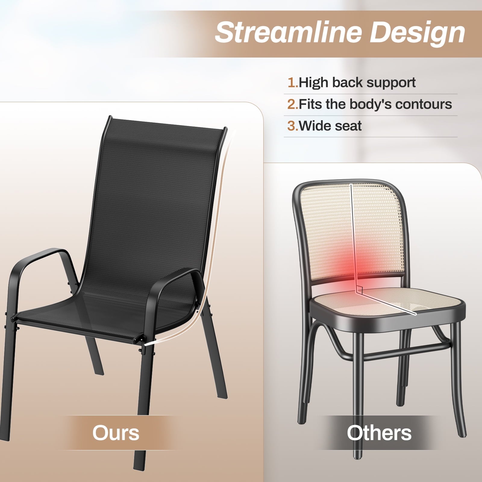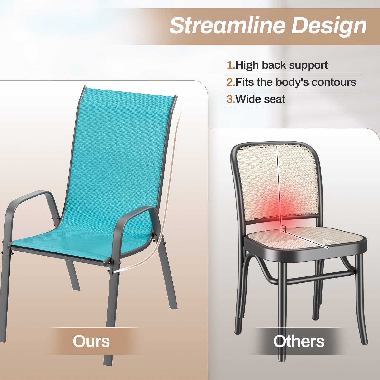 - Patio dining chairs have ergonomic backrests. Backrest has a certain arc to provide sufficient support for the back and waist. Curved armrests fit the curves of human arms, further improving comfort. Slightly sunken seat makes you more relaxed while doing it.