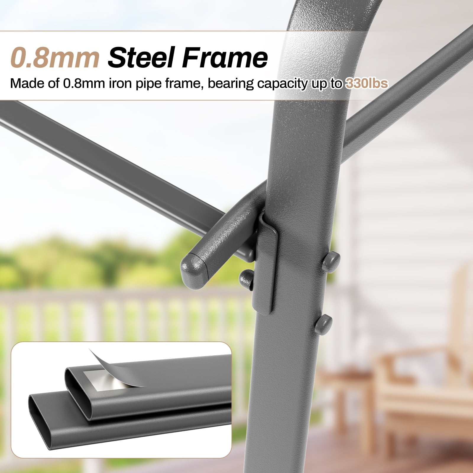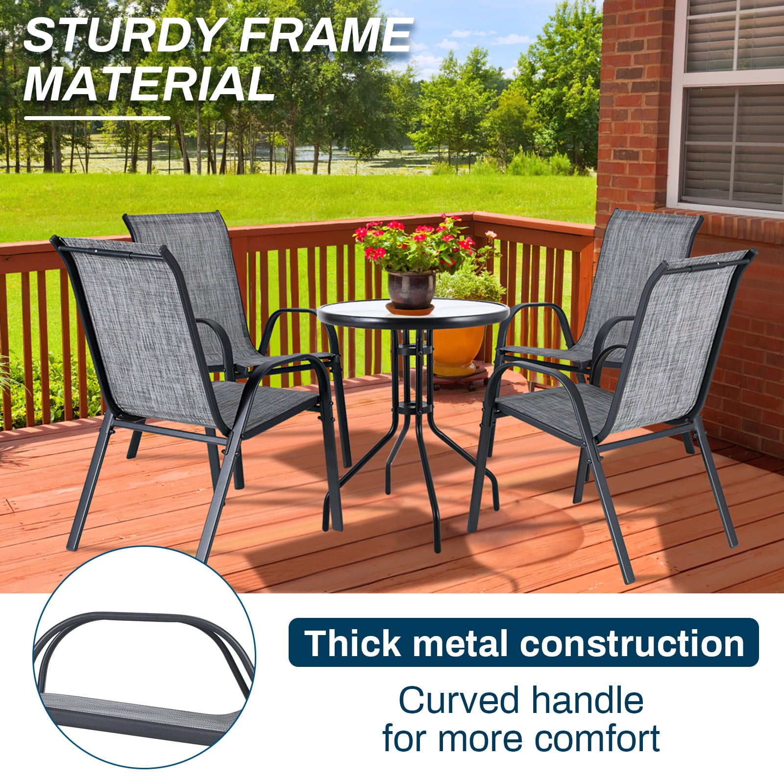 - Arlopu outdoor dining chair frame uses Upgraded Chair Feet W/Strenthened Iron Spacers. It is powder-coated for durability. Each chair can bear 330 LBS. Tilt of the back legs with ground can effectively improve stability. Suitable for various indoor or outdoor uses such as poolside, backyard, garden, deck, front porch, etc.