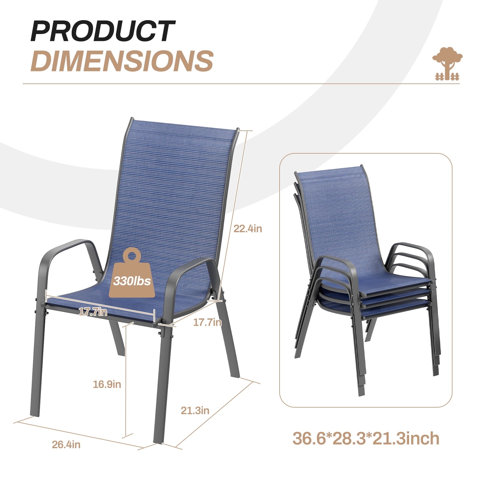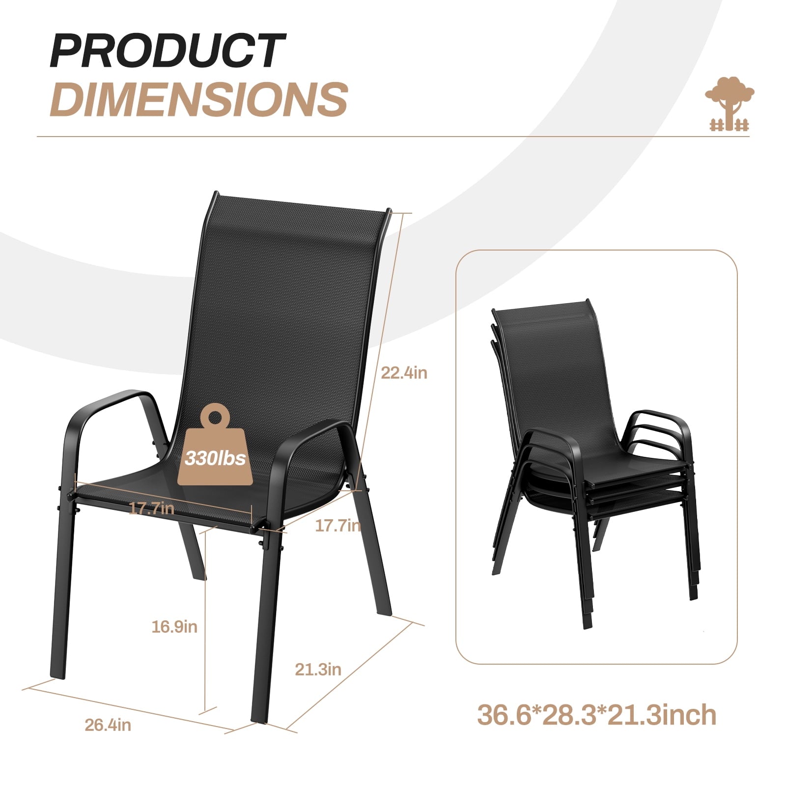 - 8pcs patio chairs have a simple structure and require few accessories. Dimensions of each chair: 21.7” L x 26.2” W x 36.8” H. Seat height: 17.1”.