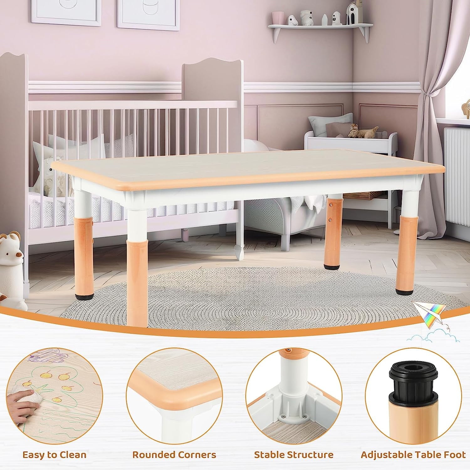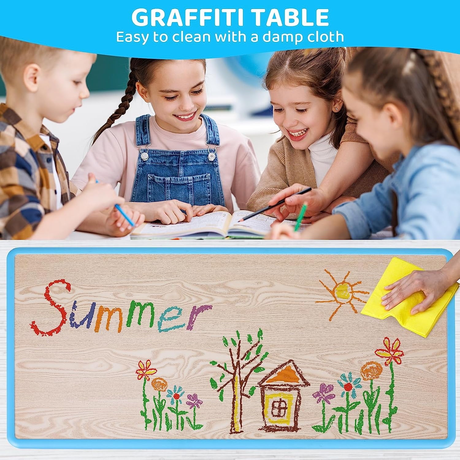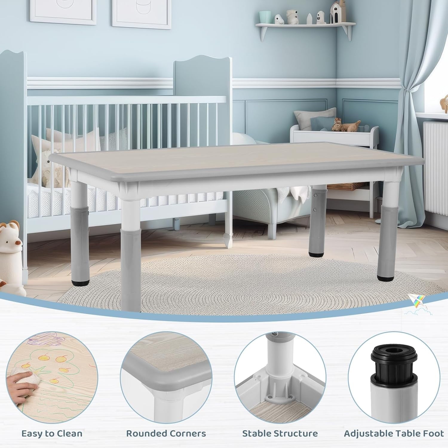 - Arlopu rectangular kids table set comes with a user manual and can be assembled in under an hour. A coating of Polyurethane on the table surface makes watercolors, colored pencils, and crayons can all be easily wiped out with a damp cloth.
