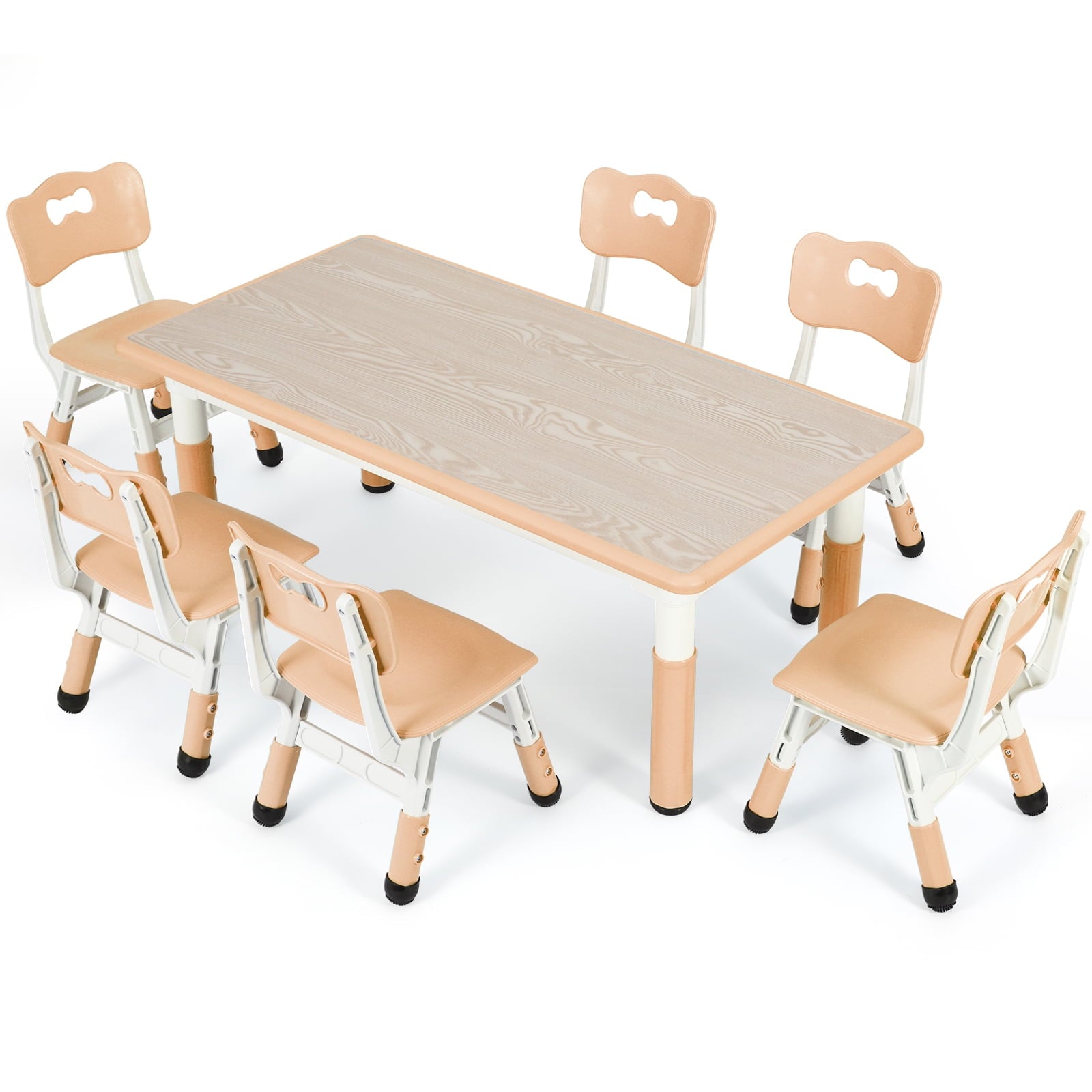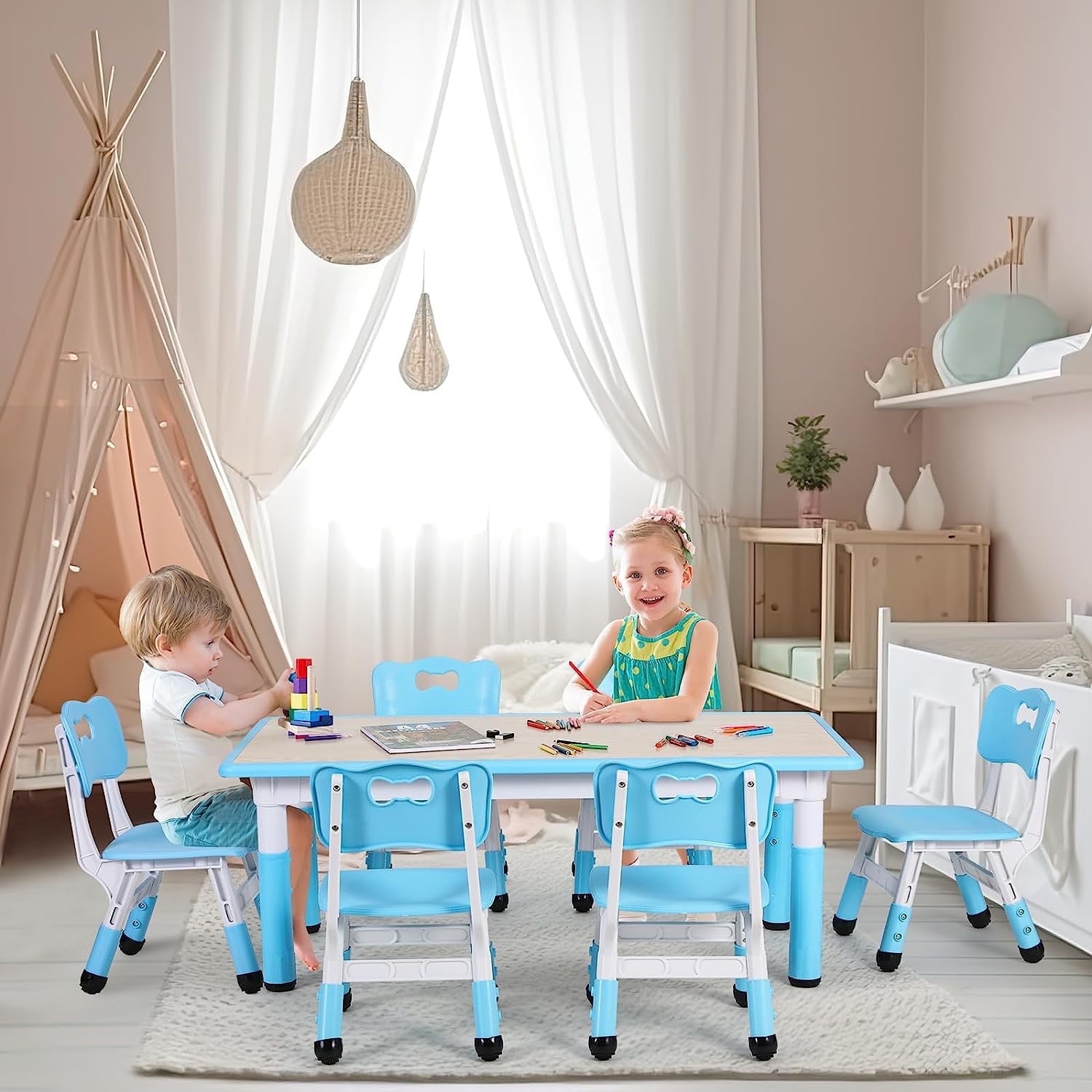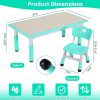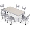 Arlopu kids table and 6 chairs set is made of non-toxic HDPE material, safe, sturdy and durable. The table surface is smooth and waterproof, your children can draw, do crafts or eat on this table set.