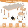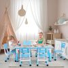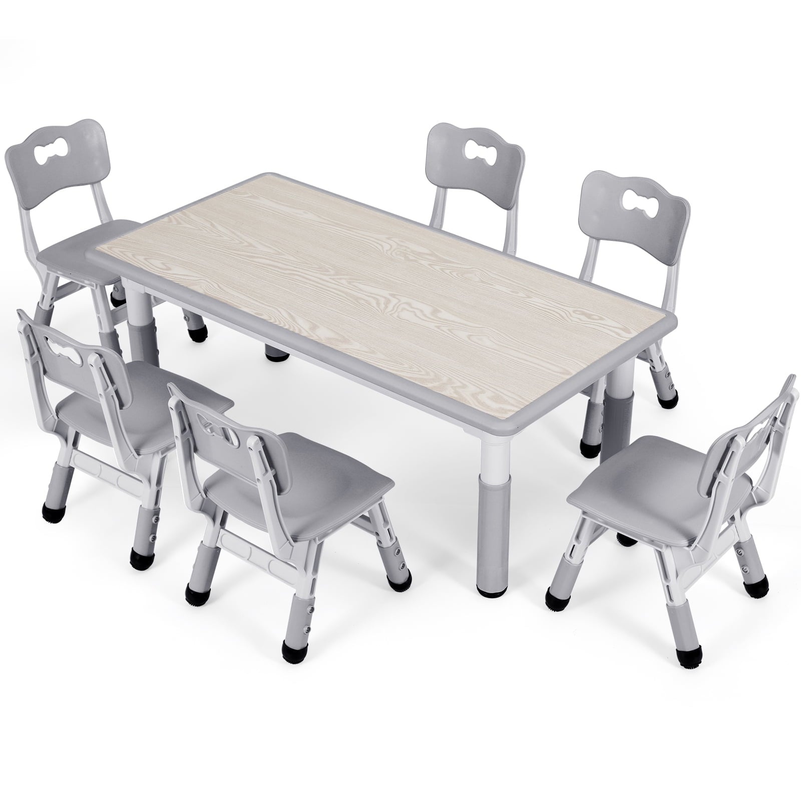 - Arlopu Kids table and 6 chairs set are height-adjustable to suit children’s growth from ages 2-10. The table has five height levels ranging from 18.9 to 23.6 inches, while the chairs have three levels ranging from 20.8 to 22.4 inches.