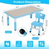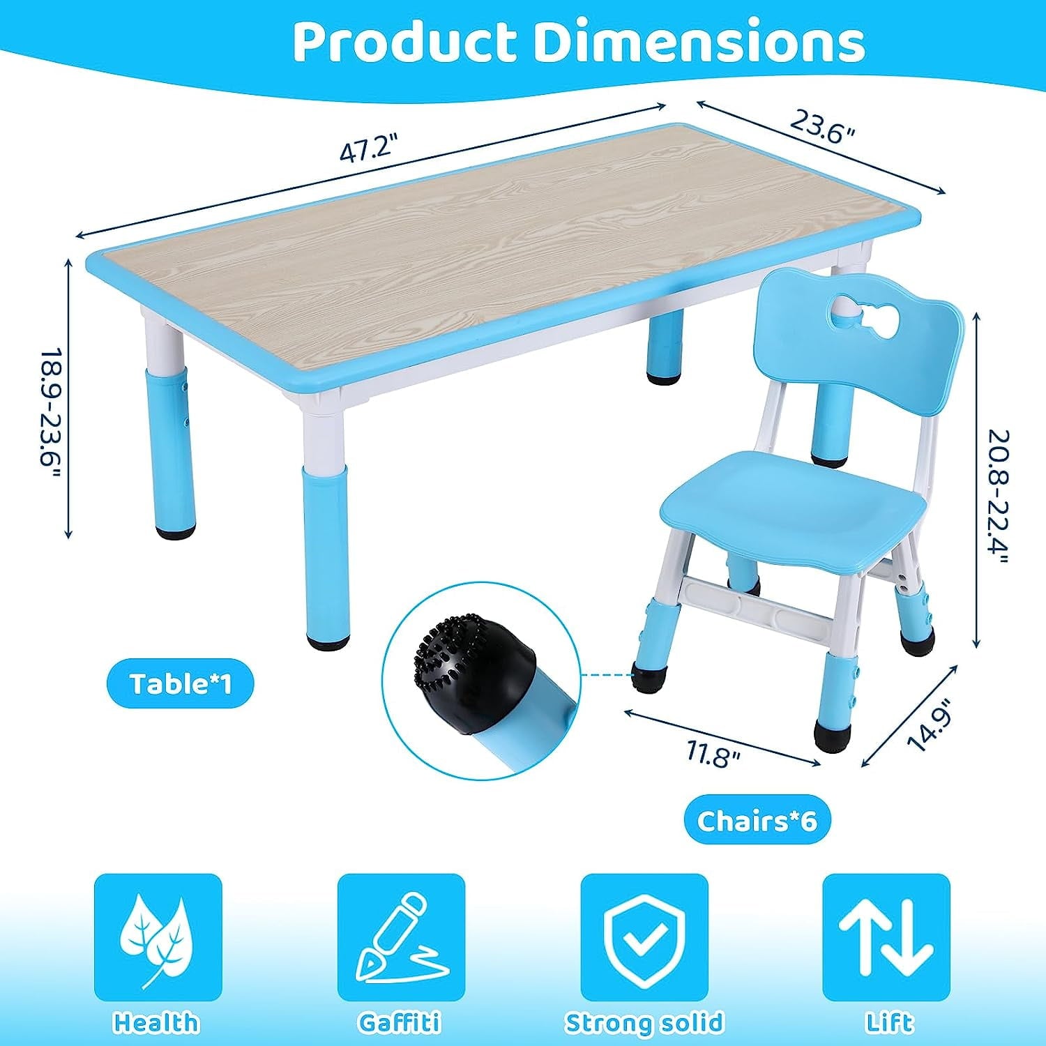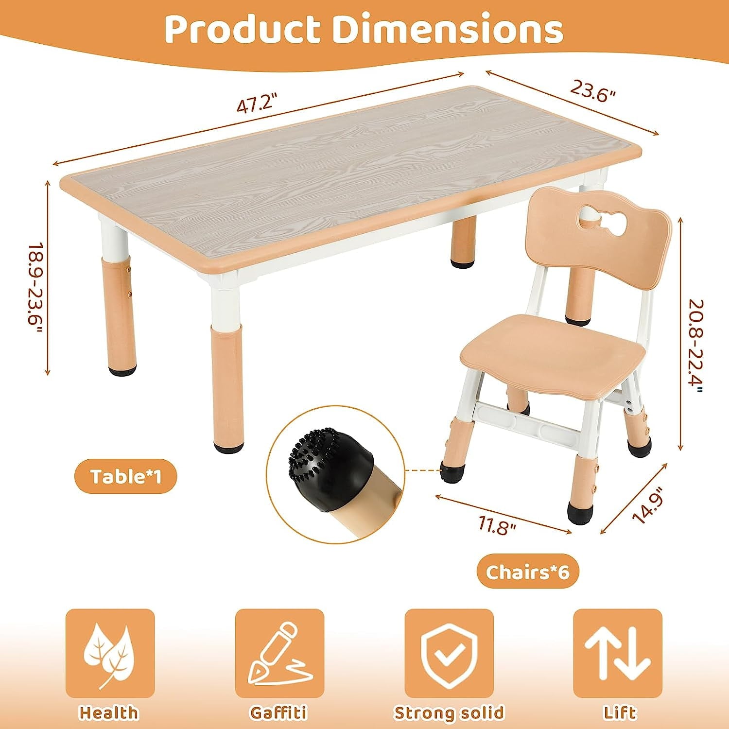 - Arlopu toddler table and 6 chairs set features a large 47.2 x 23.6 inch desktop, providing ample space for up to 4-6 children to play together. The table’s lip prevents stationery from rolling off, and the surface is easy to wipe clean.