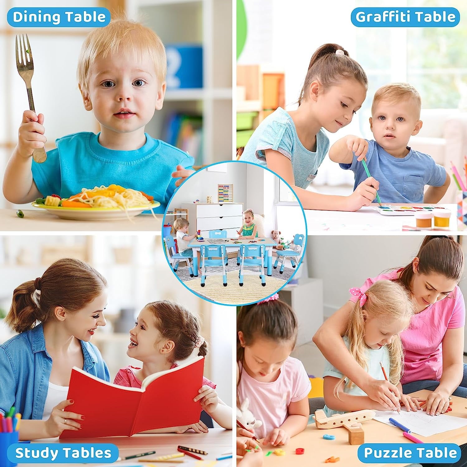 - Kids play activity table sets are durable and safe Round corners to protect children. Ergonomic design helps kids correct sitting posture. It is a great kids furniture for helping children develop their creativity and imagination.