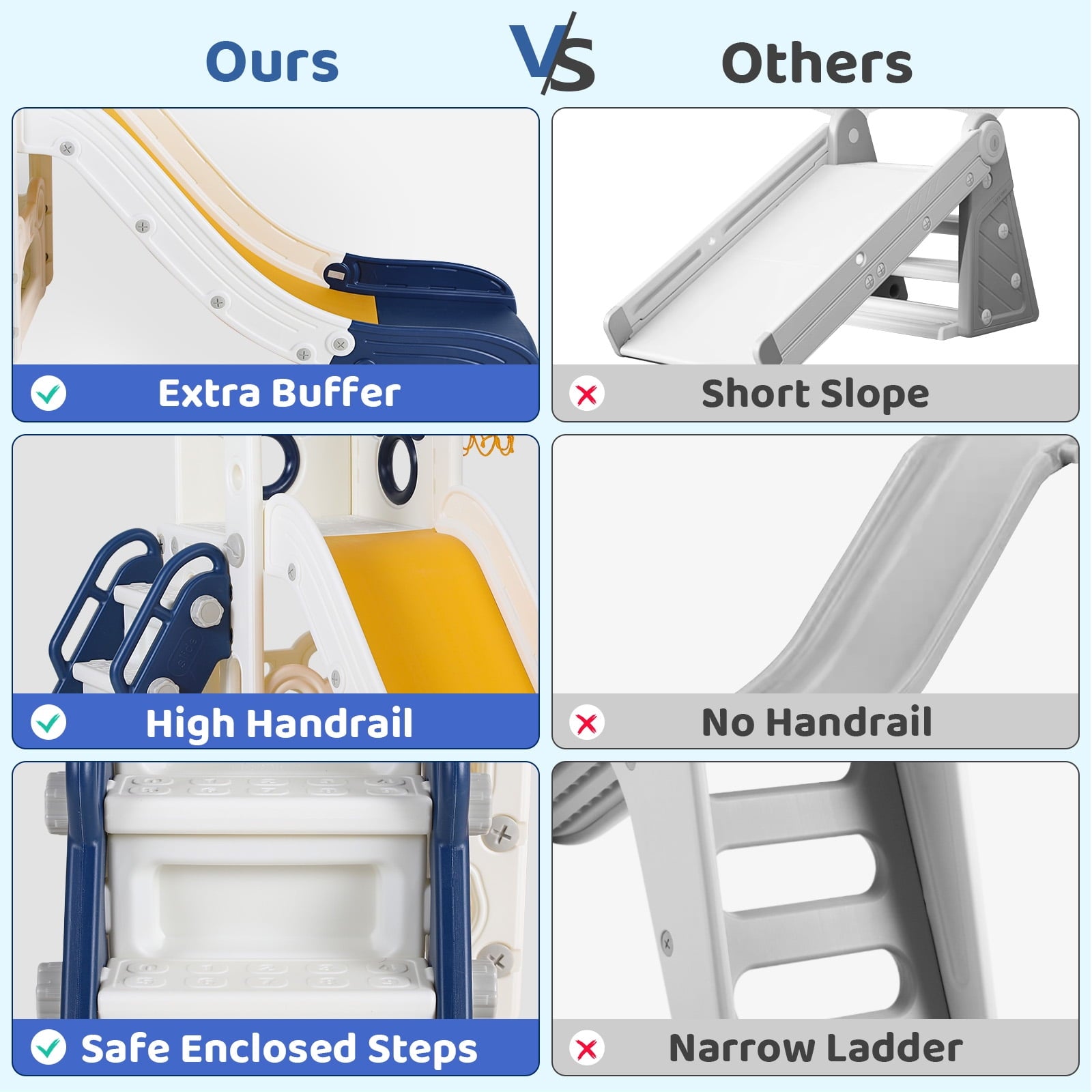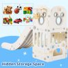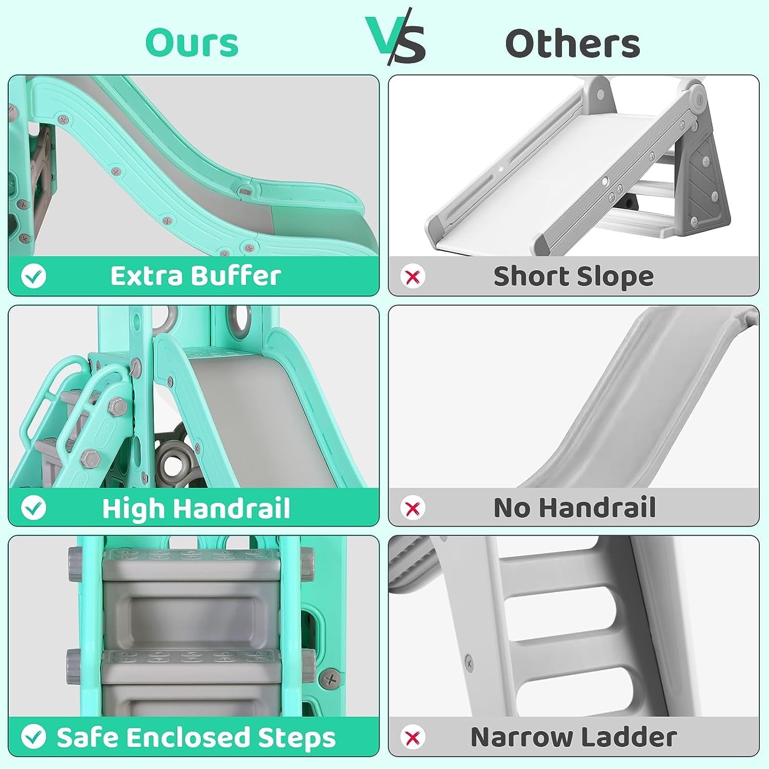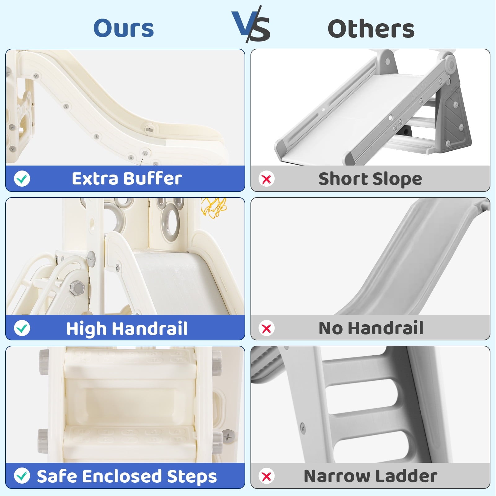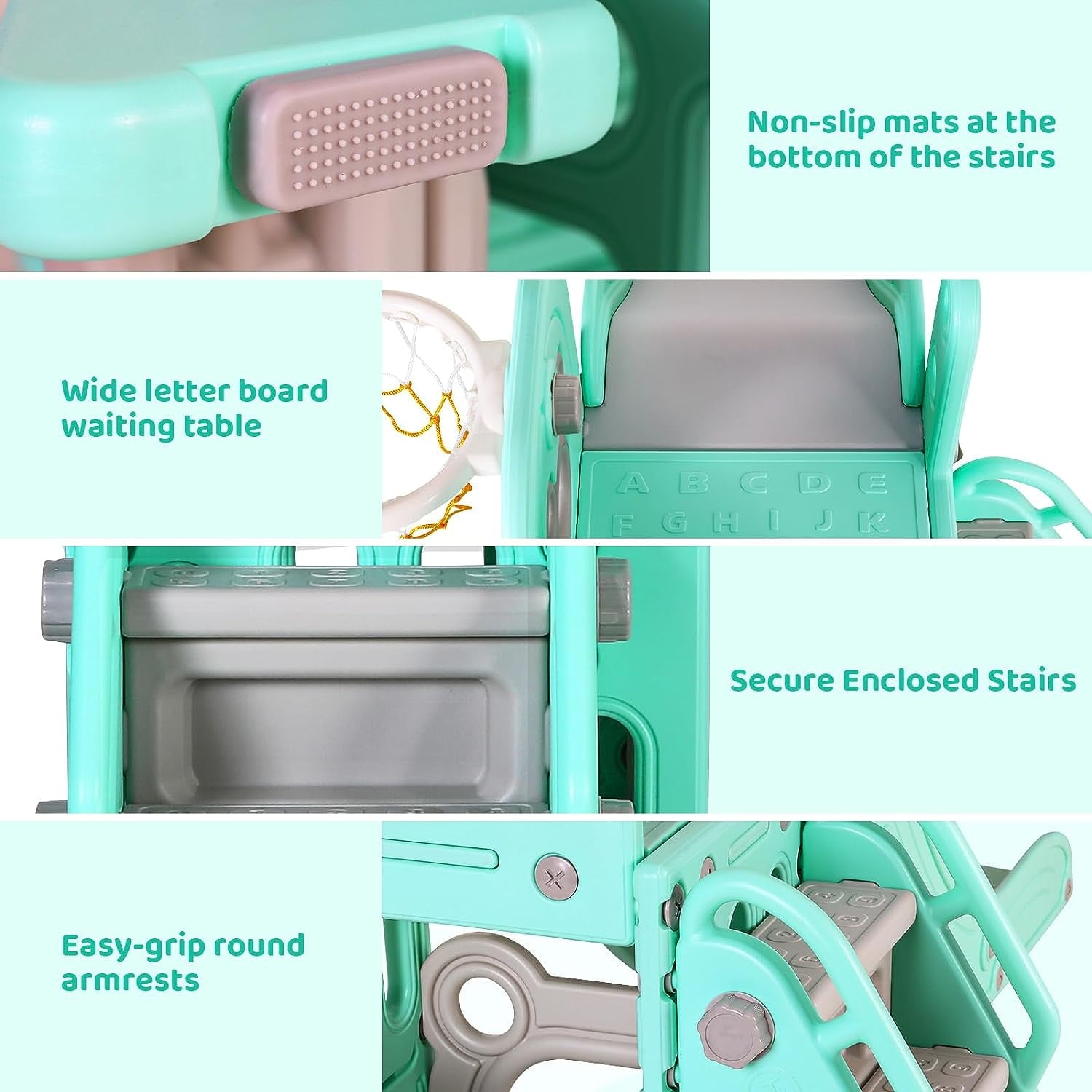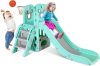 • 4-in-1 Fun Design: Features long slide, handrail climber, basketball hoop, and storage. Wide slideway with 3 speed zones for exciting play.