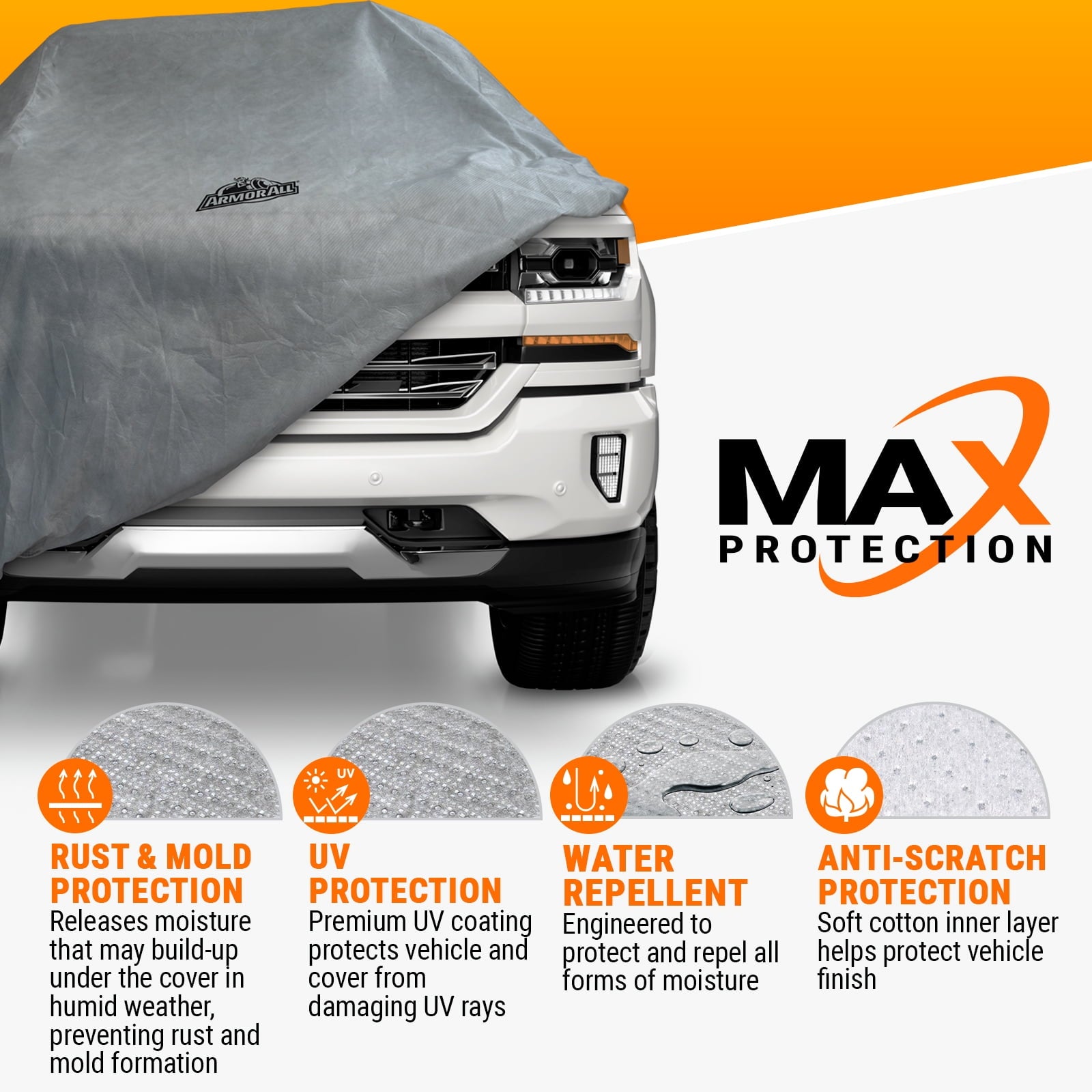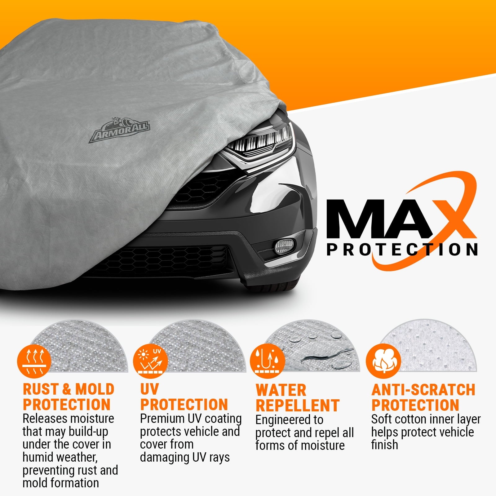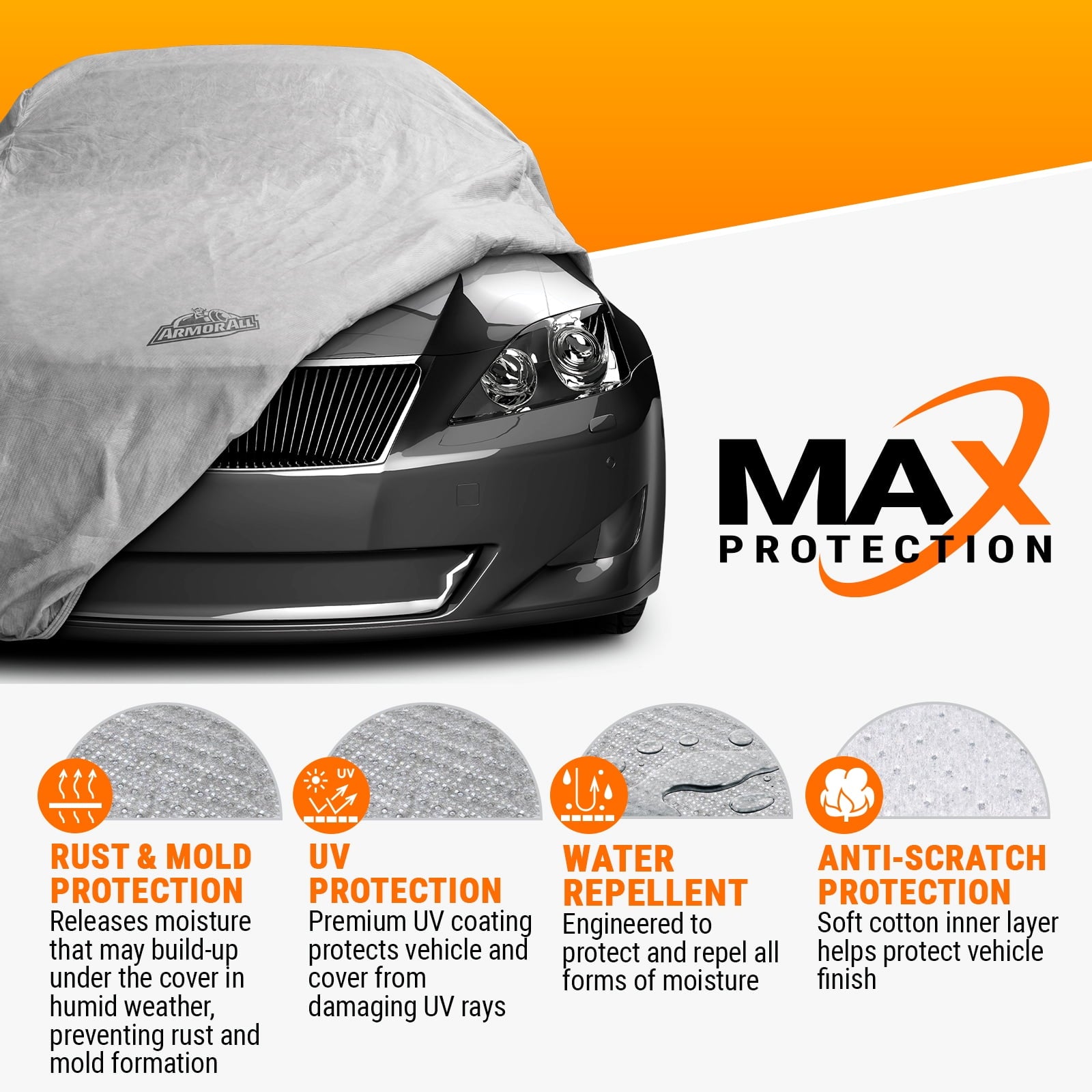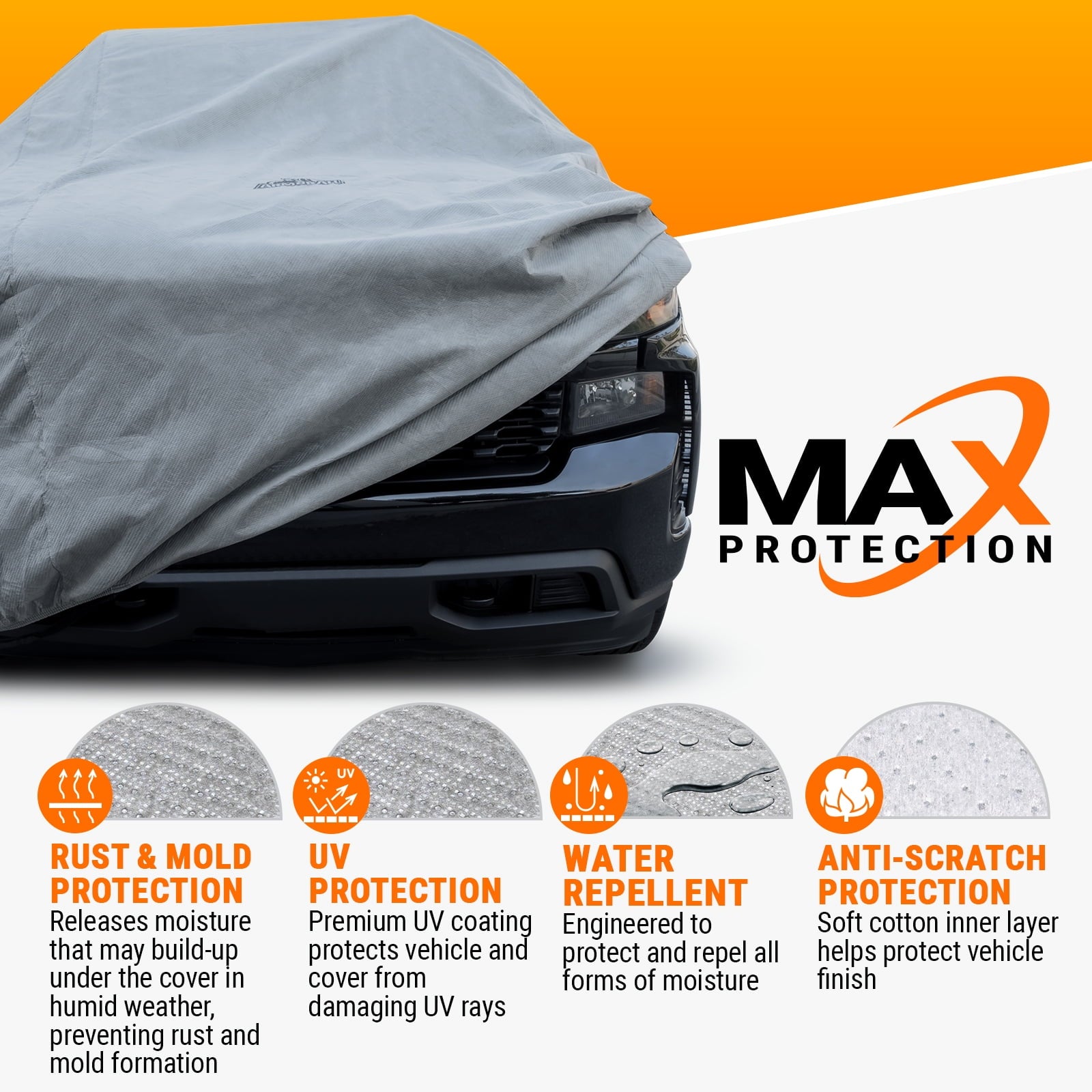 - Heavy Duty Material with Max Protection provides – High water repellent protection, Sun protection from damaging UV rays, Allows cover to breath preventing moisture build-up under the cover; Anti-scratch soft cotton layer protects vehicle finish
