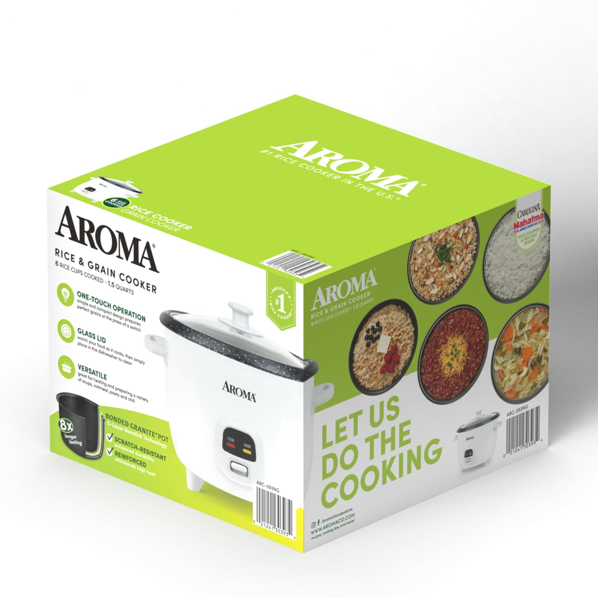 NEW UPGRADE!! Aroma’s Bonded Granite® 6-Cup Rice Cooker redefines non-stick durability. The 5-layer rice cooker pot is sealed with Bonded Granite®, which lasts 8x longer than ceramic. Plus, the pot is marked for foolproof measuring. Pour 1, 2, or 3 cups of uncooked rice inside and add water up to the line. It’s also great for soup, jambalaya, and oatmeal. Push the button to start and watch your food cook through the tempered glass lid. The rice cooker automatically switches to ‘keep warm’ when it’s ready to serve. Cook with confidence and clean up faster!