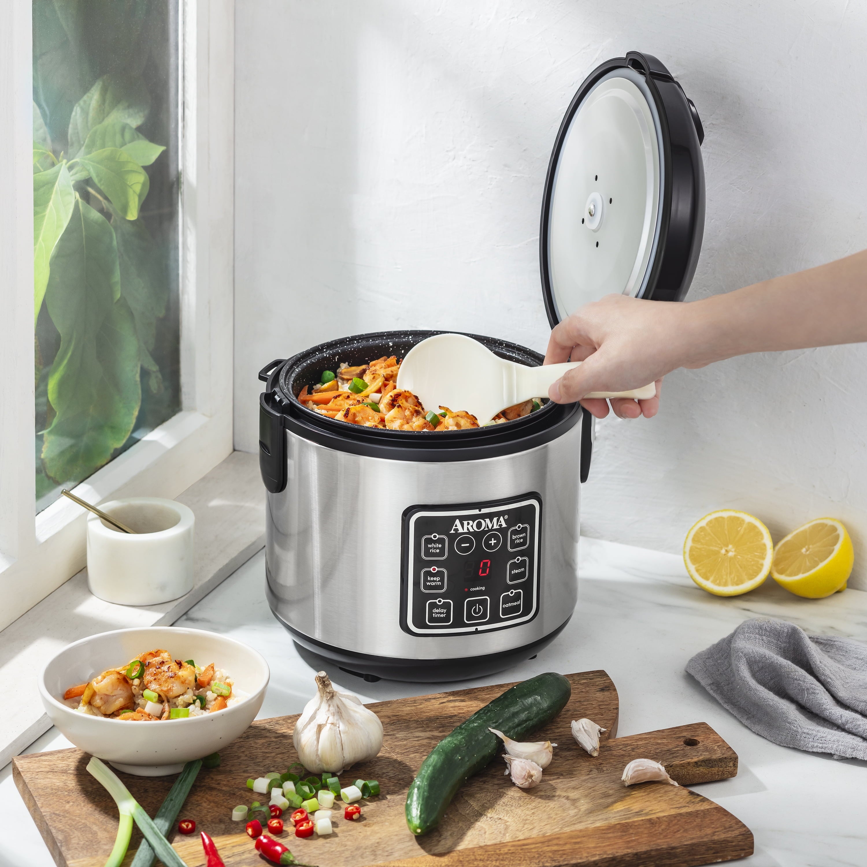 Enjoy easy home cooking with the Aroma® 8-Cup (Cooked) Digital Rice Cooker & Food Steamer. Restaurant-quality rice. Healthy steamed meals. Delicious one-pot dishes. Prepare all this and more at the press of a button. The New UPGRADE!! Bonded Granite® nonstick inner pot lasts 8x longer than pots made of other materials and will not chip or flake during heavy use! The inner pot is also completely toxin-free and dishwasher safe which makes for stress-free cooking and simple cleanups. The compact capacity perfectly cooks 2 to 8 cups of any variety of rice with specialized functions for both White and Brown Rice. Once the rice has finished, it will automatically switch to Keep Warm so there’s no need for monitoring or stirring. The included steam tray allows for healthy steaming of meats and vegetables, even as rice cooks below. It’s also suitable for oatmeal, chili, jambalaya, soups, and much more. The Delay Timer is designed for people on the go. Place rice in the cooker in the morning set the Delay Timer to the desired time and come back to perfect rice ready to serve.