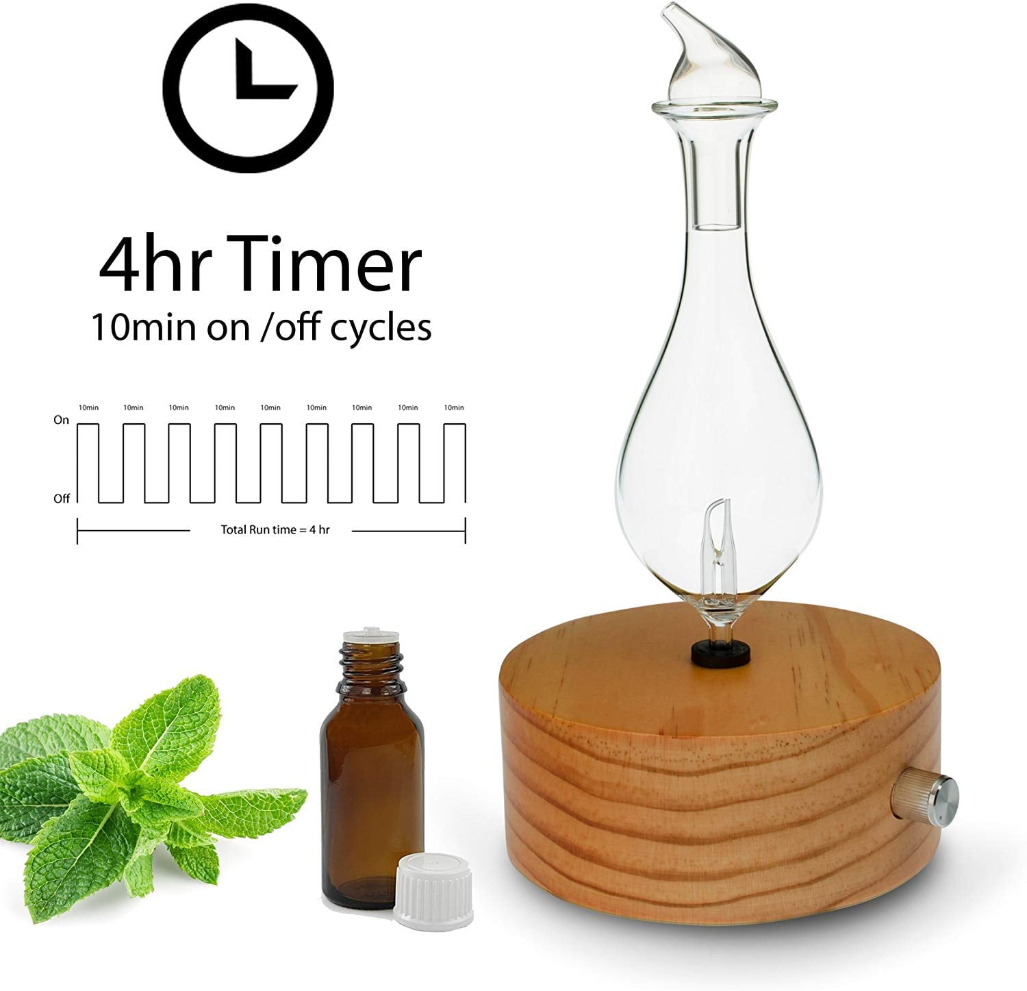 Essential Oils have been used around the world for thousands of years for their healing properties. Essential Oil diffusers are designed to vaporize essential oil into a mist creating a wonderful aroma. This aroma is thought to have both physical and emotional healing effects. To use the ArOmis nebulizer, insert the glass diffuser bottle into the wood base by gently pressing the bottle into the rubber hole on the base being careful not to twist the bottle as this may cause the rubber tube inside the device to twist and become pinched off. Once the bottle is in, plug in the power supply cord both to the base and your source of electricity. Place 15 to 20 drops of your favorite 100% pure essential oil into the glass diffuser bottle. Place the glass cap on the glass diffuser bottle and turn the metal power switch clockwise (to the right) to the desired diffusing level. The unit will run for three 40 minute cucles, 10 minutes on and 30 minutes off.