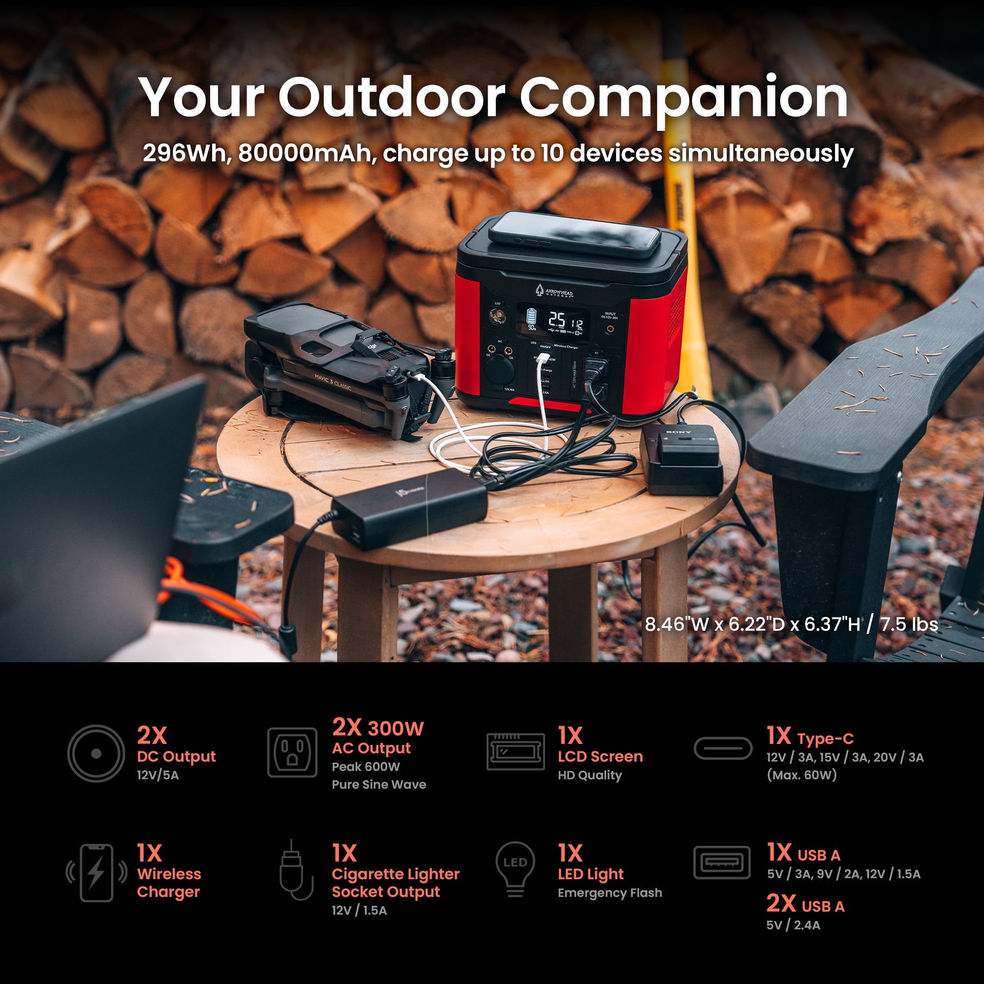 - 2X 300W Pure Sine Wave AC Outlets – Features 2x 120V AC outlets (600W Peak, Type-B Plug) providing clean power for sensitive electronics and devices