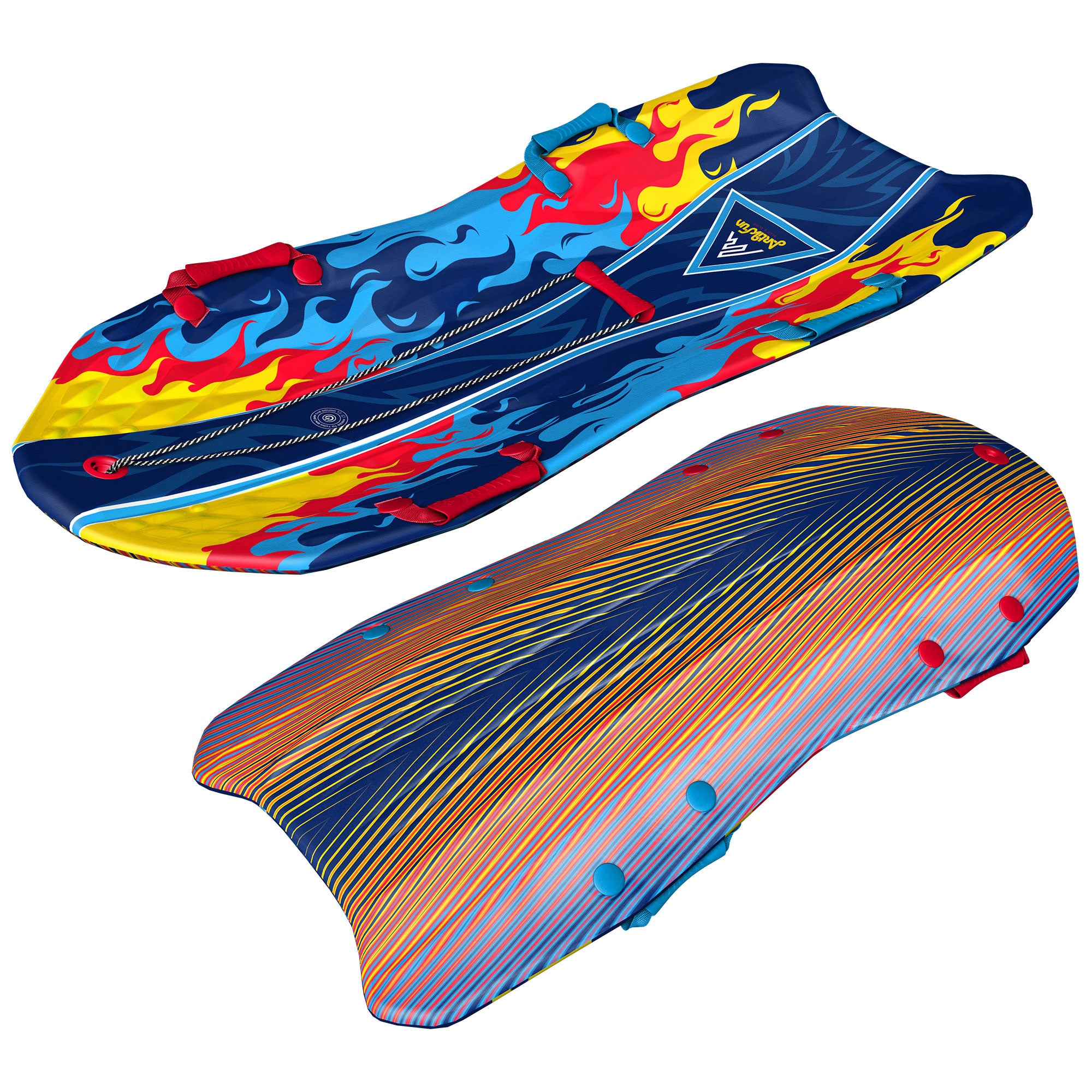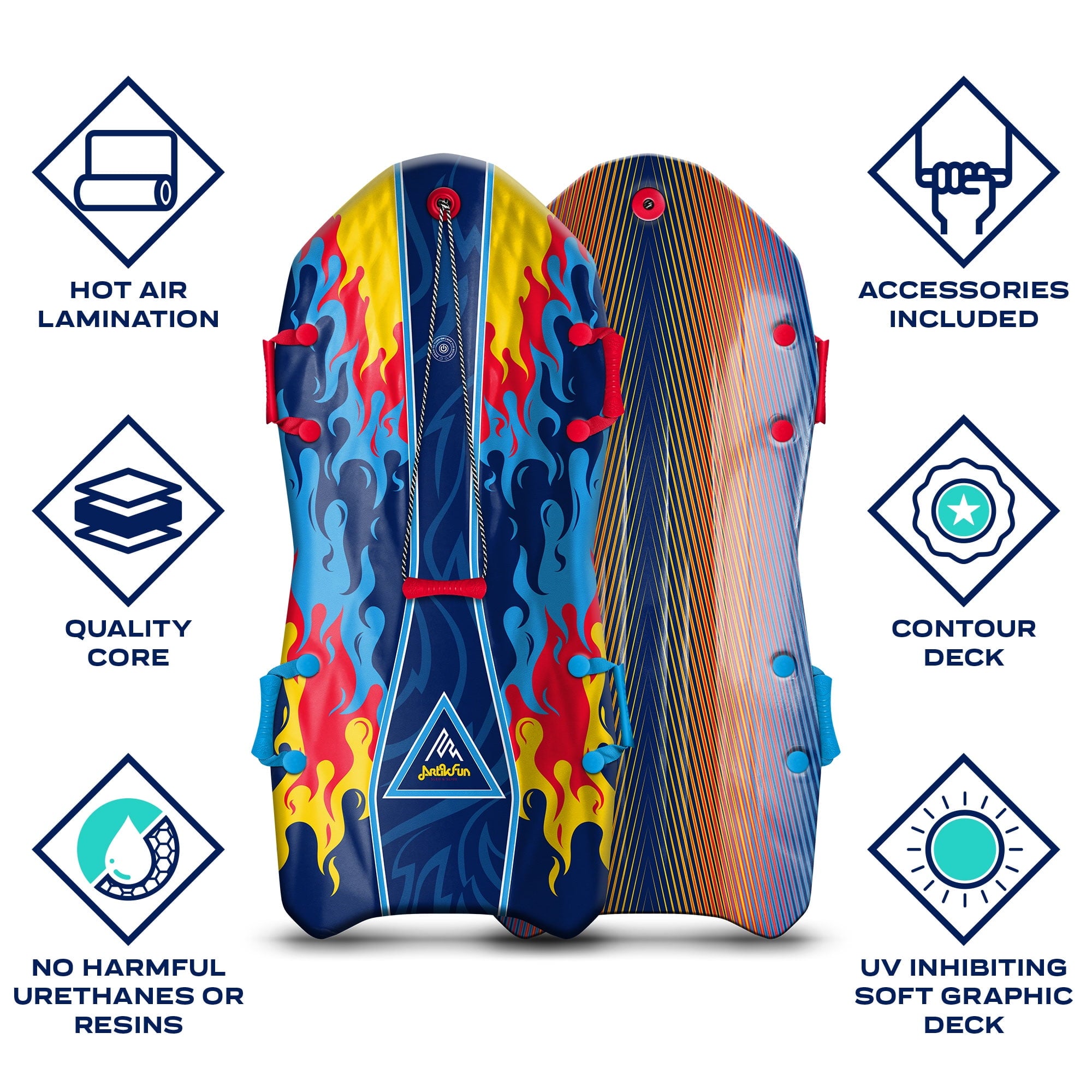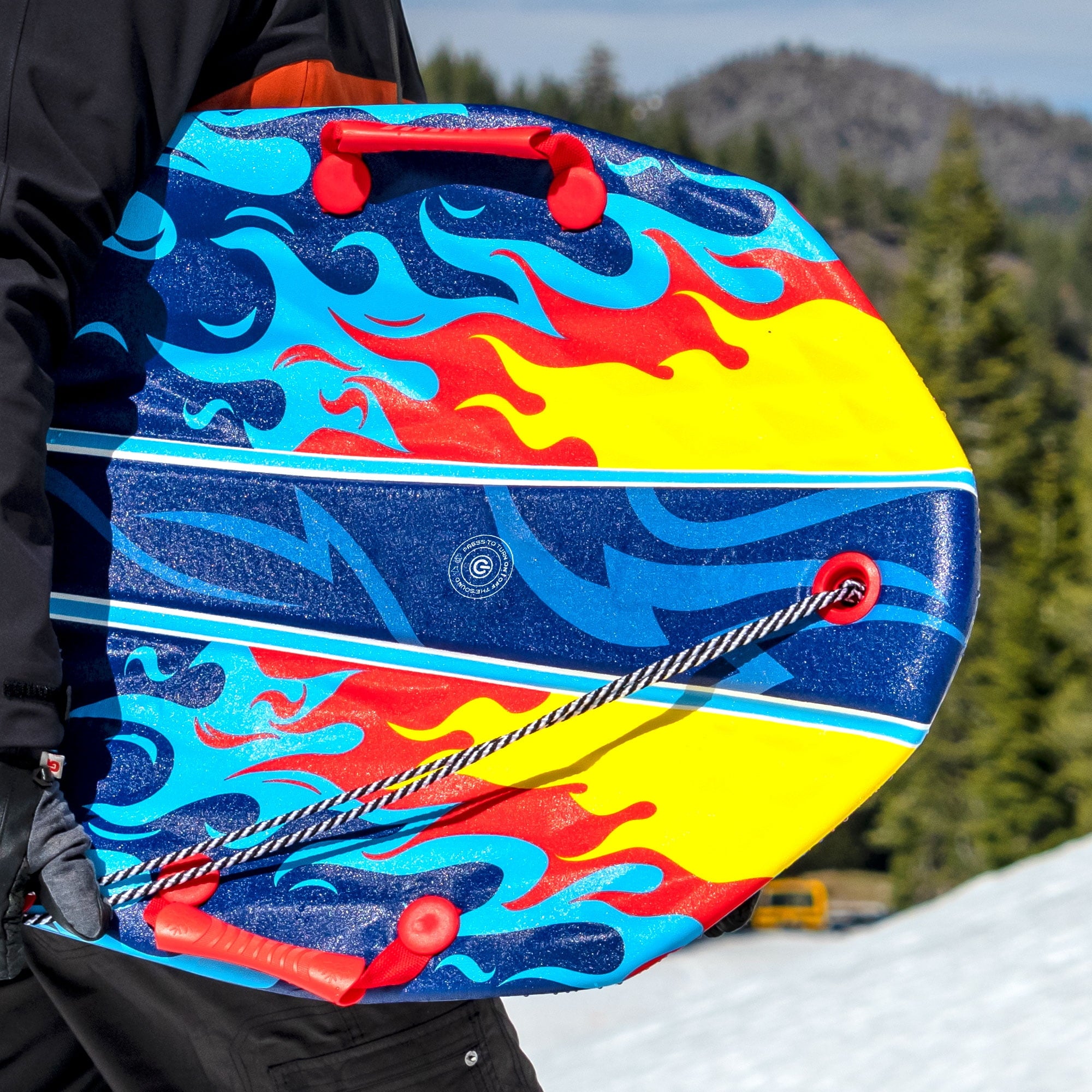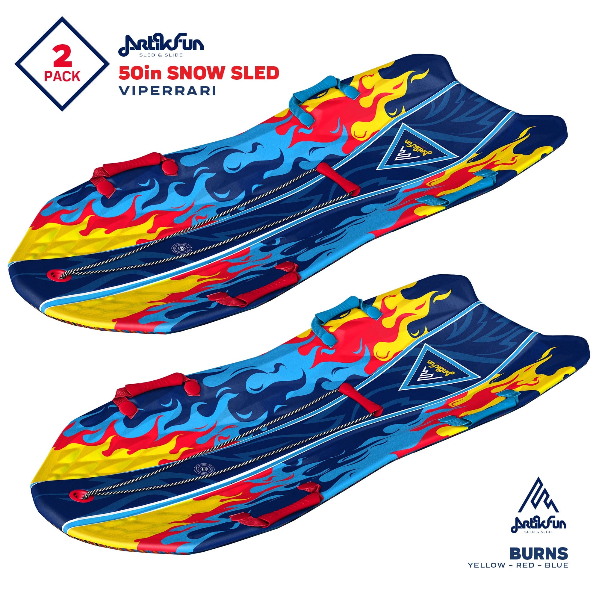 The Artikfun “Viperrari” Premium foam snow sled was designed and tested in the USA for snow play to riders wanting to thrill seek a speed run down a hill. Dense foam layering contoured molded foam with slick bottom. Tow rope and handles included for easy pulling or gripping to sled while riding. Foam construction holds integrity in cold temperatures and does not shatter as plastic competitor sleds. Each sled contains a motion-activated sound chip with a classic Car sound!