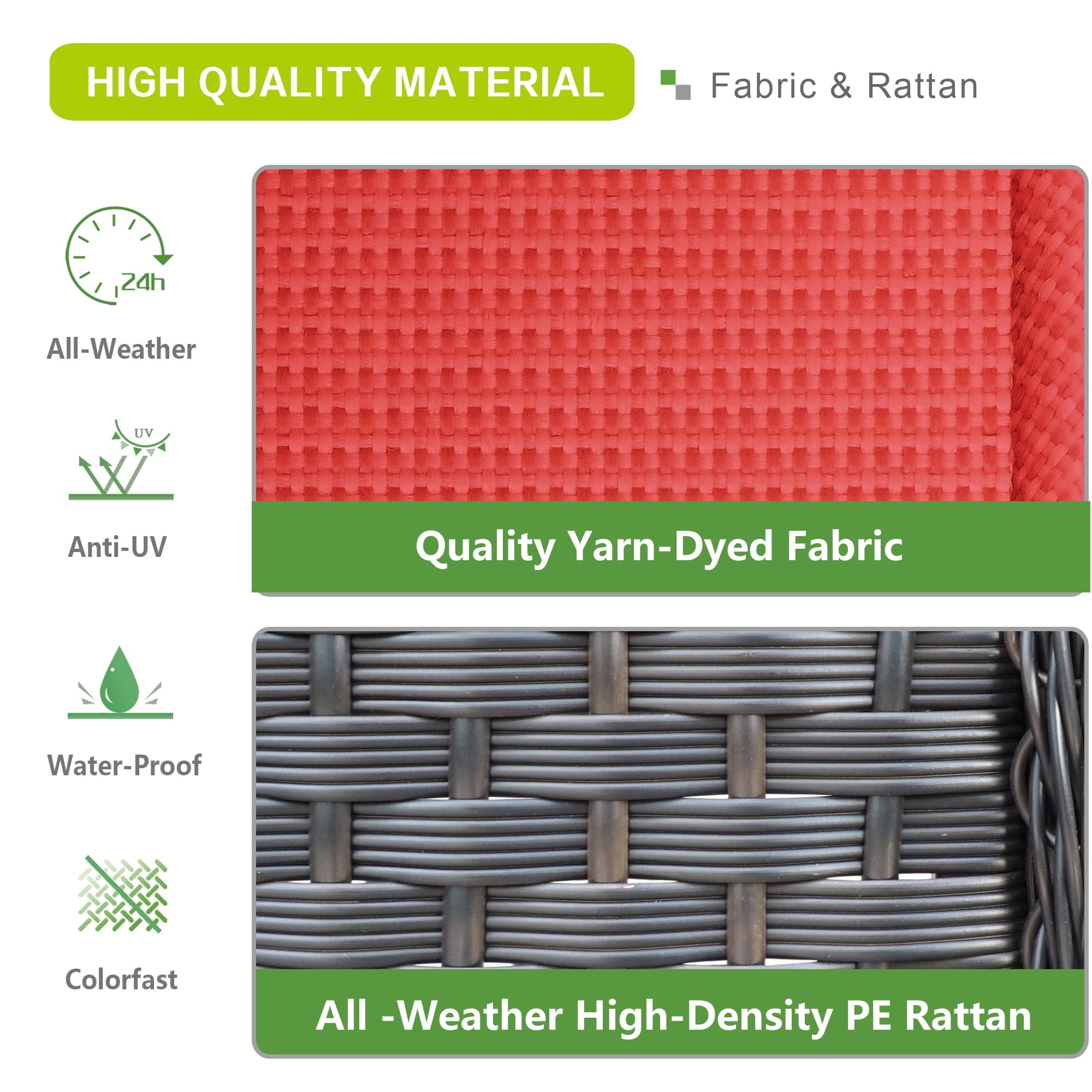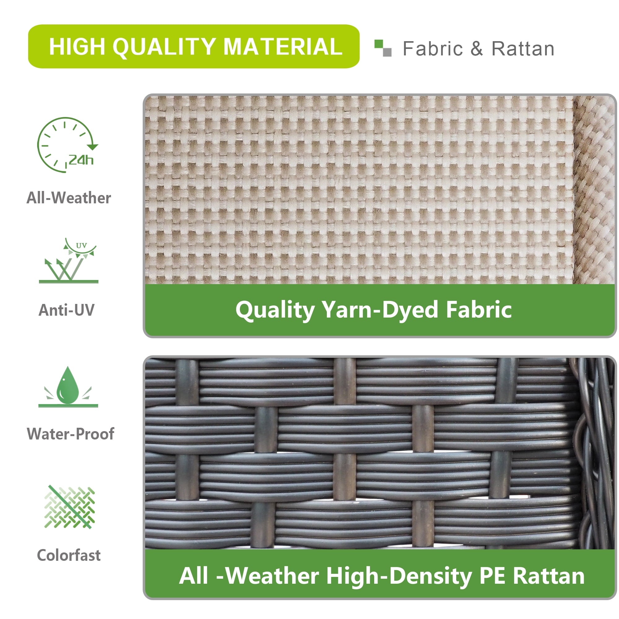 1. Material: PE Wicker & Steel Frame & Tempered Glass Tabletop & Waterproof Cloth & Doll Cotton