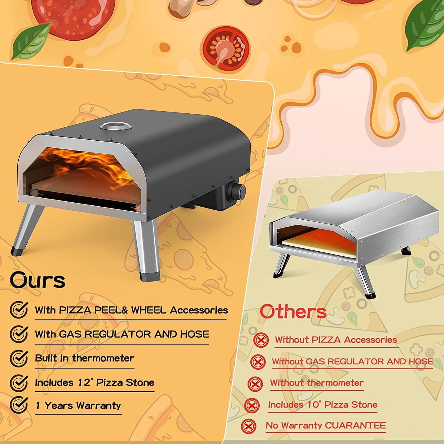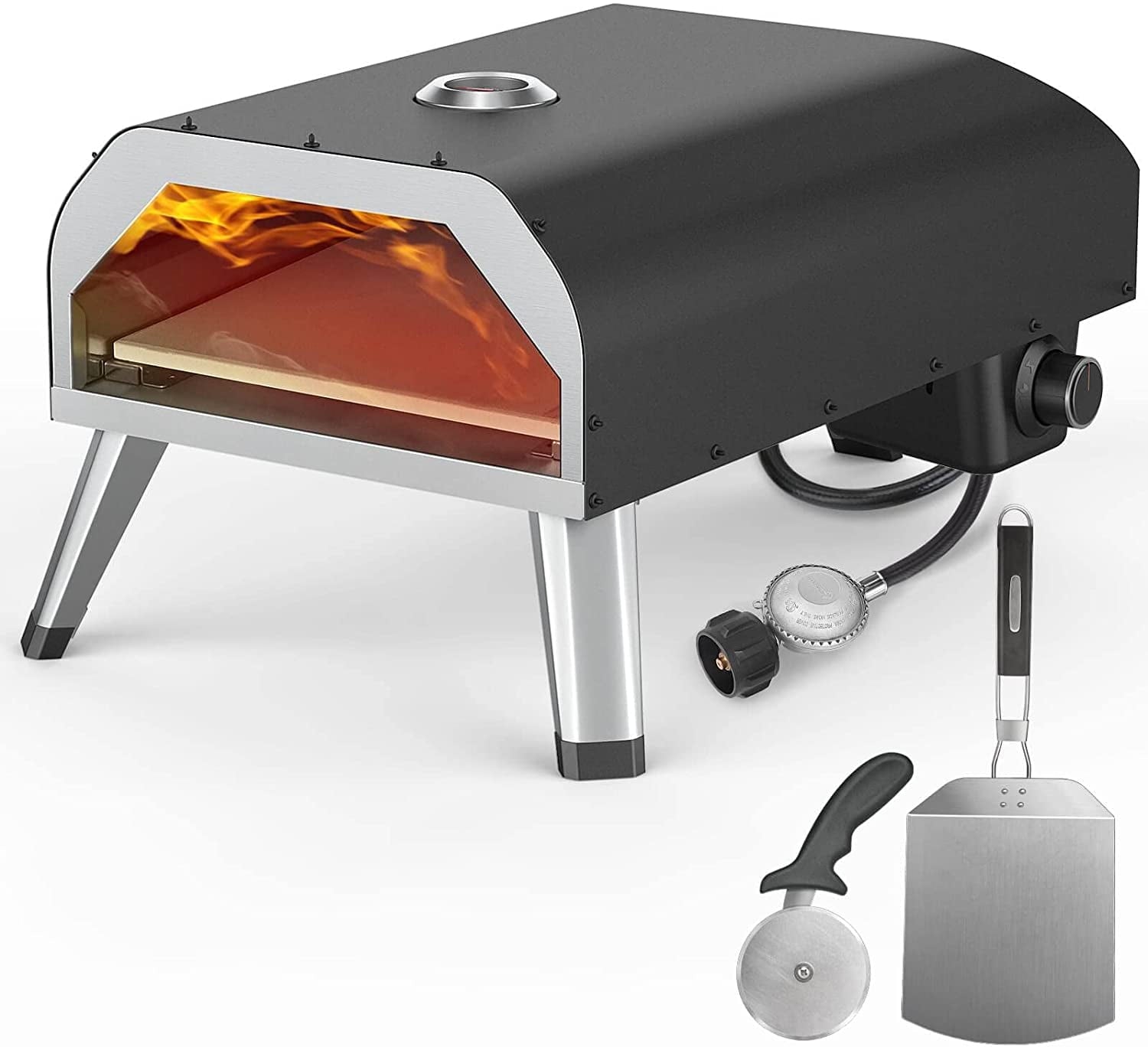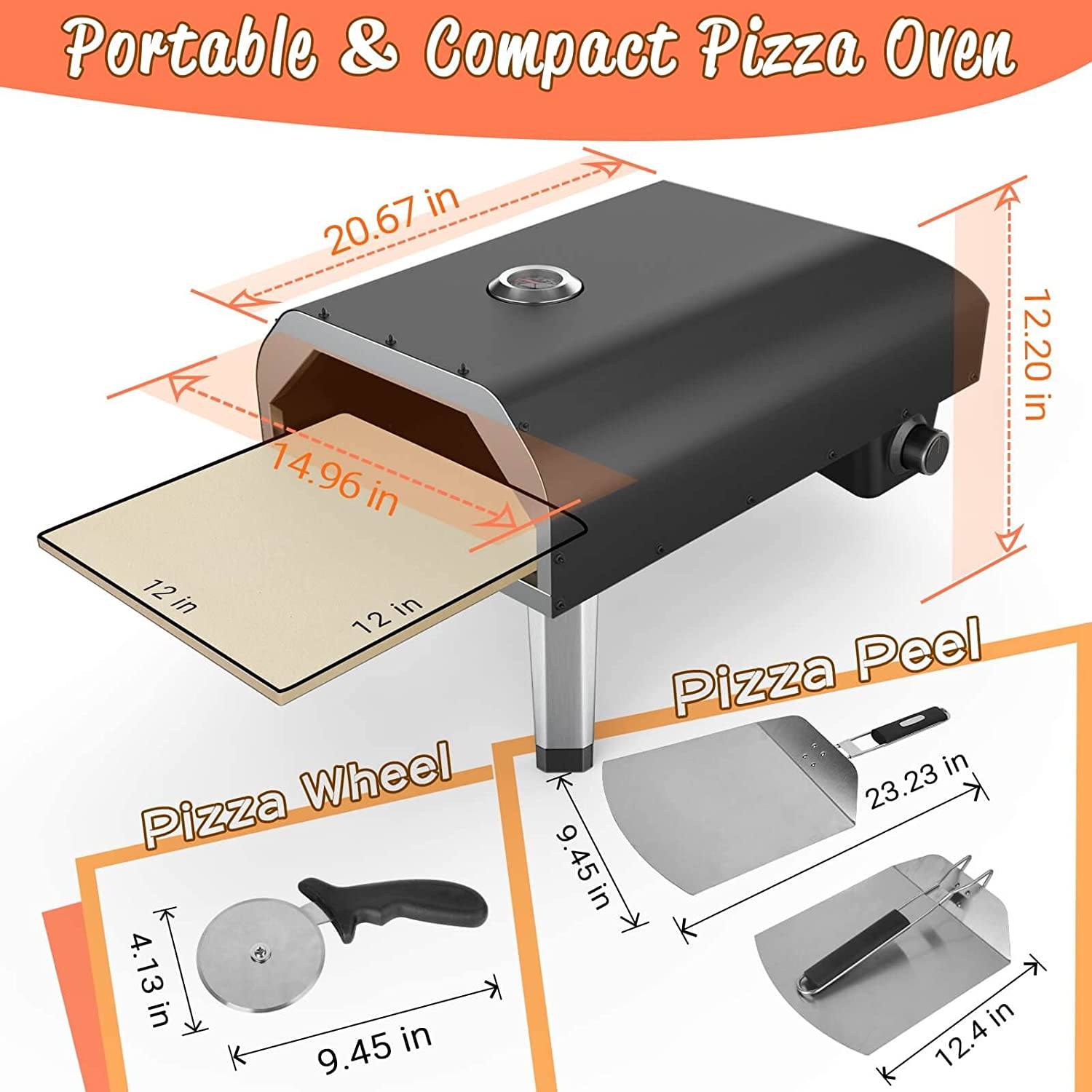 - 【Portable & Easy To Use】The outdoor gas-powered pizza oven weighs only 24.44 pounds, designed with no chimney, three folded legs, and no assembly required. Easy to carry and move, you can be easily put it into the car or taken outdoors. Package also includes a pizza peel, a pizza wheel, a pizza stone, a hose and regulator. It’s perfect for backyards, counter tops, or camping.