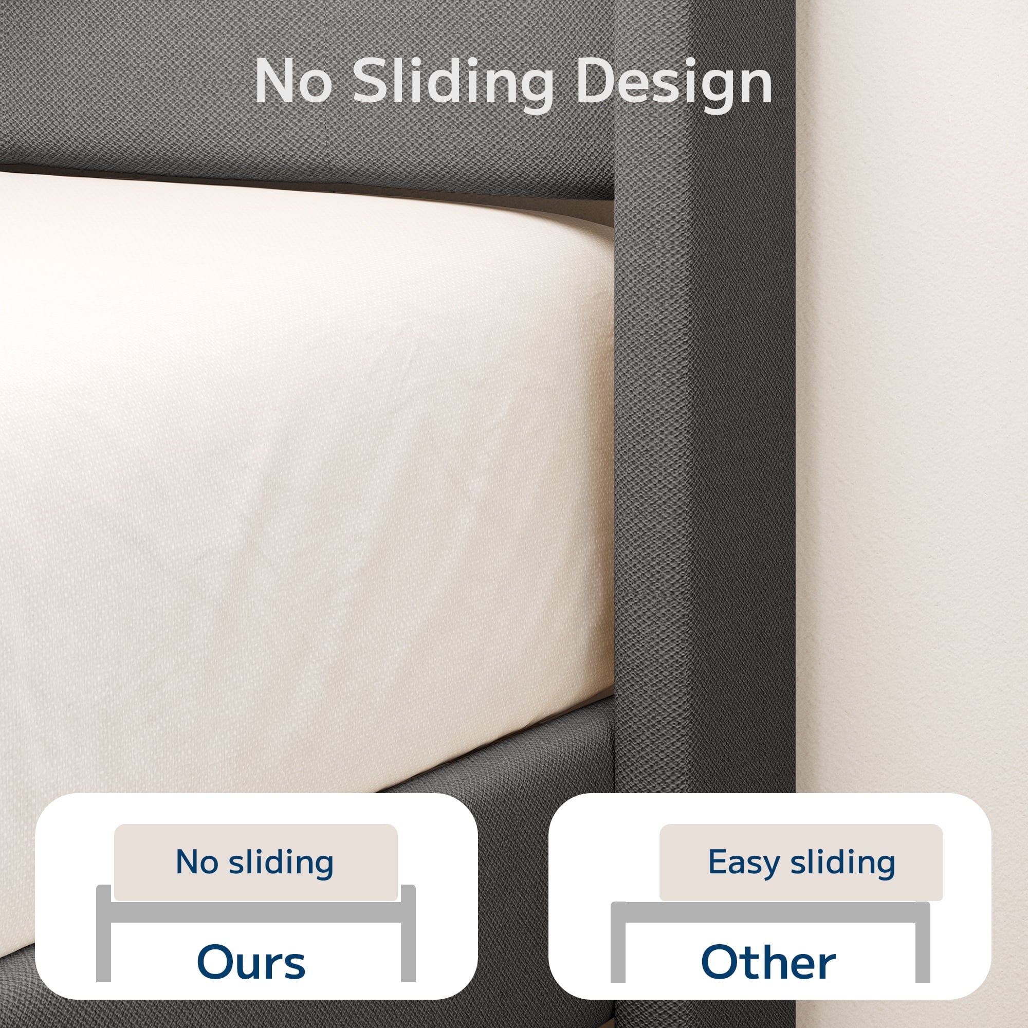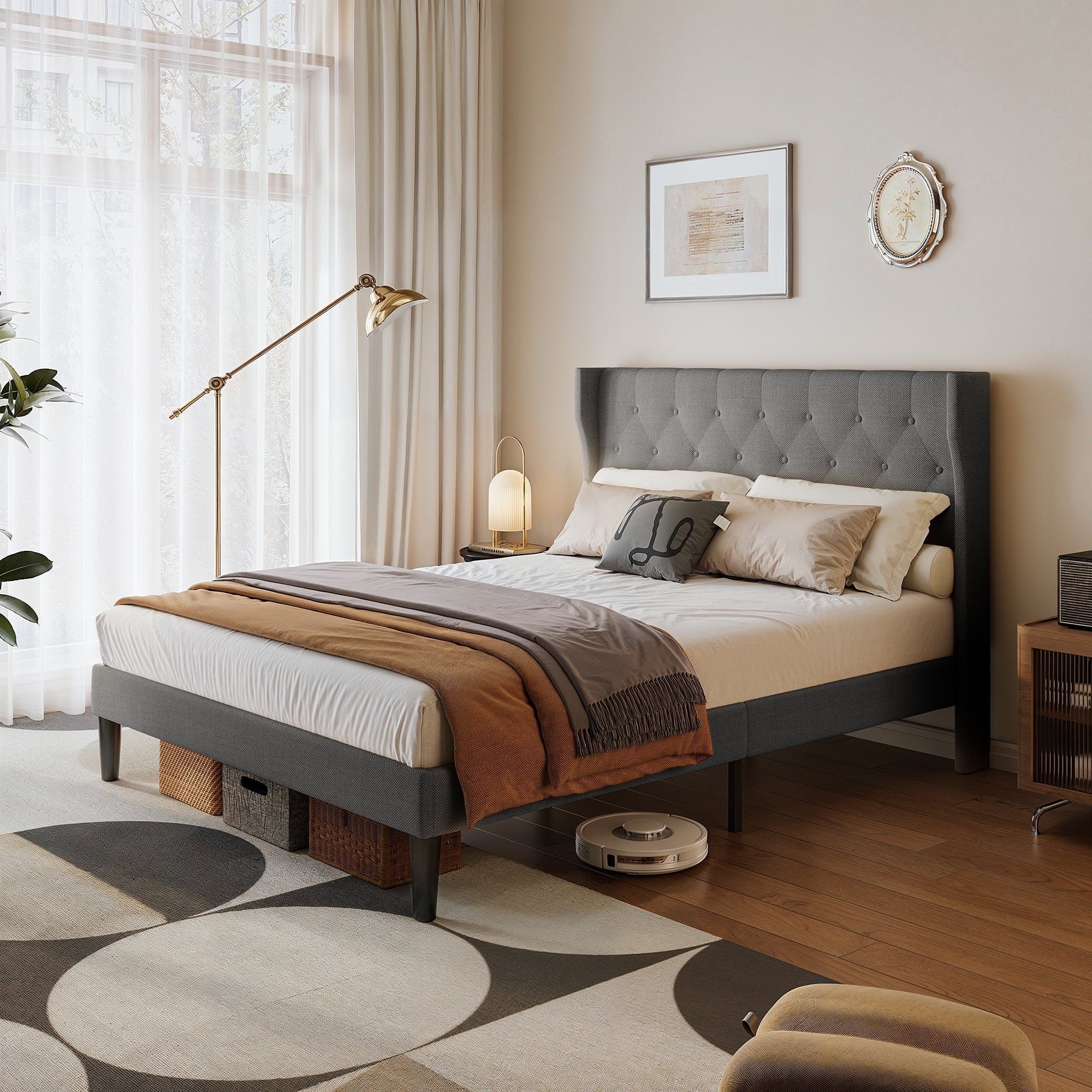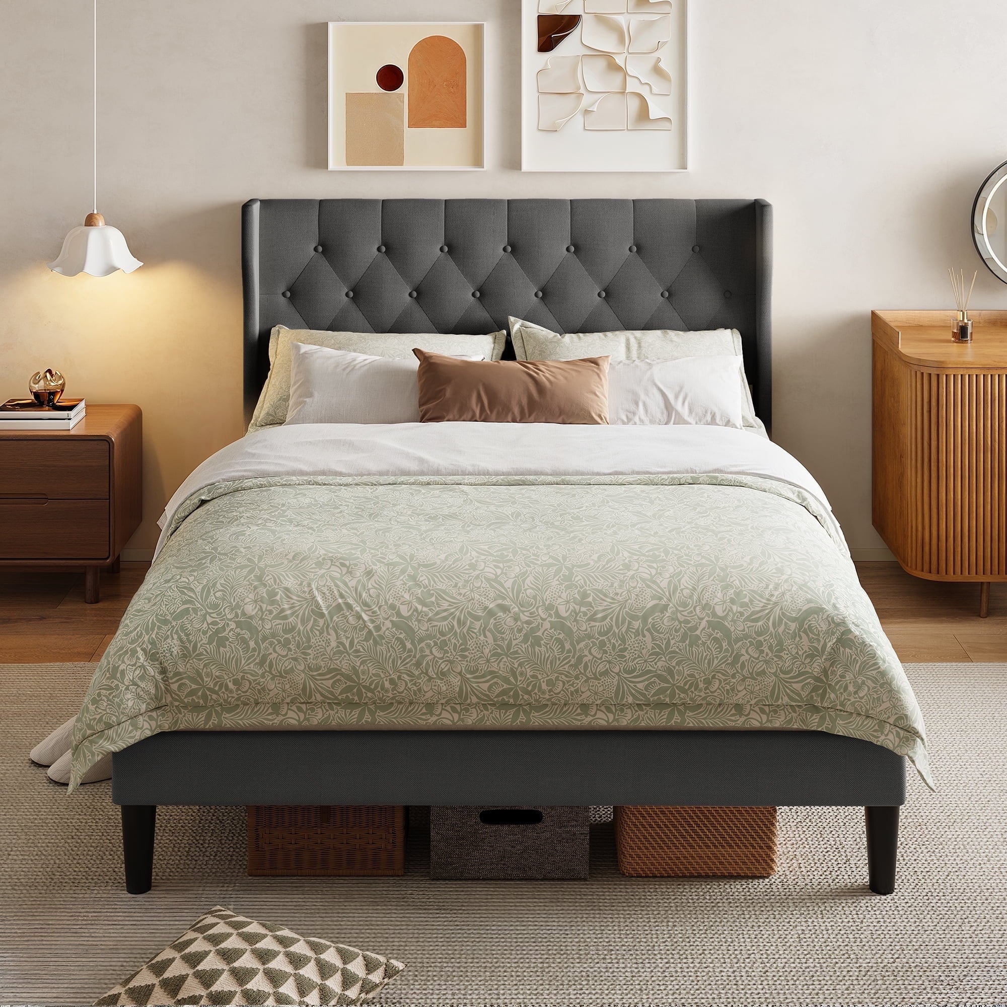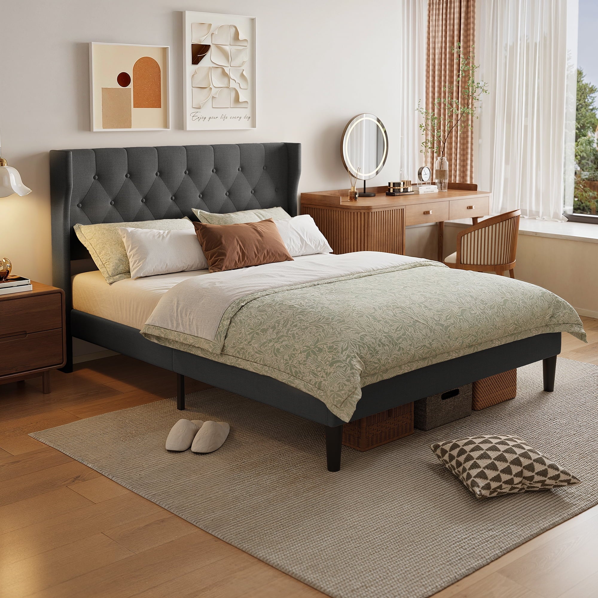 ??【Anti-shift design】The wingback headboard integrates high-density foam and cotton-linen blend upholstery, and the special structural design prevents pillow shifting and mattress displacement during sleep.