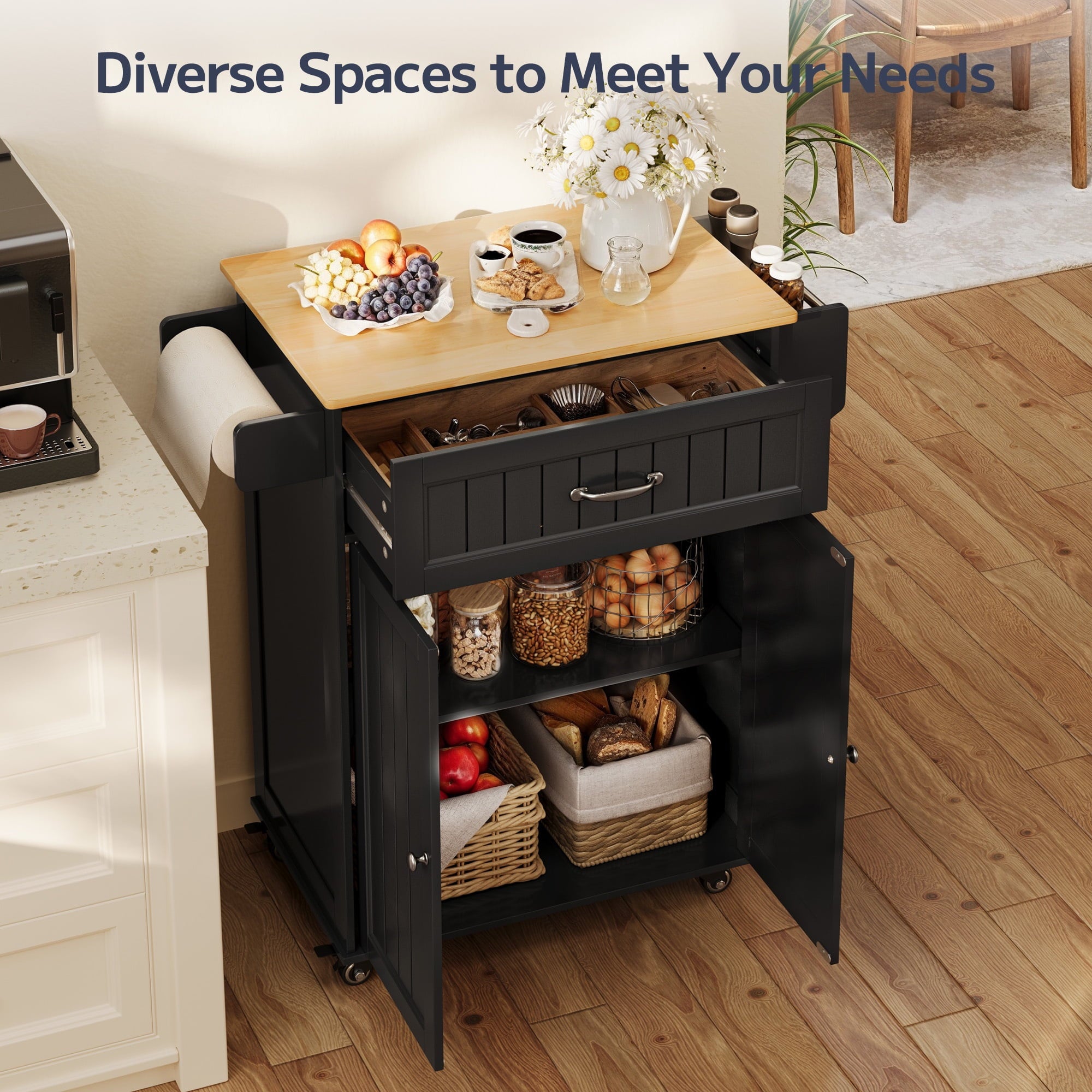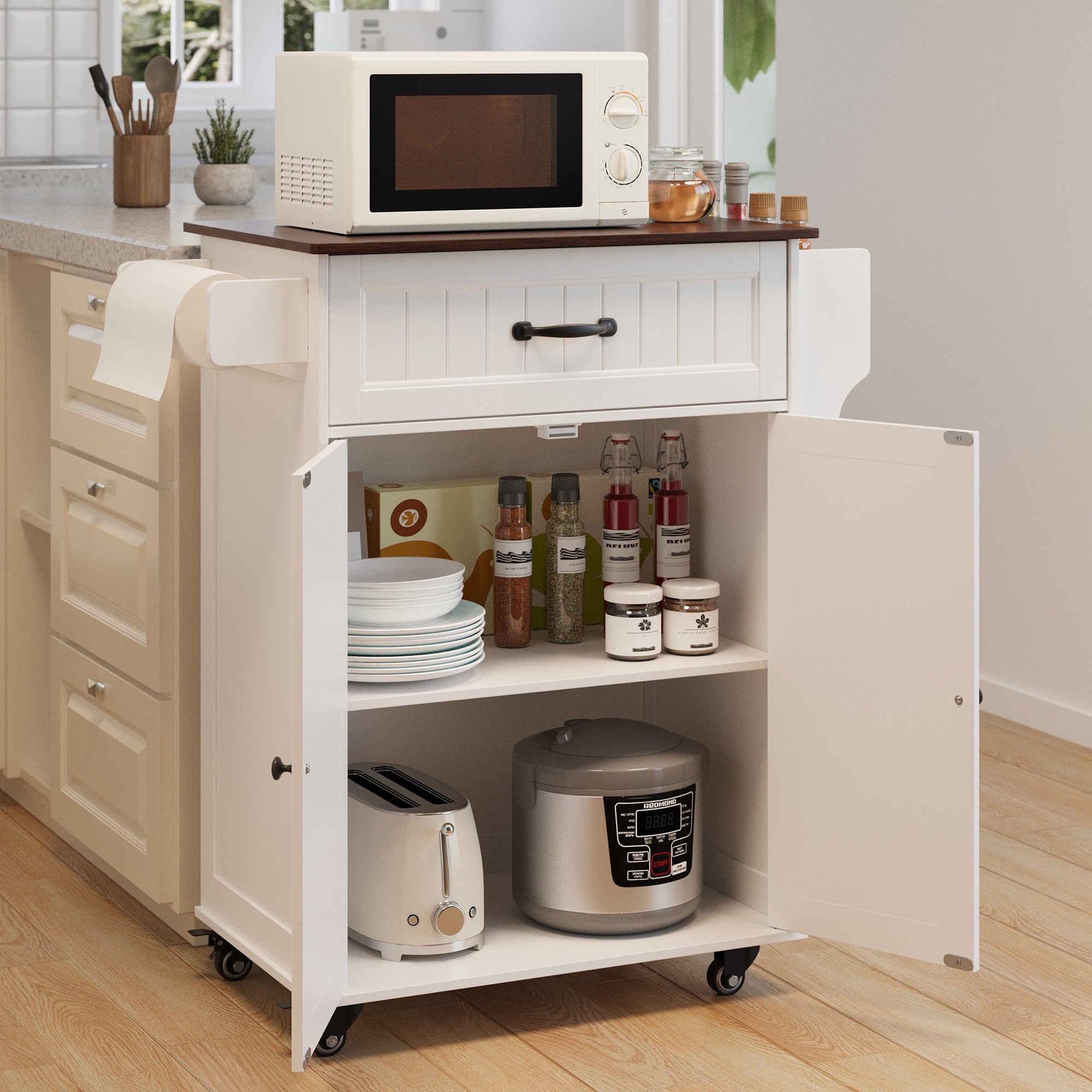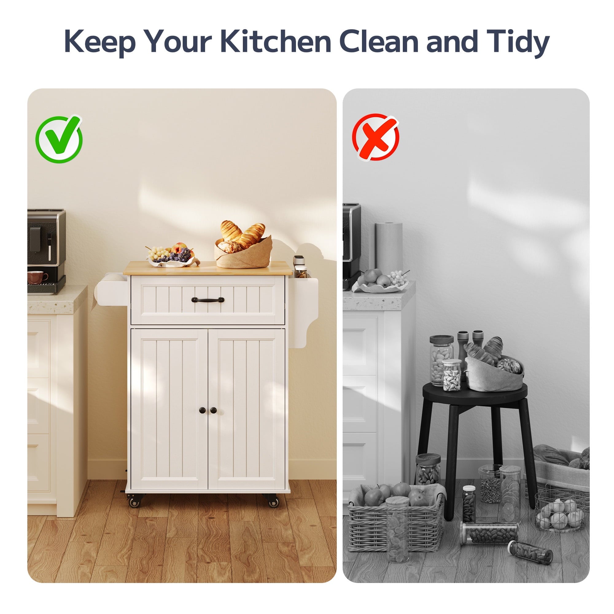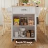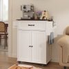 ??【Storage Space Upgrade】The mobile kitchen cart features a large-capacity drawer and a cabinet with two doors, which includes an adjustable shelf to accommodate kitchen items of varying heights. Additionally, the side towel rack has been upgraded to a detachable design, allowing you to easily switch out kitchen paper whenever needed.