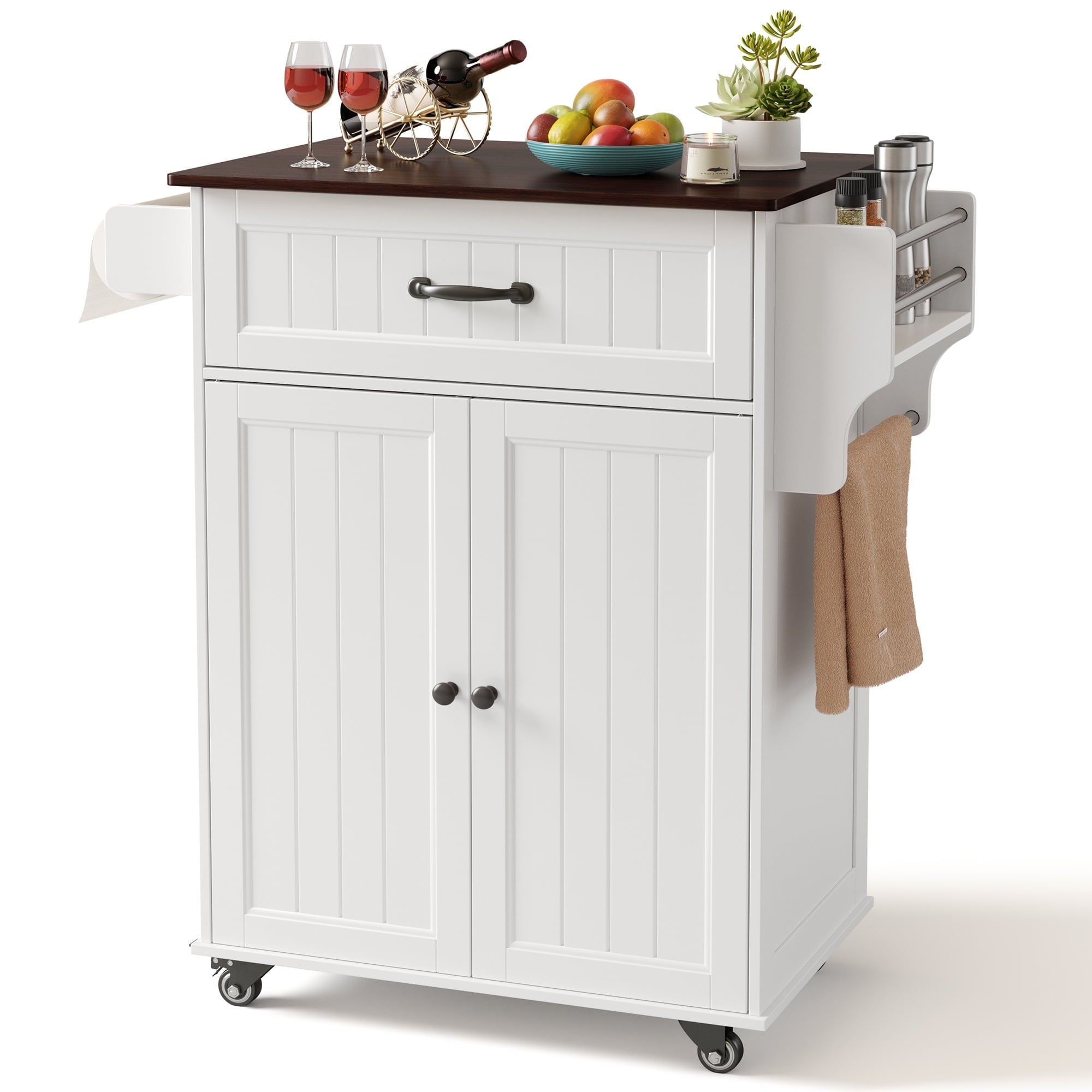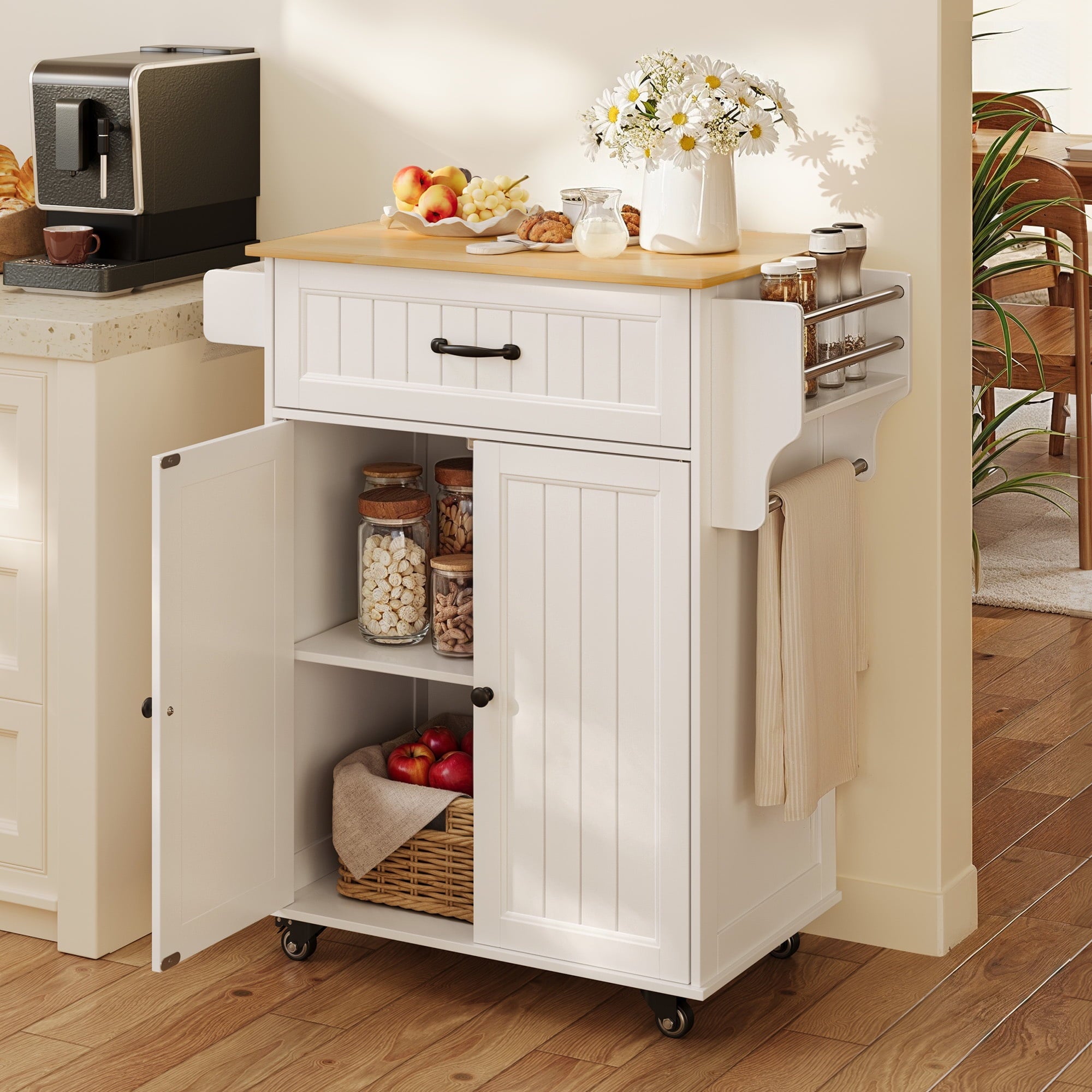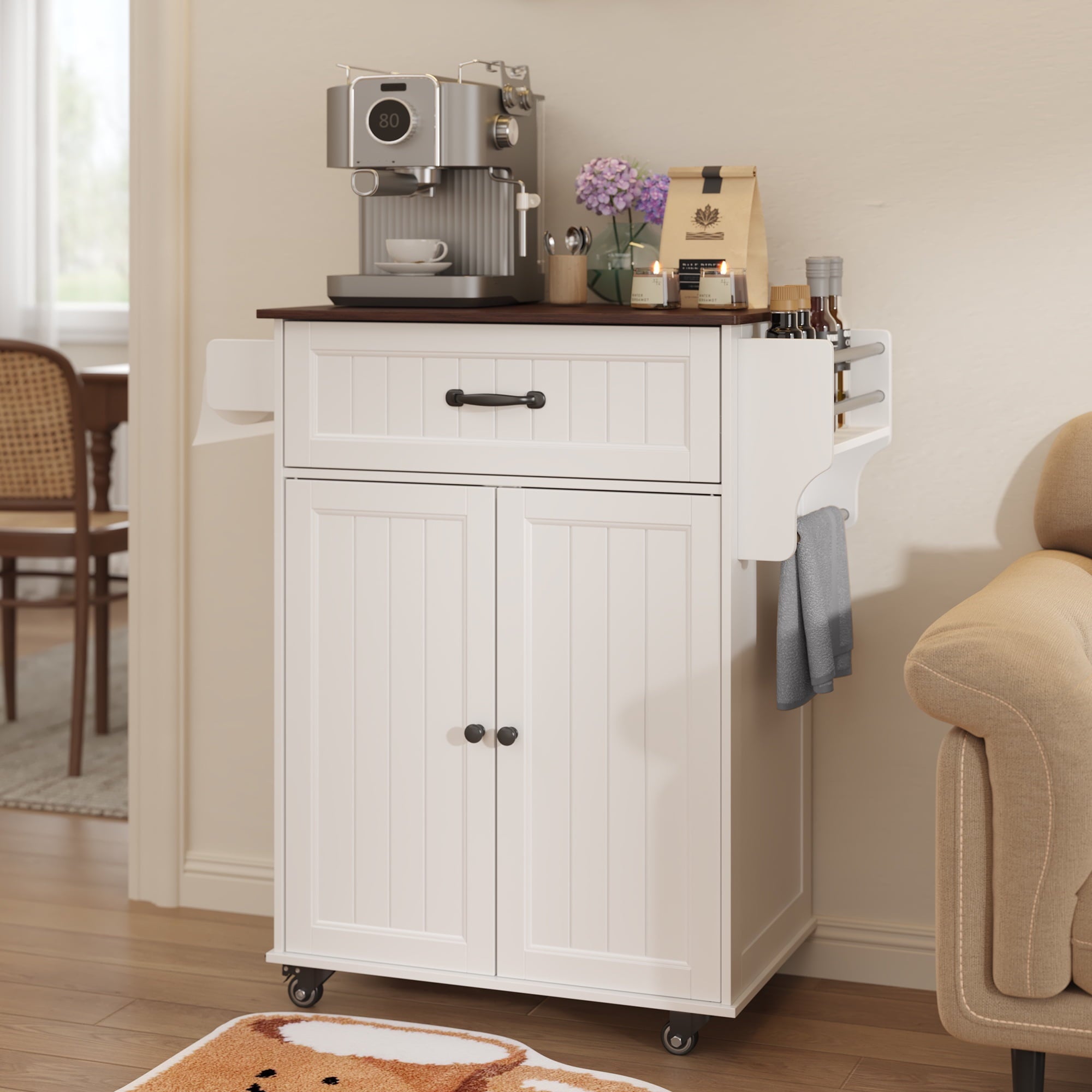 ??【Storage Space Upgrade】The mobile kitchen cart features a large-capacity drawer and a cabinet with two doors, which includes an adjustable shelf to accommodate kitchen items of varying heights. Additionally, the side towel rack has been upgraded to a detachable design, allowing you to easily switch out kitchen paper whenever needed.