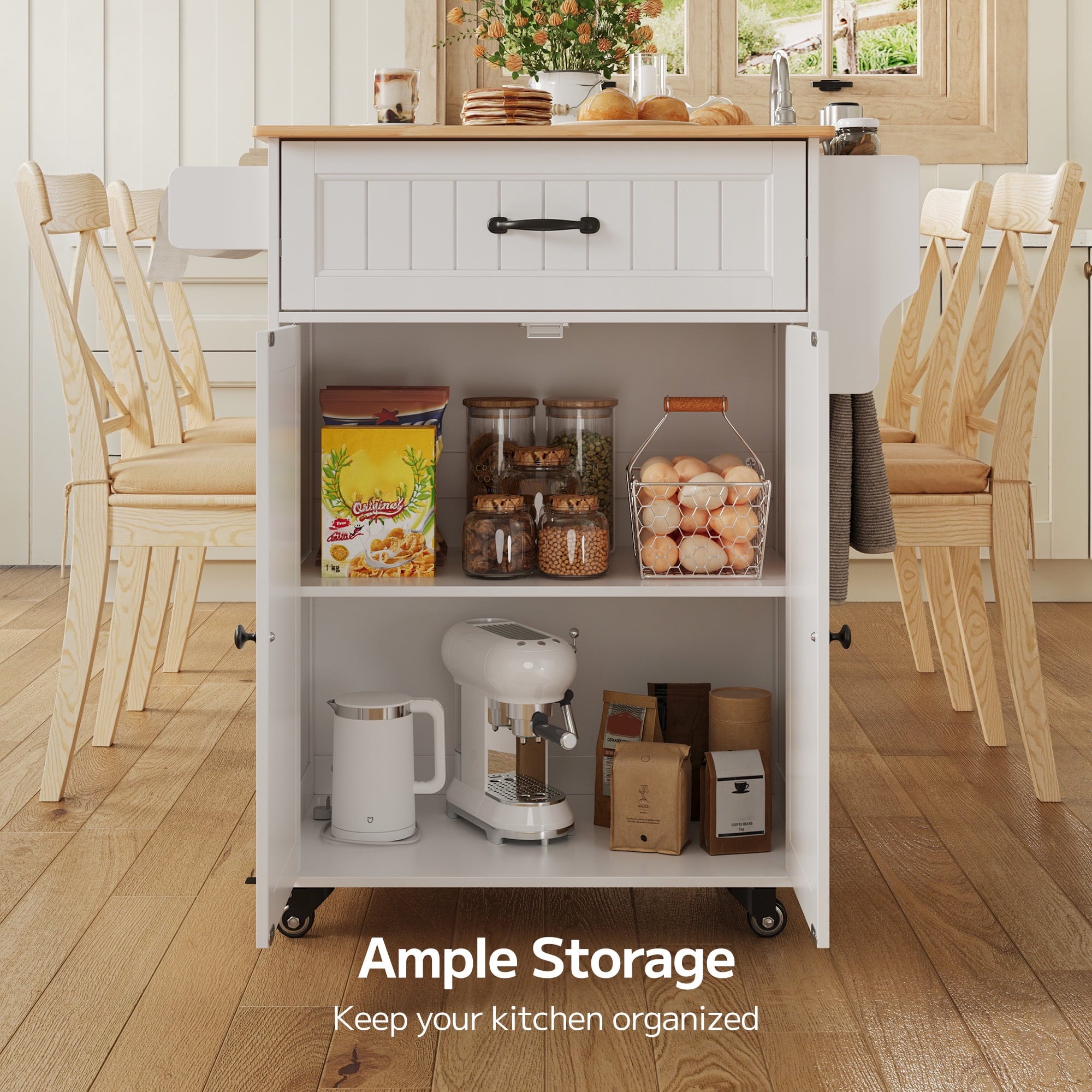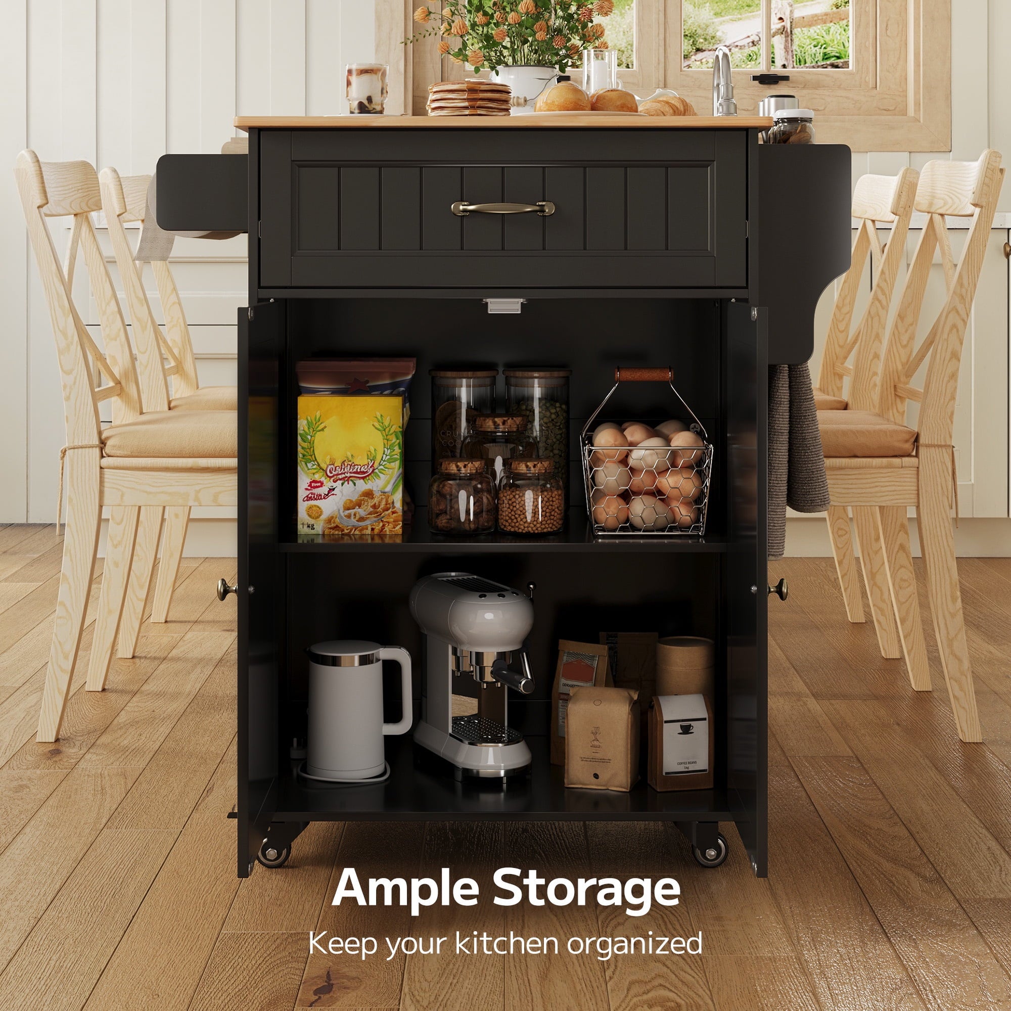 ??【Sturdy Construction】This mobile dining cart is made from high-quality MDF, which is waterproof and moisture-resistant. The top is crafted from thick rubberwood, making it durable and the perfect low-maintenance kitchen companion.