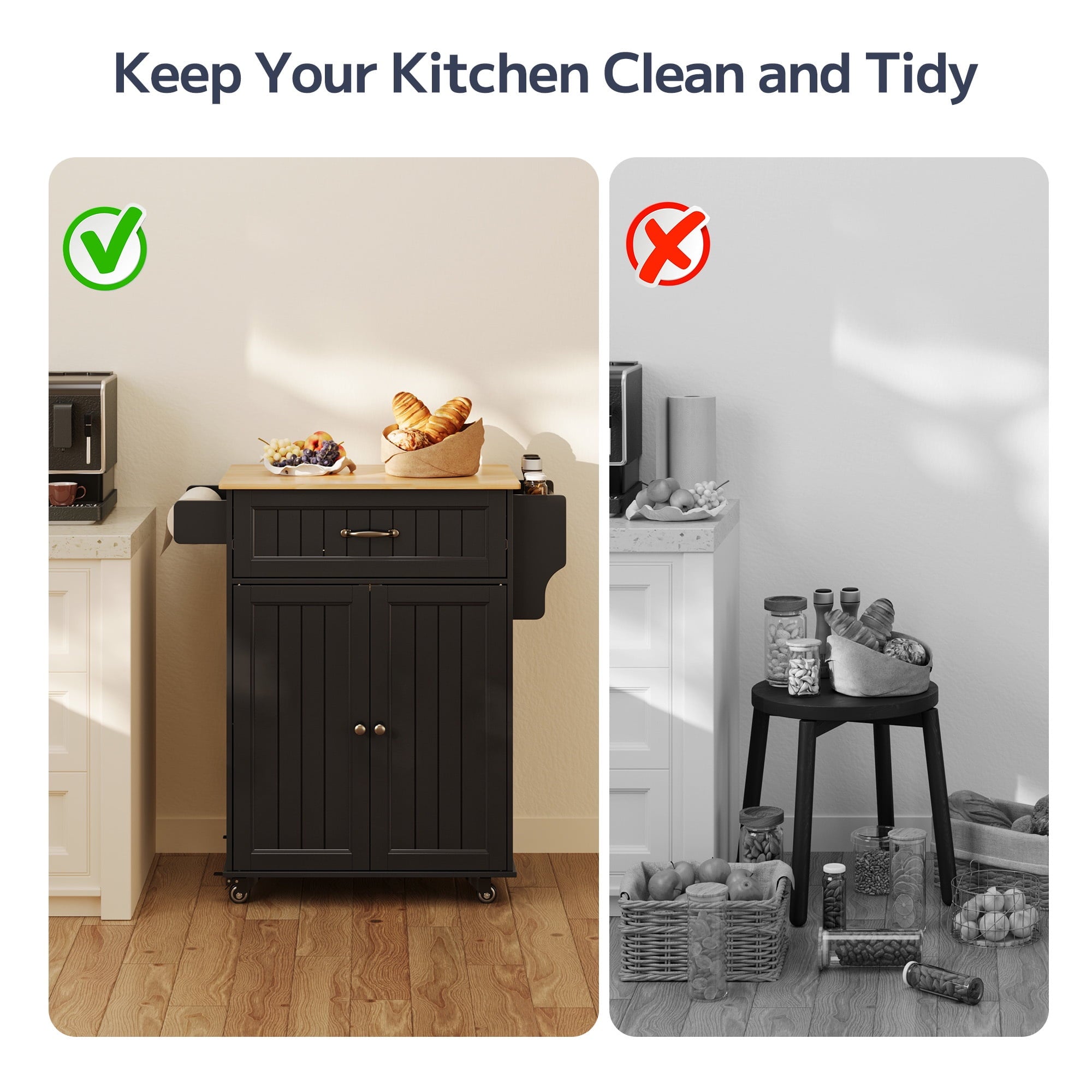 ??【Easy Assembly & Maintenance】This kitchen island cart comes with step-by-step assembly instructions, numbered parts, and hardware, so you won’t need to worry about making mistakes or missing any steps. If you encounter any difficulties, please feel free to contact us; our technical support team is dedicated to assisting you.