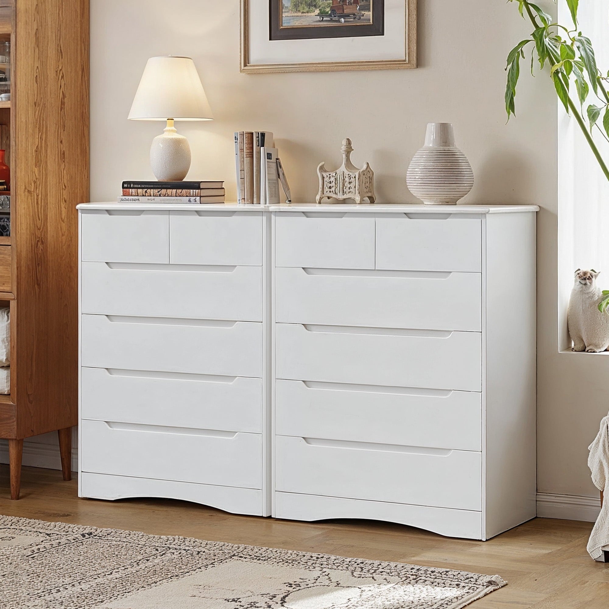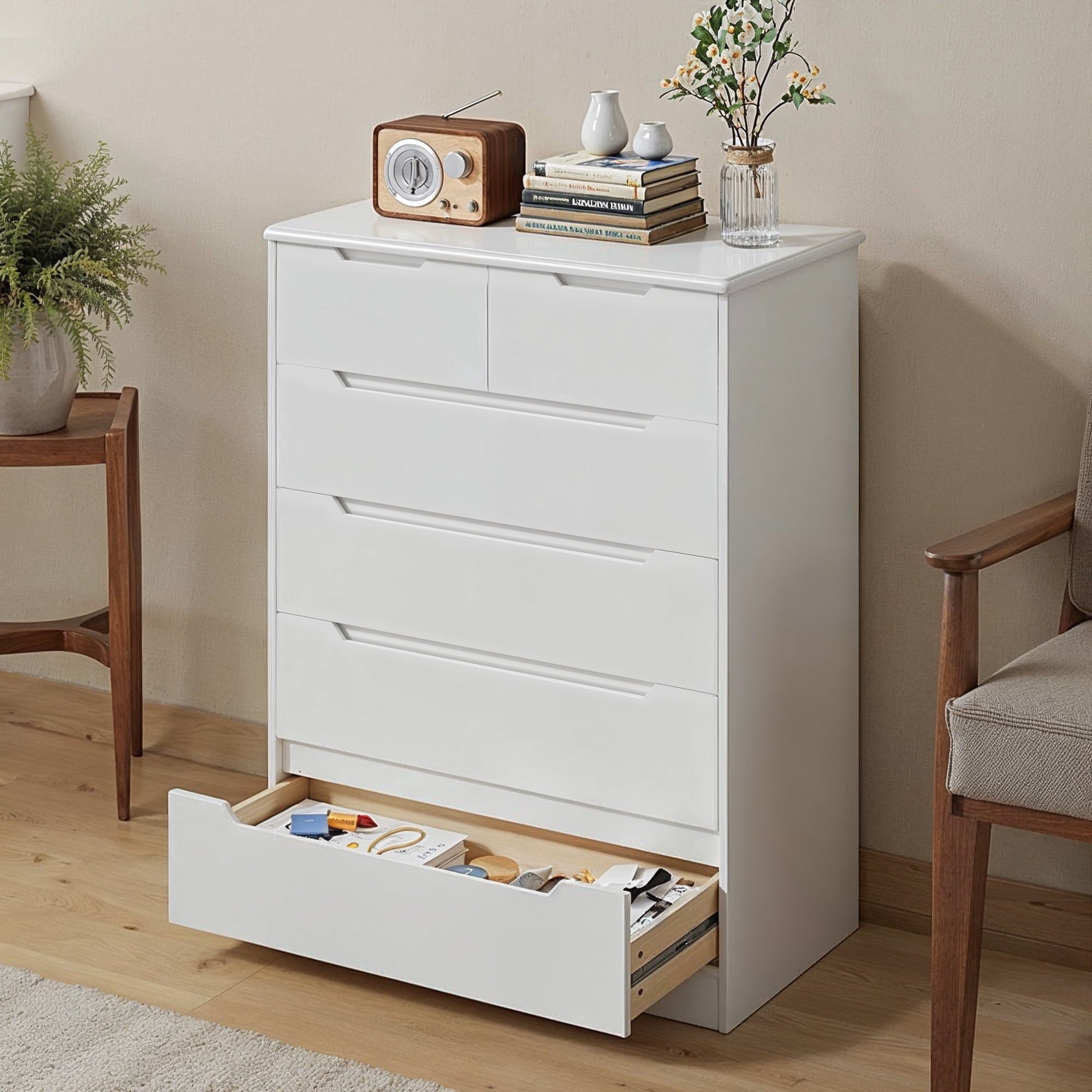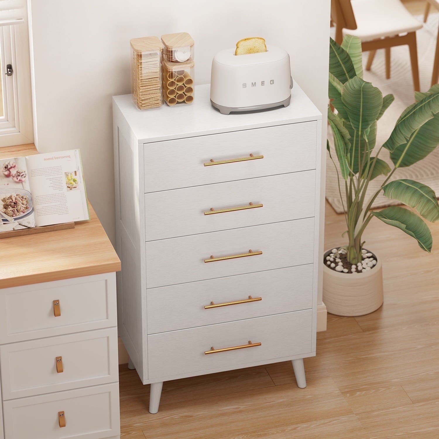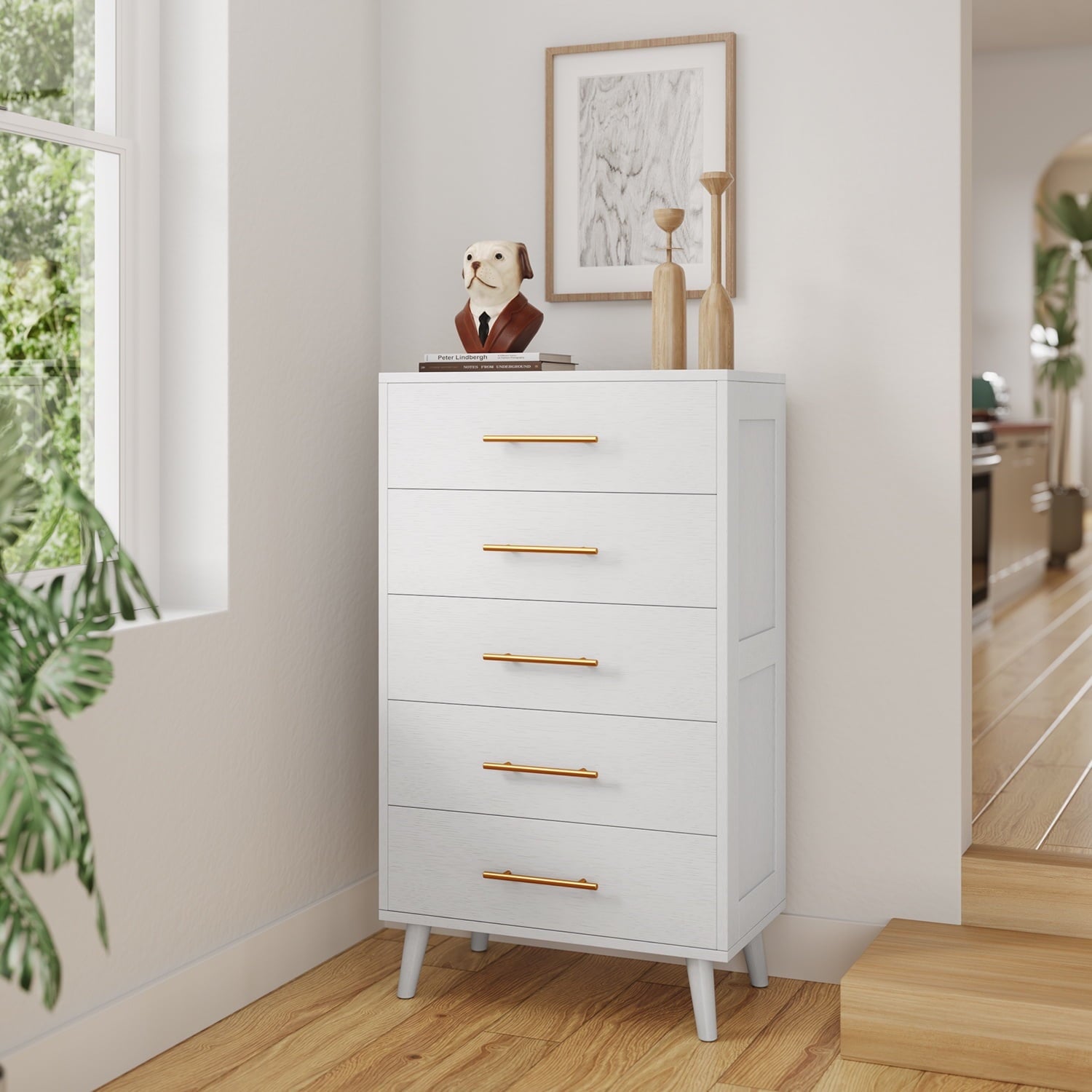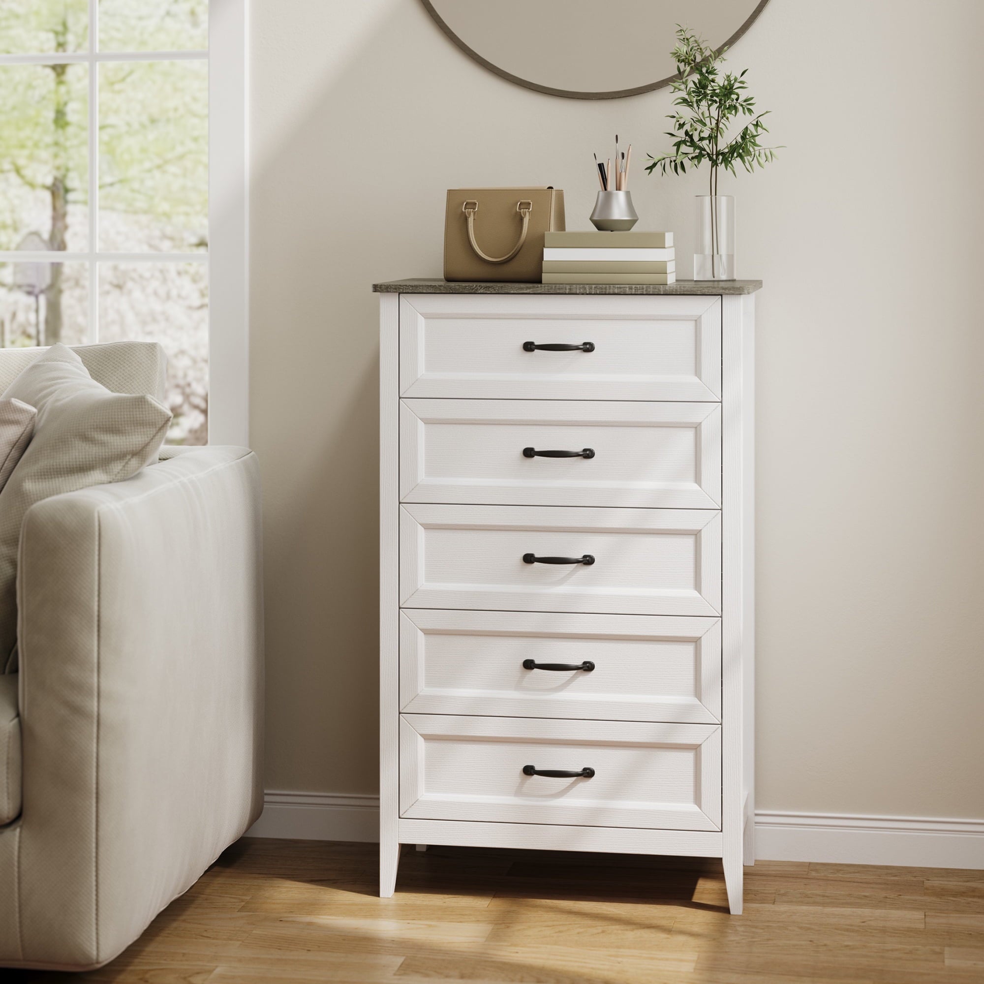 If you need extra storage space at home, you might want to consider the Asofer dressing cabinet. It seamlessly integrates into a modern farmhouse style. Five large drawers provide ample storage for clothes, socks, and children’s toys. The cabinet is made of solid wood, featuring a white finish and vertical stripe craftsmanship that enhances its overall visual appeal. The sturdy top surface is waterproof and scratch-resistant, providing a convenient place for your lamps or other items you wish to display, such as photos, decorations, and plants. Suitable for living rooms, bedrooms, hallways, entryways, closets, nurseries, and more.