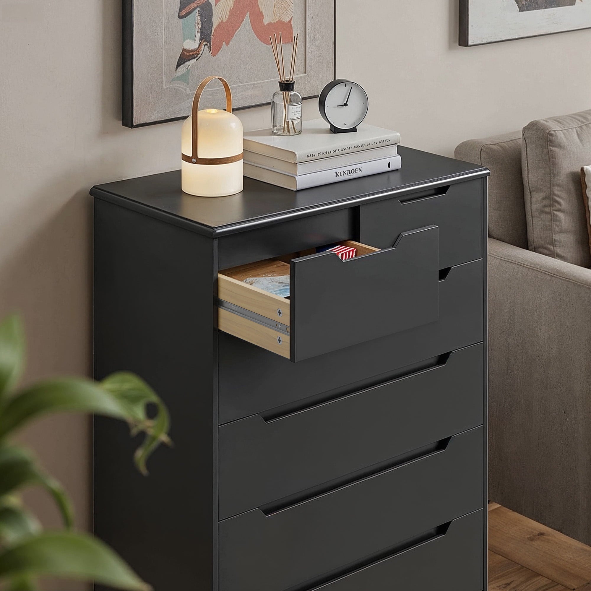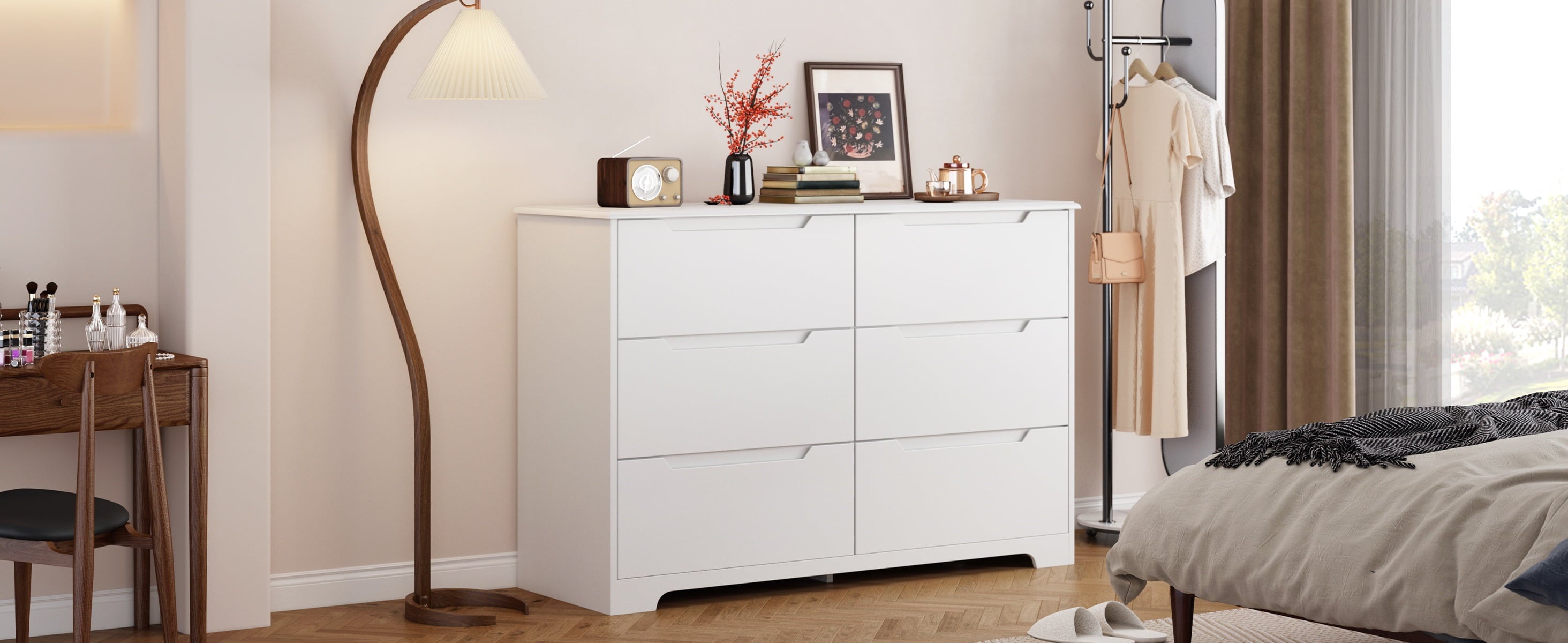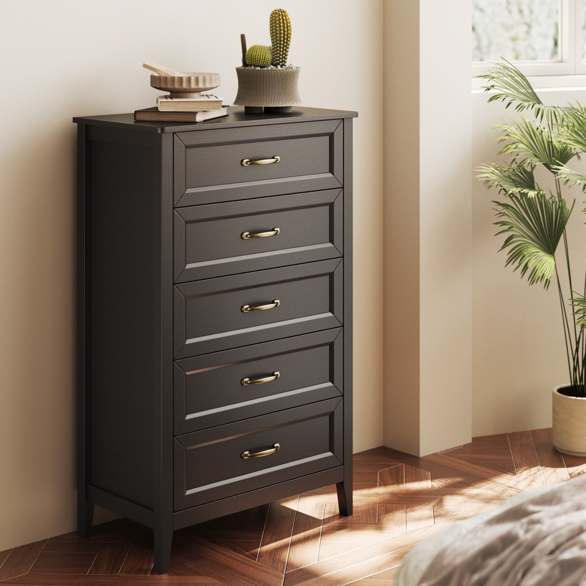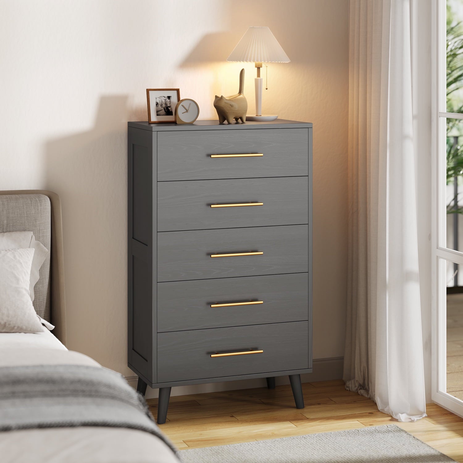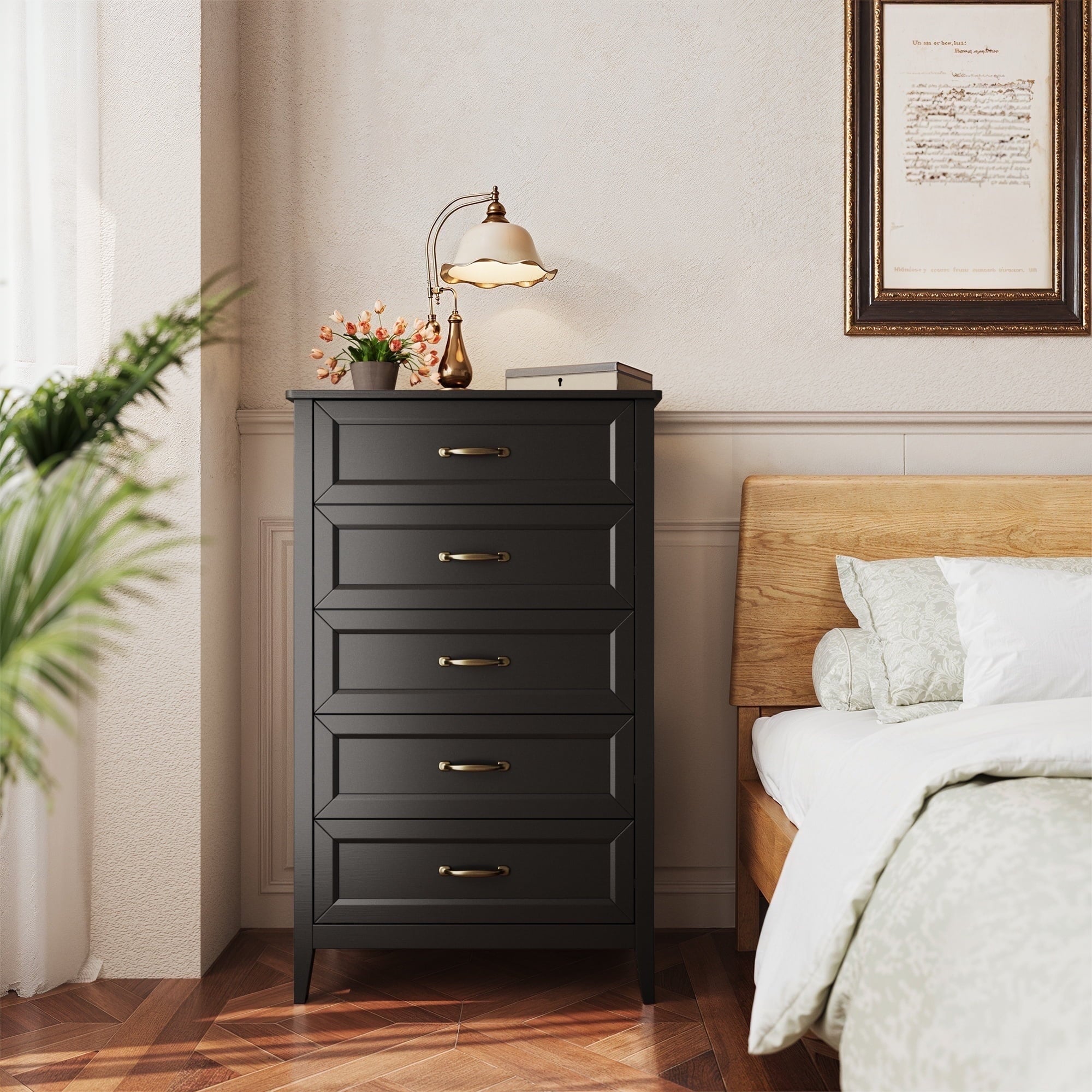 If you need extra storage space at home, you might want to consider the Asofer dressing cabinet. It seamlessly integrates into a modern farmhouse style. Five large drawers provide ample storage for clothes, socks, and children’s toys. The cabinet is made of solid wood, featuring a white finish and vertical stripe craftsmanship that enhances its overall visual appeal. The sturdy top surface is waterproof and scratch-resistant, providing a convenient place for your lamps or other items you wish to display, such as photos, decorations, and plants. Suitable for living rooms, bedrooms, hallways, entryways, closets, nurseries, and more.