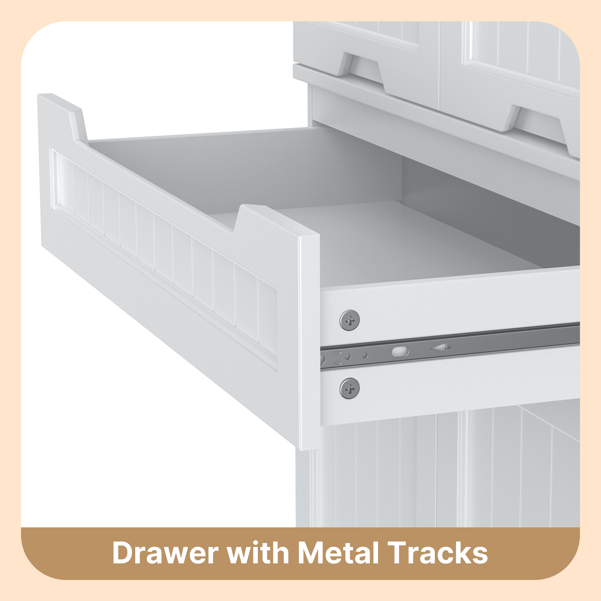 This stunning Asofer storage solution boasts massive capacity featuring two spacious cabinets with shelves, a deep 15″ drawer, and six dedicated shelves behind a chic barn door—perfectly sized for spices, cans, and kitchen essentials. Crafted with premium attention to detail, it includes an anti-tip device, adjustable shelves, smooth-gliding drawers, and a waterproof surface for durability. Its elegant vertical design and no-install hollow handles add instant style to any kitchen, dining room, or living space. Easy to assemble with clear instructions.