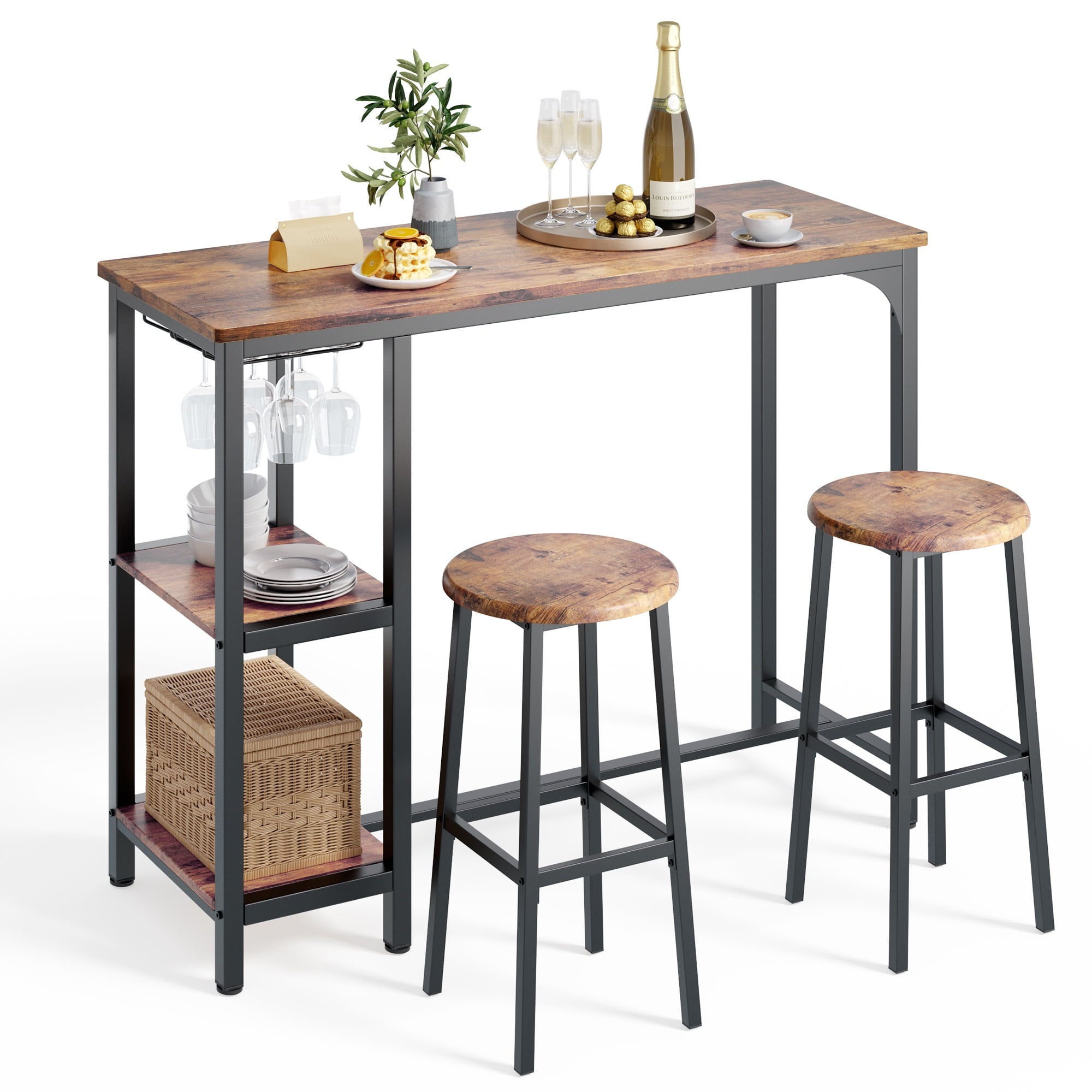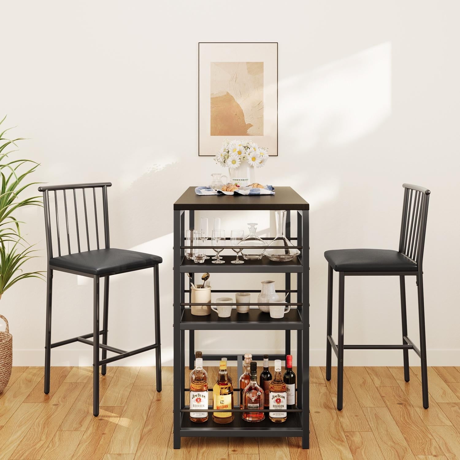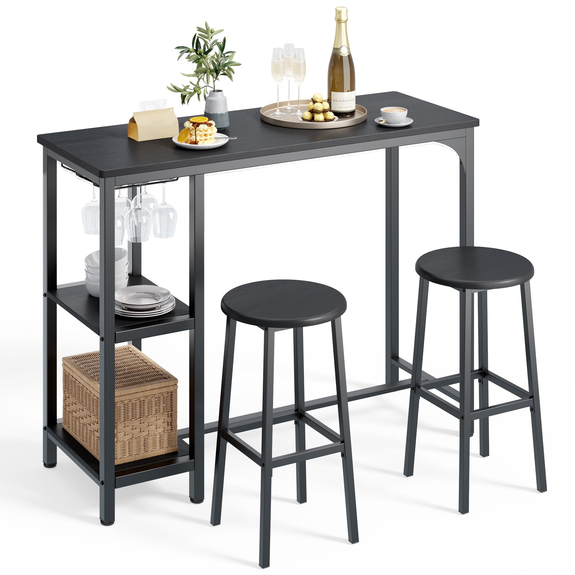 Whether you are working while standing or comfortably sitting down to chat with friends, it is a great choice. Equipped with 3 tiers of storage shelves and a glass shelf, the compact tabletop size is designed to maximize space, providing the perfect storage spots for your dinnerware, cups, snacks, and wine. The steel leg design offers better support and sturdiness, eliminating annoying wobbling. Our bar table set is specially designed for small spaces, allowing you to create your own relaxation area even in limited zones.