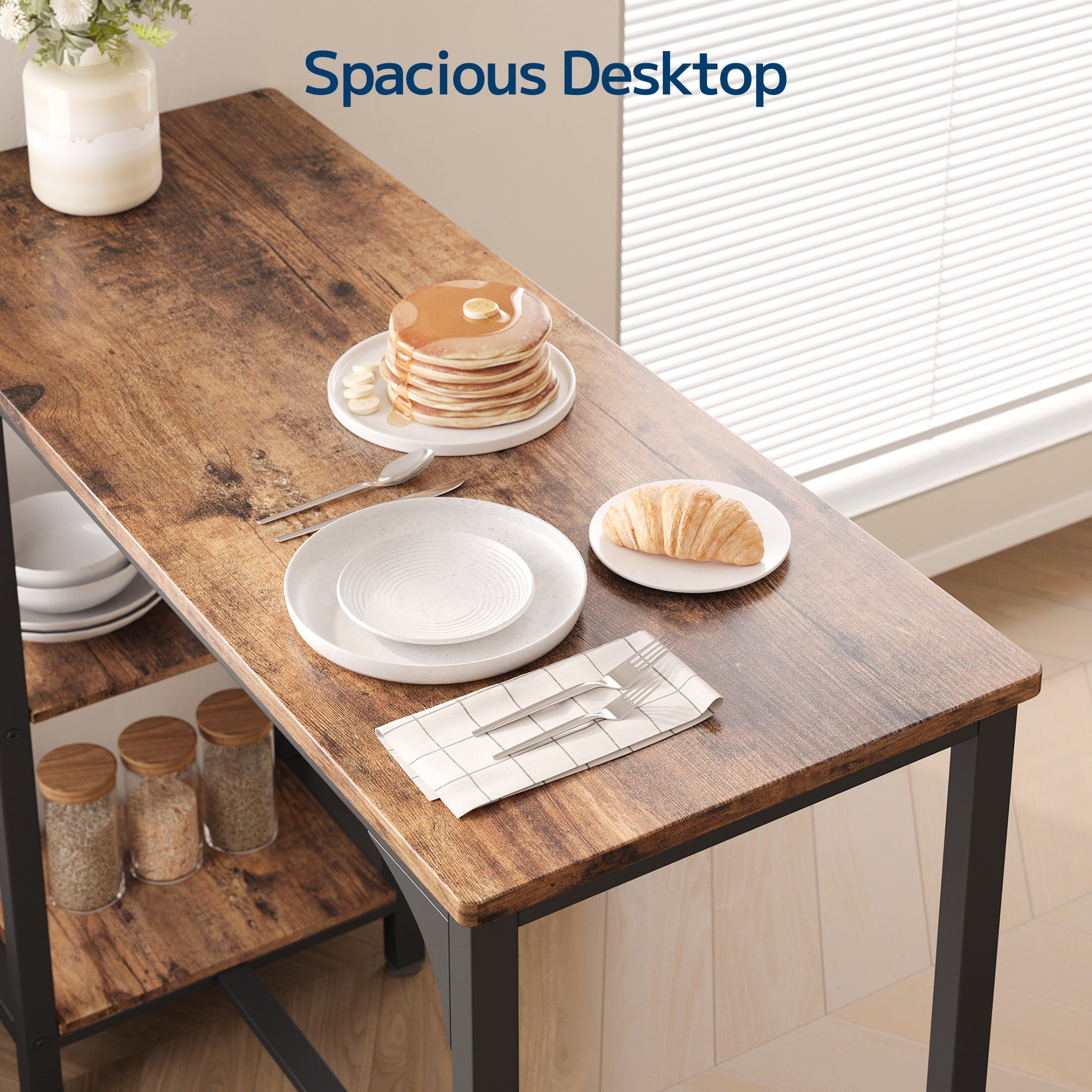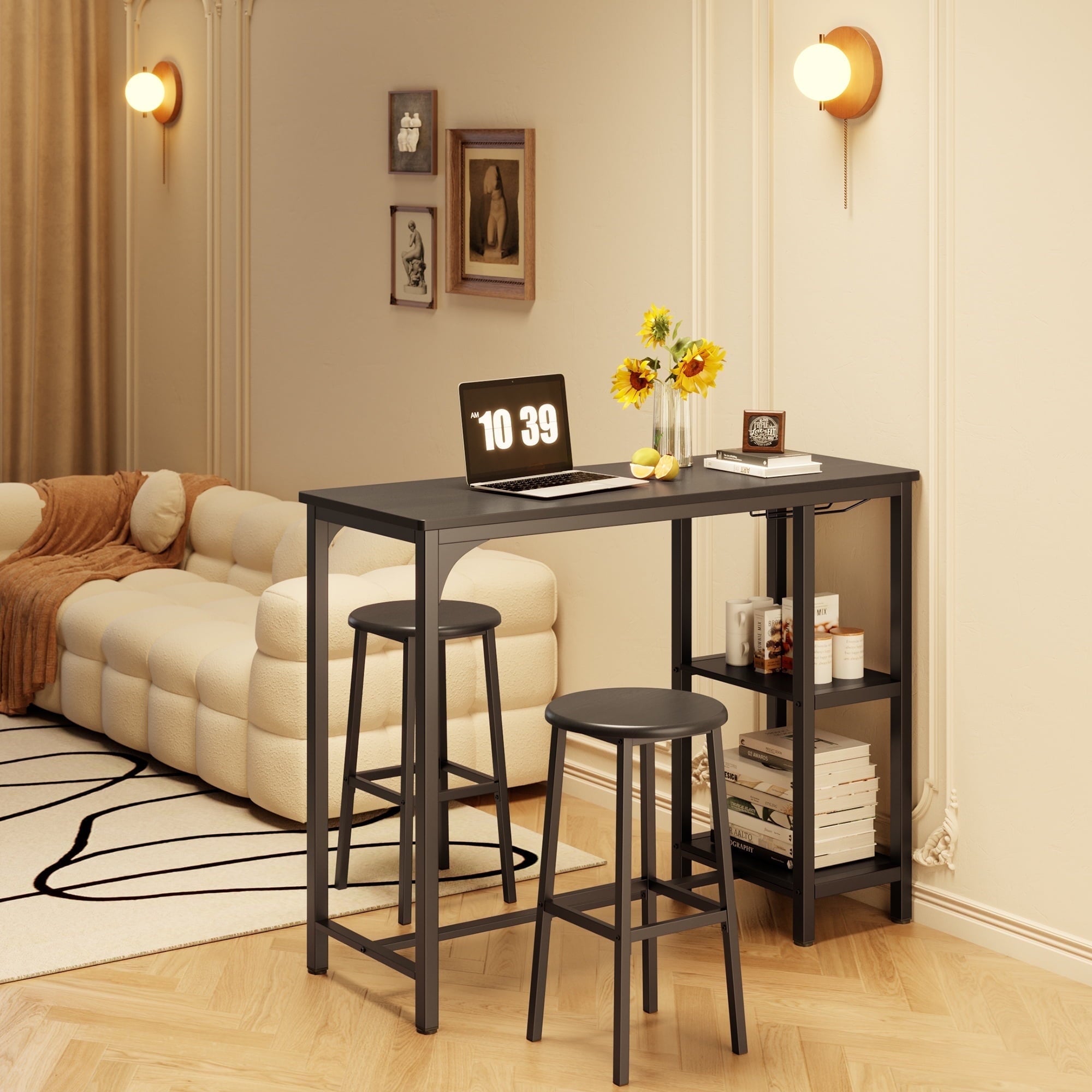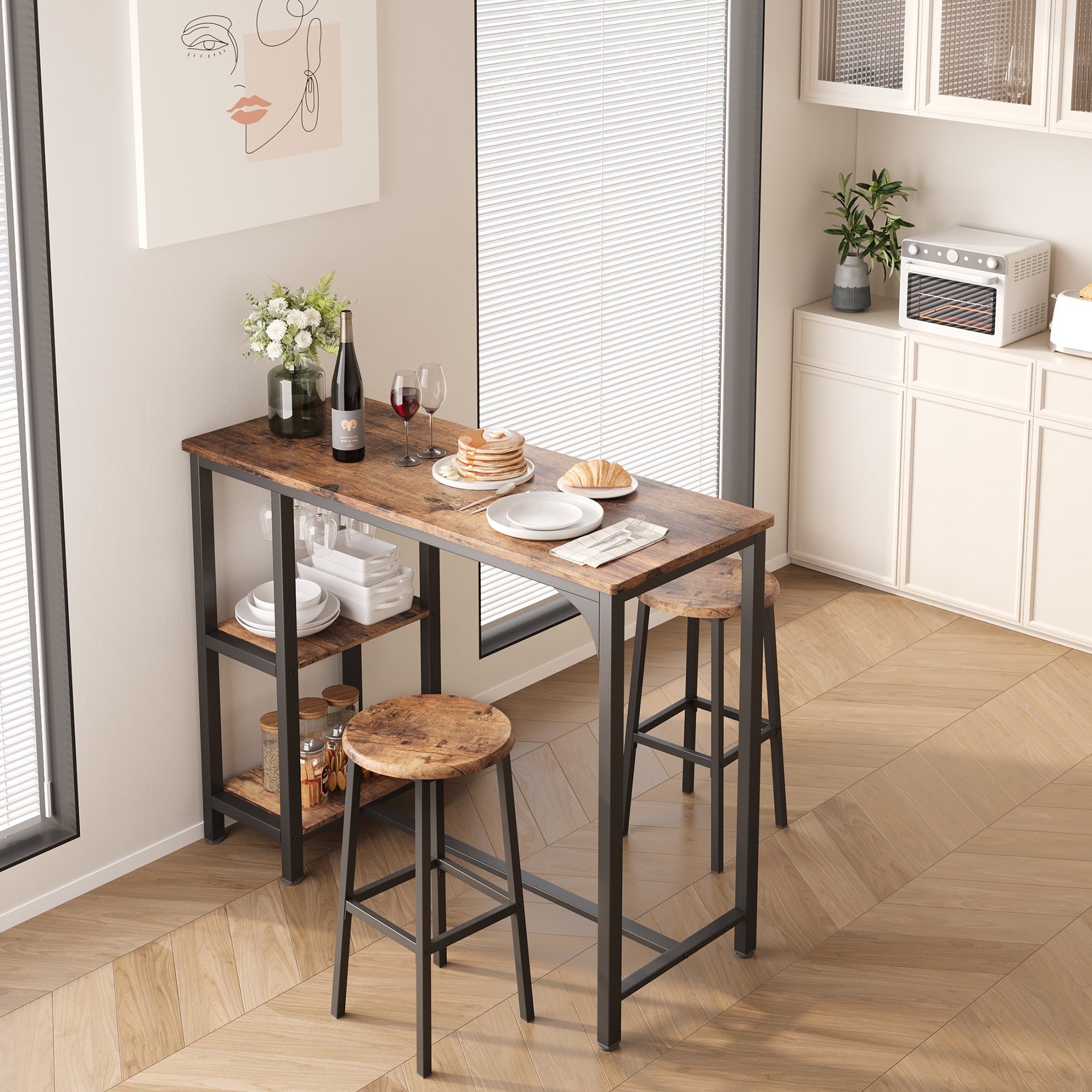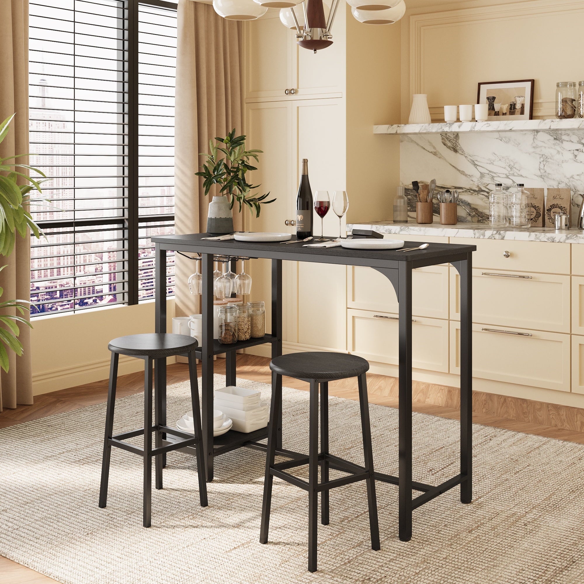 Whether you are working while standing or comfortably sitting down to chat with friends, it is a great choice. Equipped with 3 tiers of storage shelves and a glass shelf, the compact tabletop size is designed to maximize space, providing the perfect storage spots for your dinnerware, cups, snacks, and wine. The steel leg design offers better support and sturdiness, eliminating annoying wobbling. Our bar table set is specially designed for small spaces, allowing you to create your own relaxation area even in limited zones.
