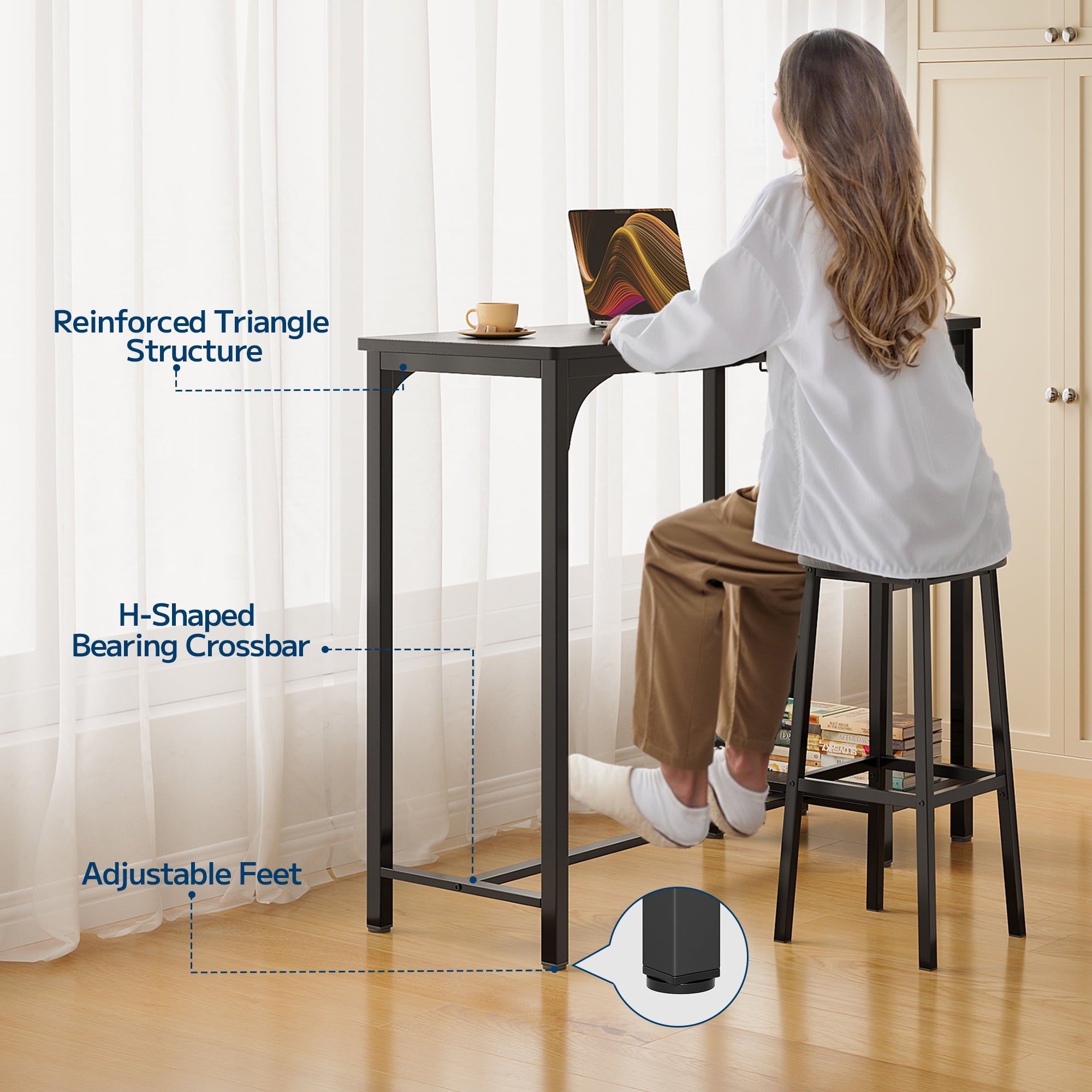 🌼【Comfortable Seating with Ergonomic Design】The great height table and stools create a relaxing atmosphere. The low crossbeam of table provides all-around support for your feet, promoting a healthy posture and reducing fatigue even after extended use. Bar table legs are height adjustable to keep the table stable.