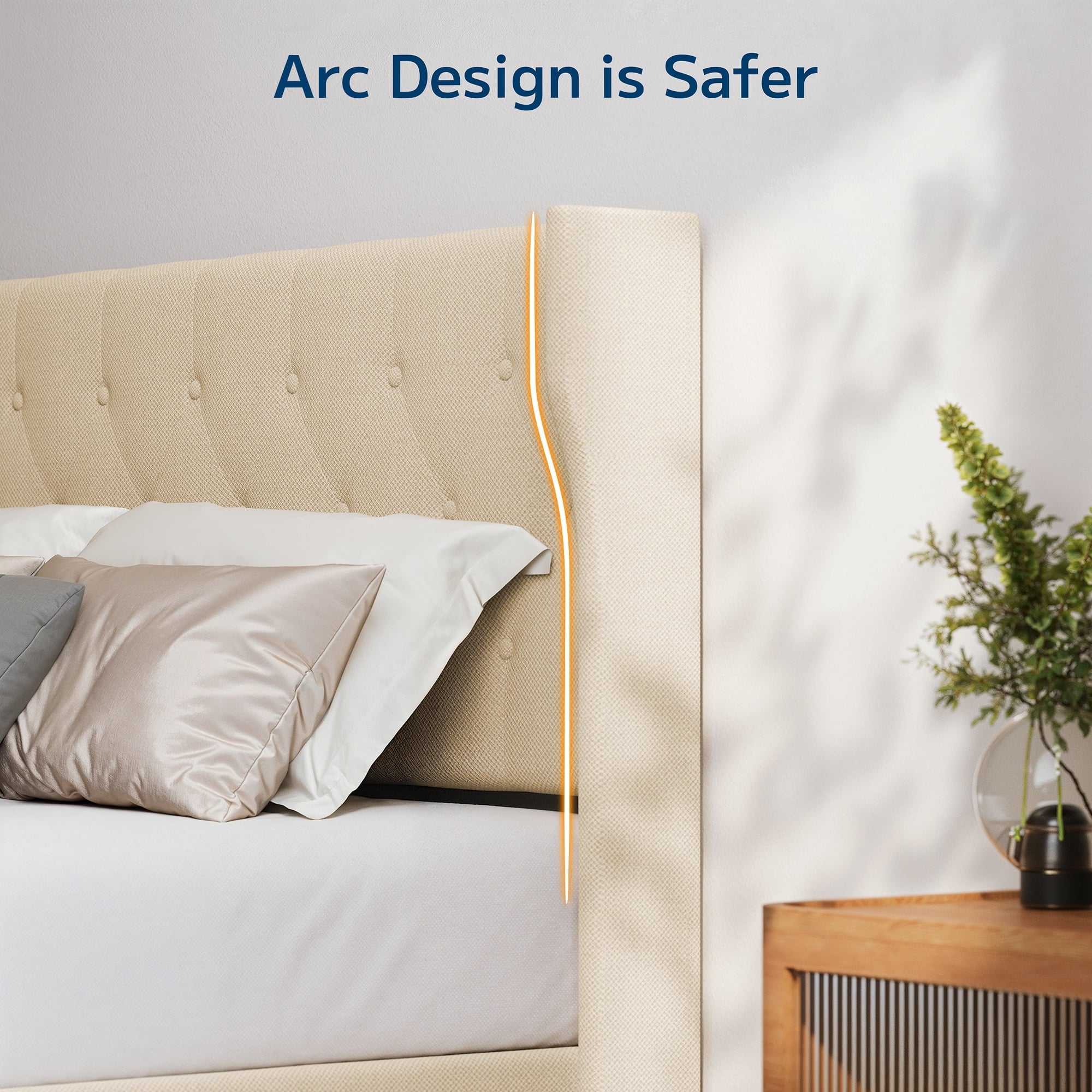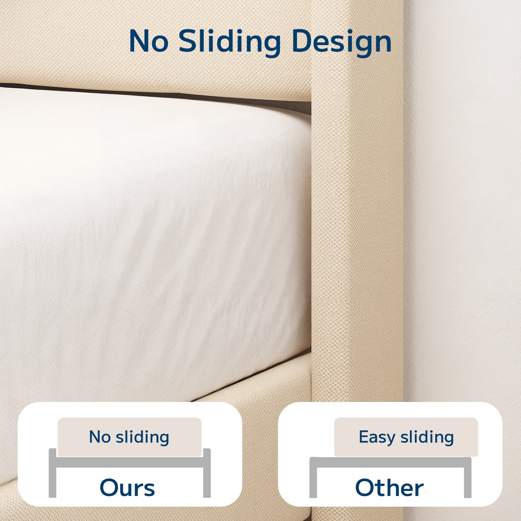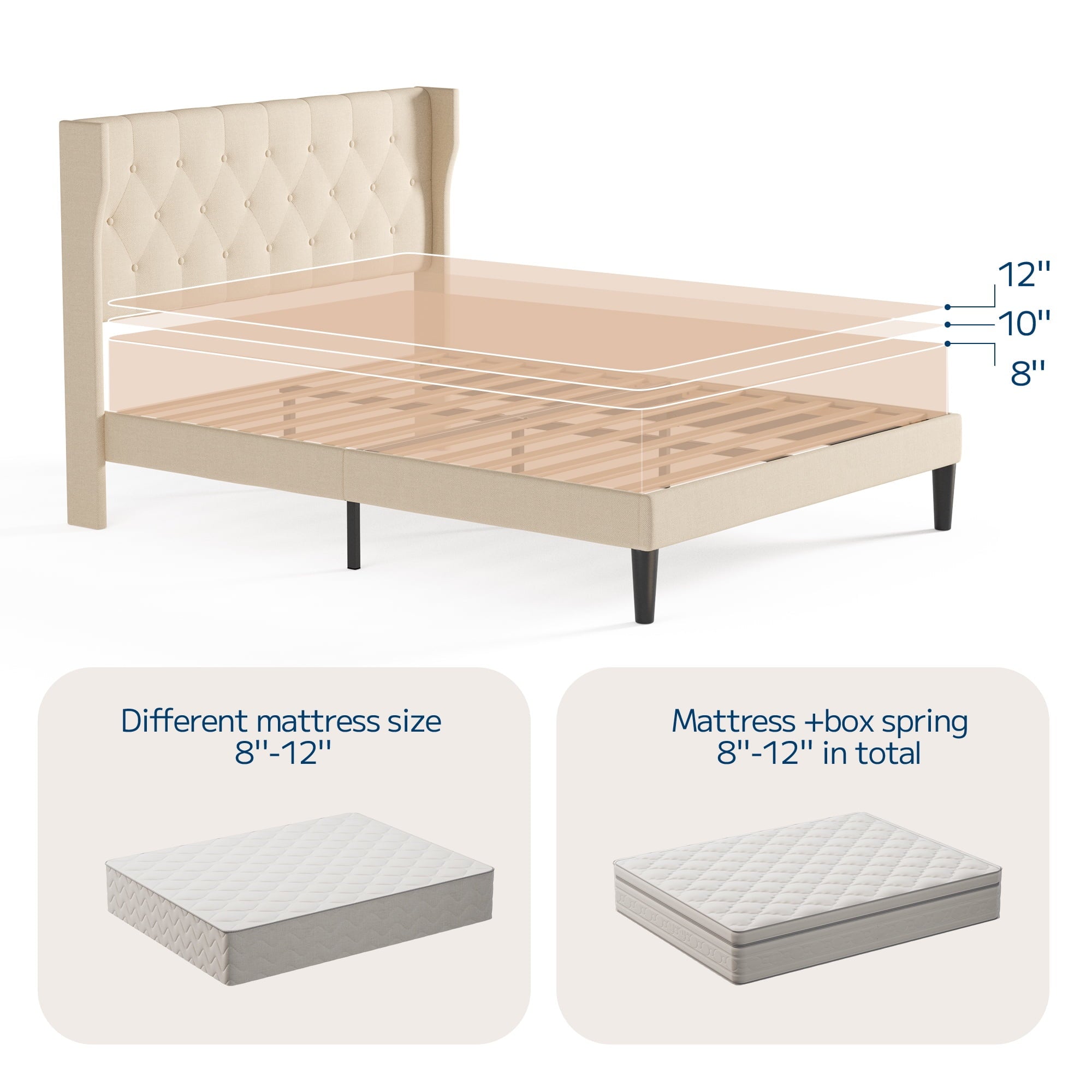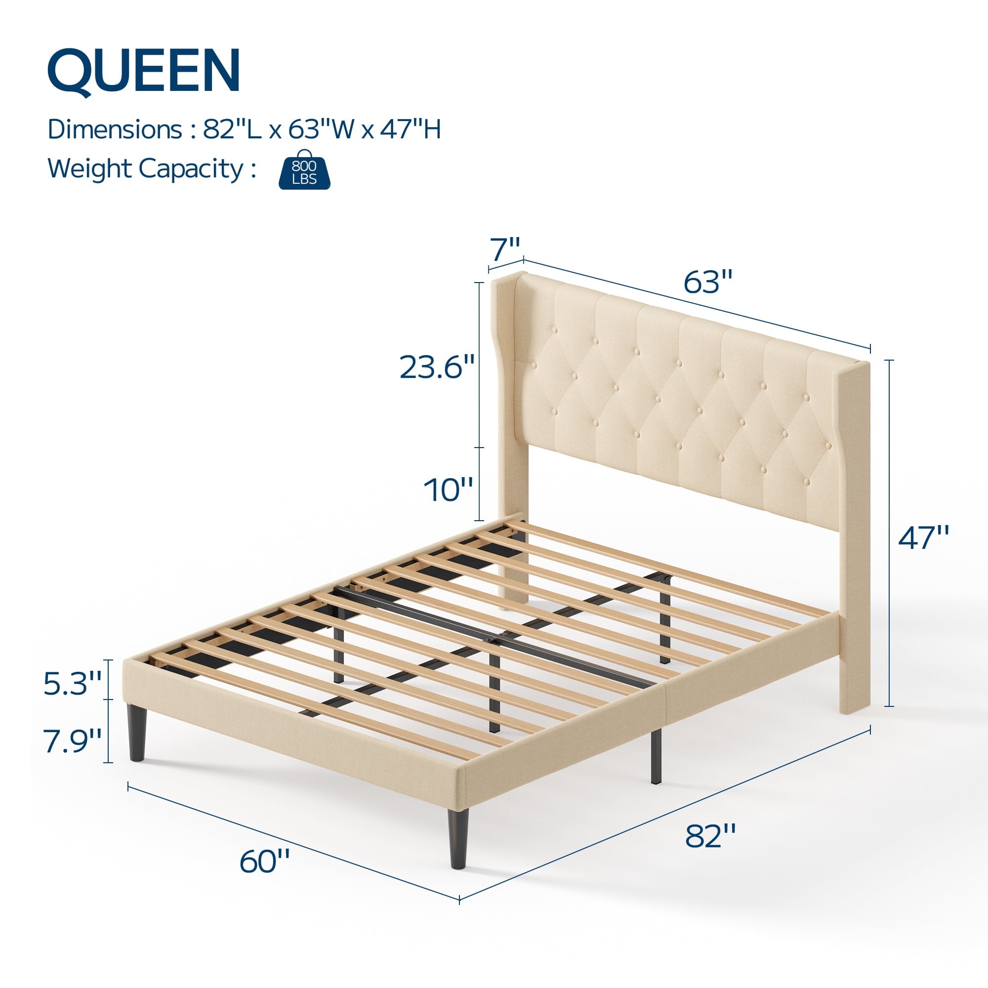 This queen bed frame features a thoughtfully designed headboard made from linen fabric for comfort and breathability; this queen size bed frame is made from waterproof MDF and a sturdy metal frame that’s easy to clean and stable, with a central support bar The thoughtful design of foam strips and protective foot pads on each support leg minimizes noise and adds comfort to your life when you choose this queen bed frame.