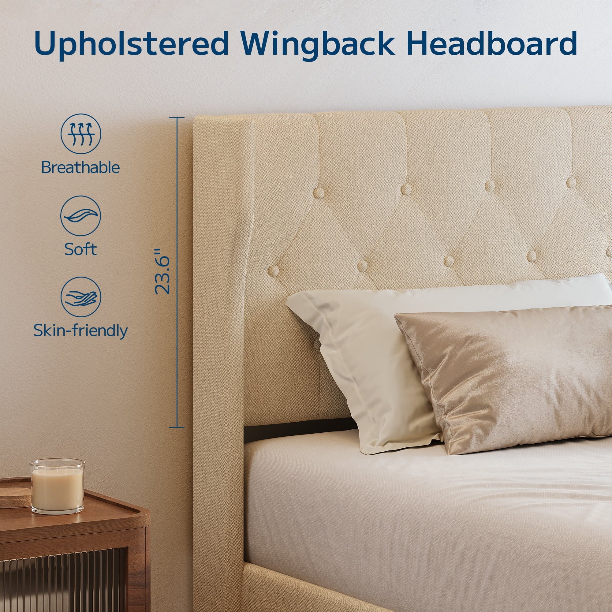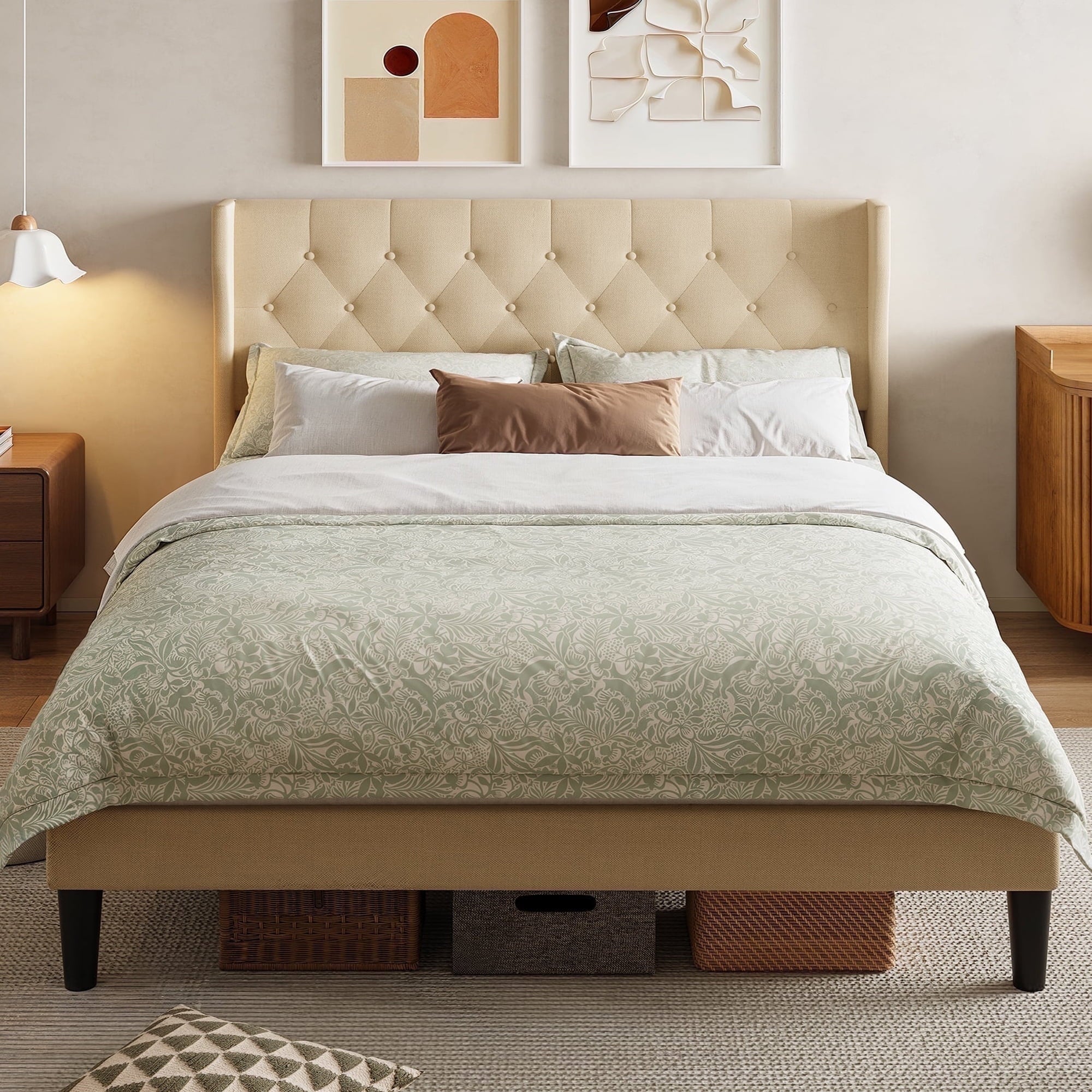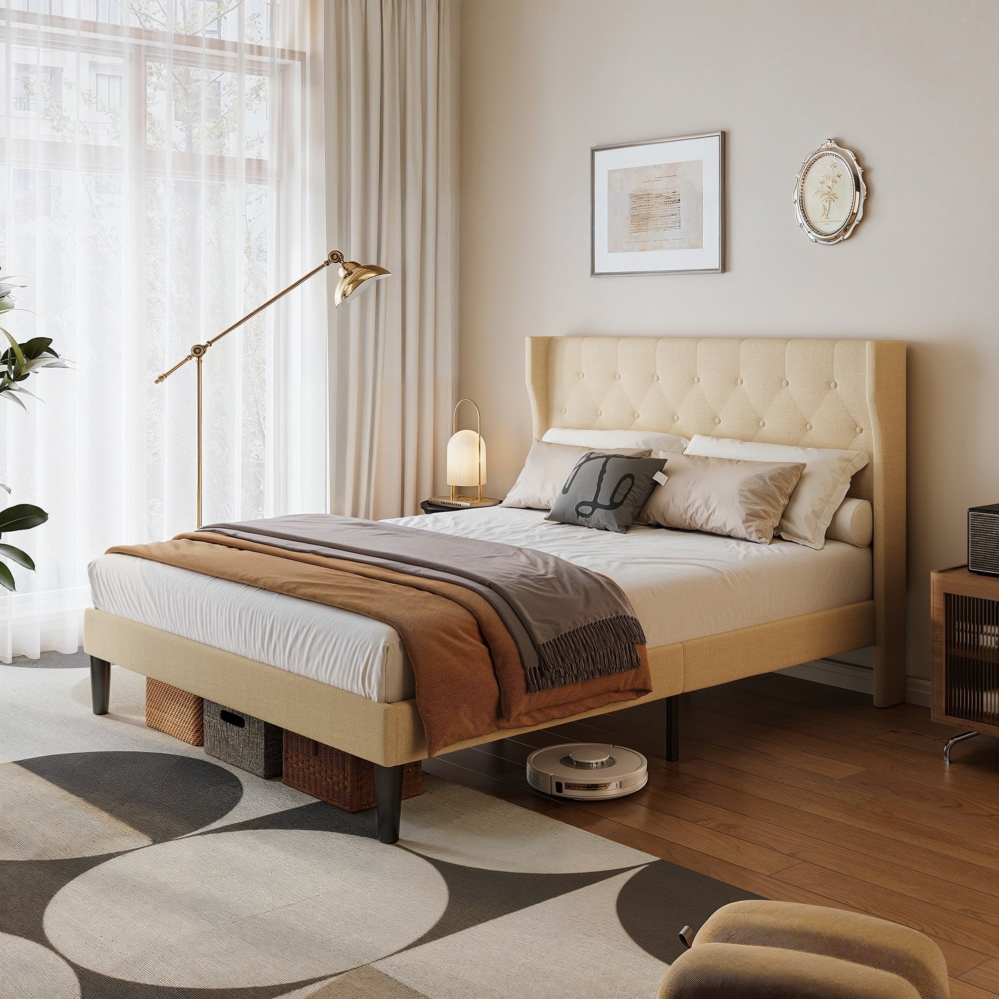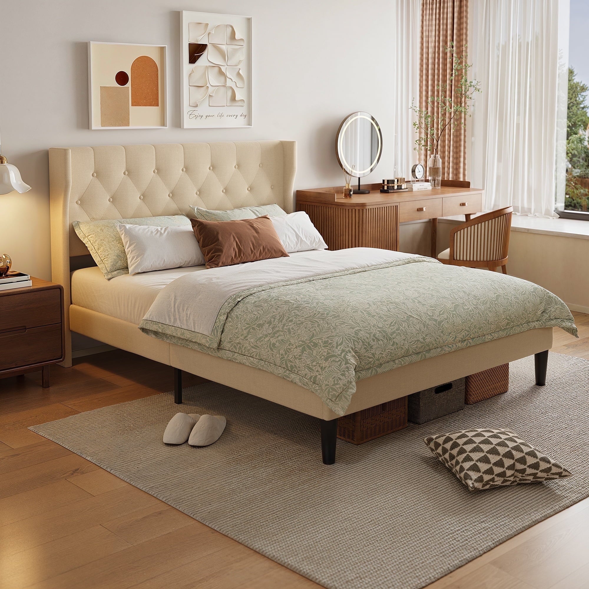 🏡【Upholstered Bed Frame】A full-sized bed frame with a headboard, upholstered in premium linen fabric that is soft to the touch and gentle on the skin, offering comfort and relaxation for restful nights.