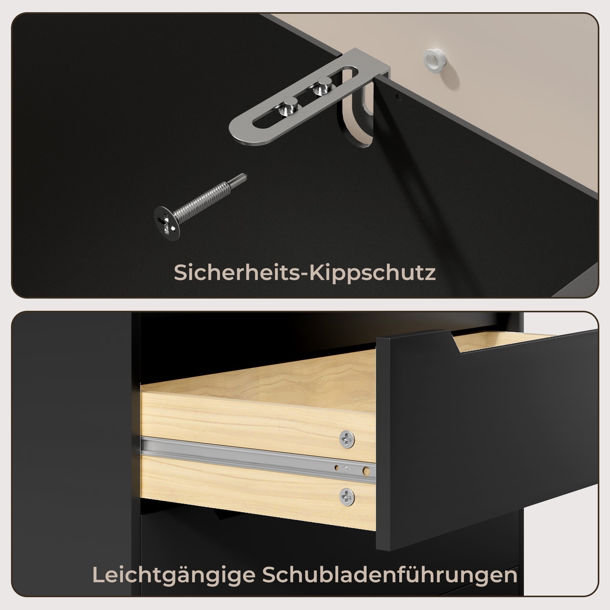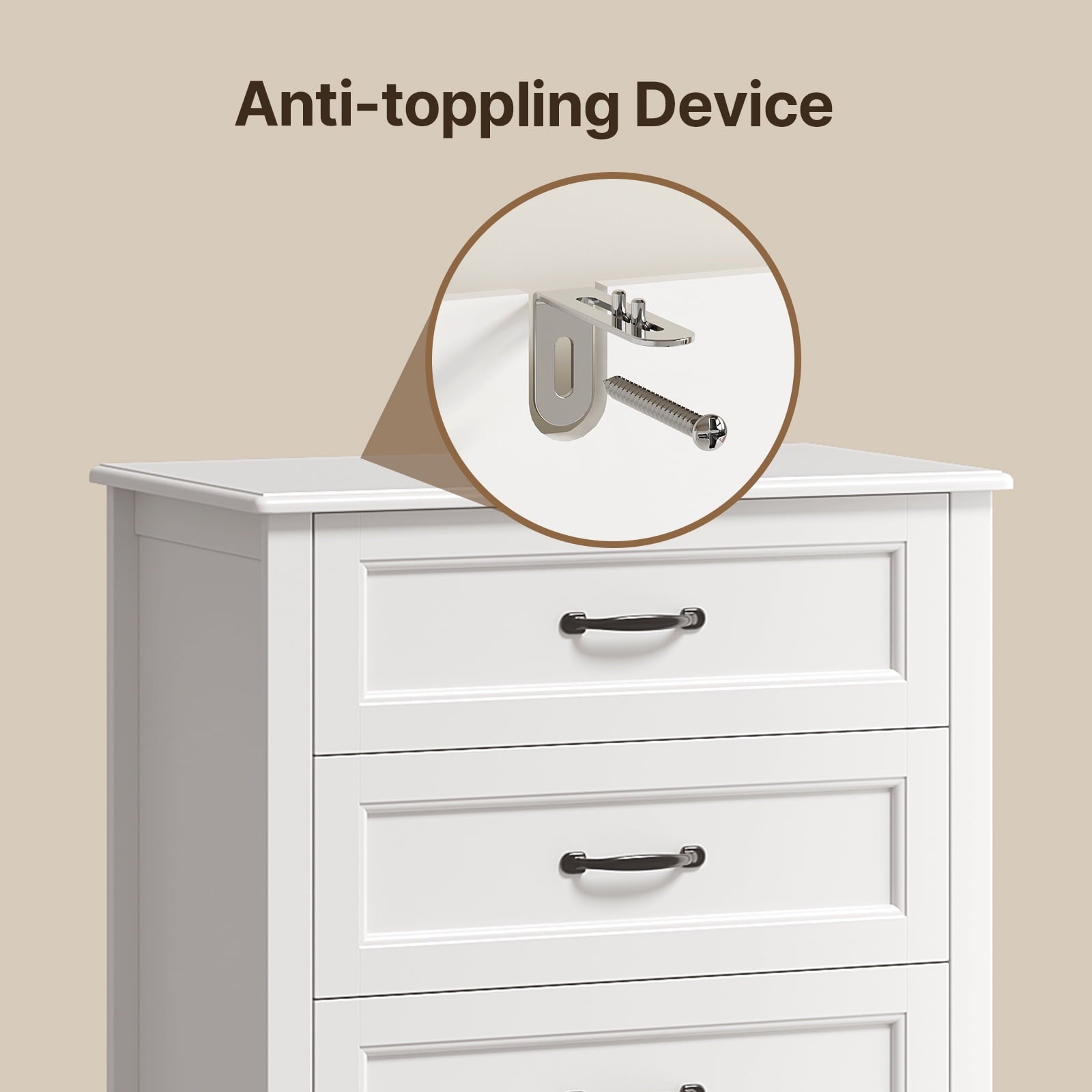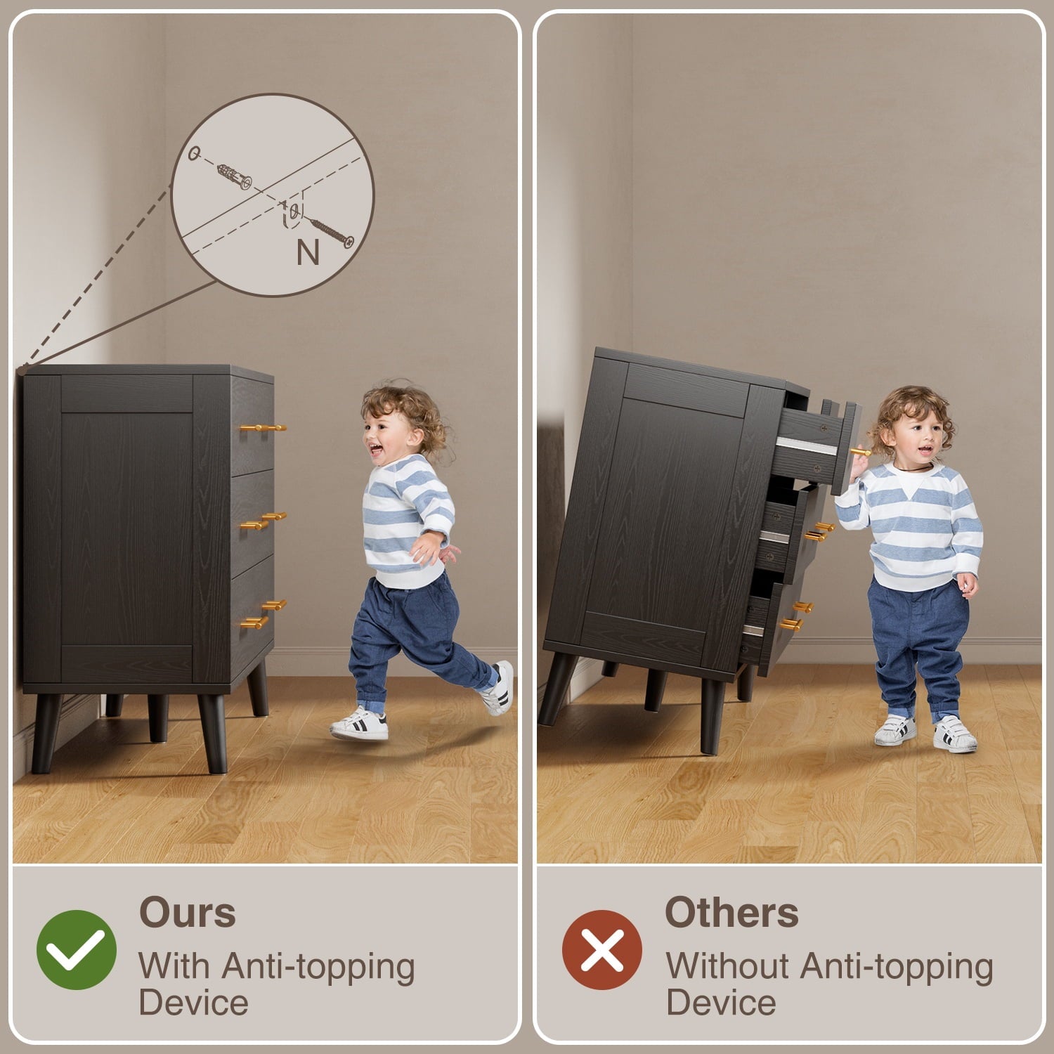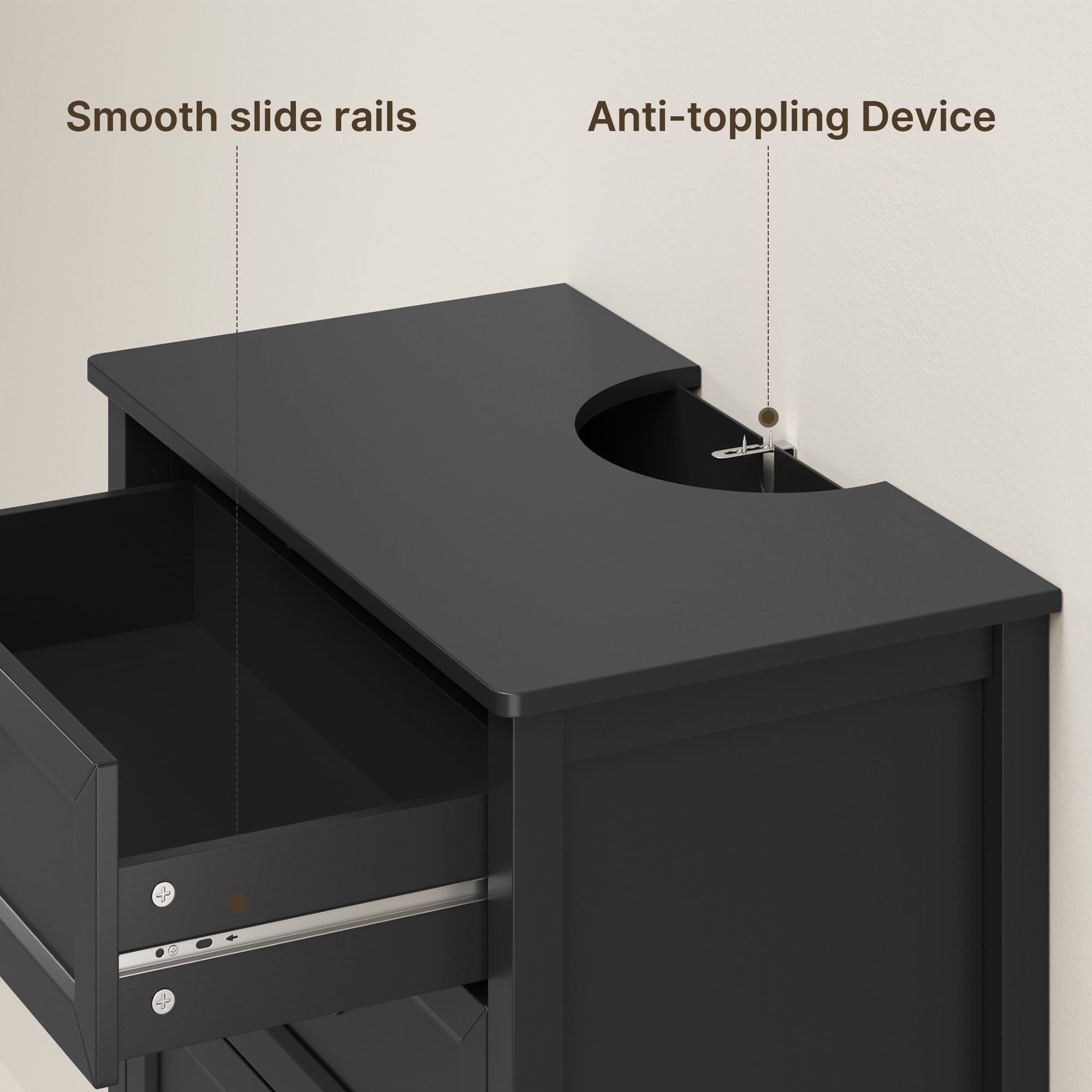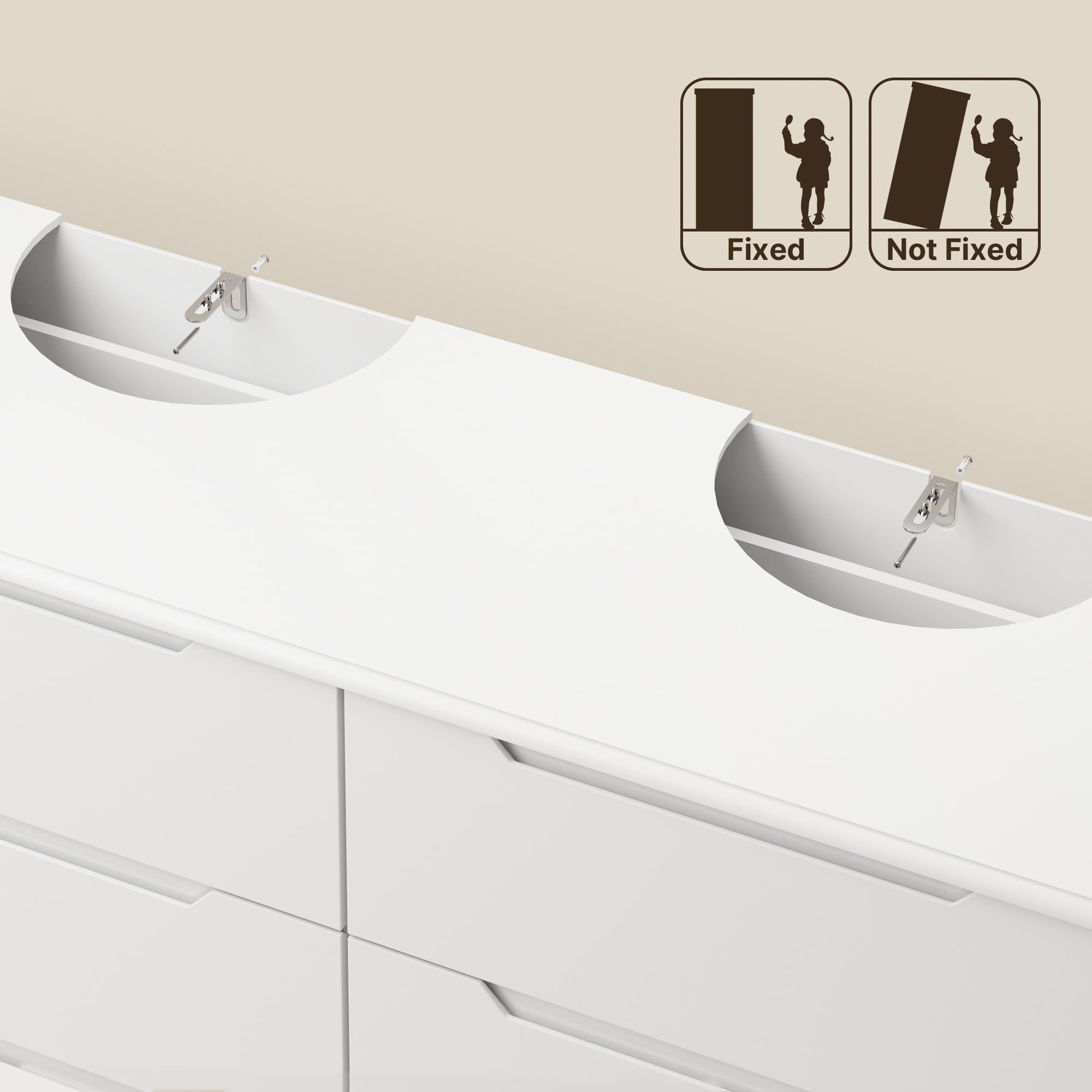 Sturdy & Safe: Anti-tip kit included; water-resistant MDF surface.