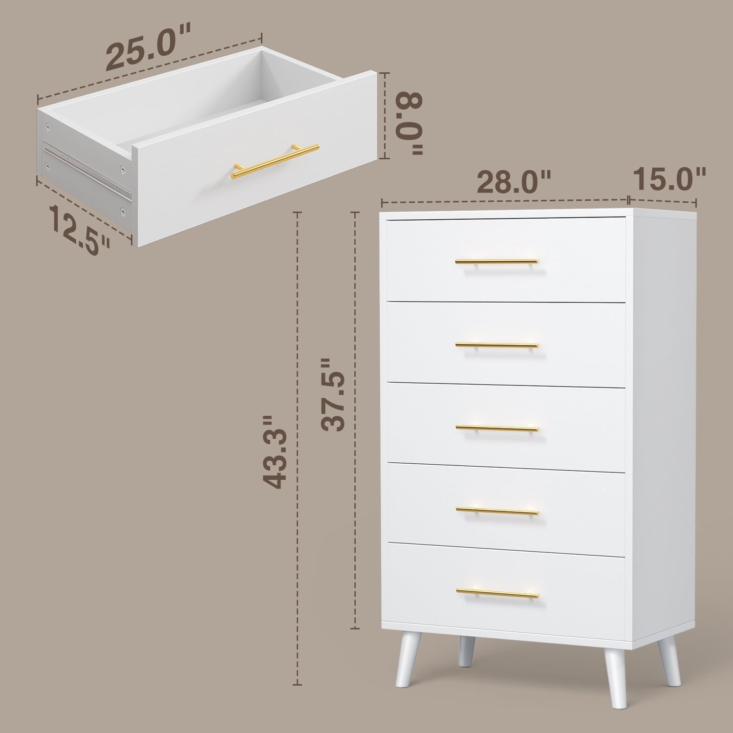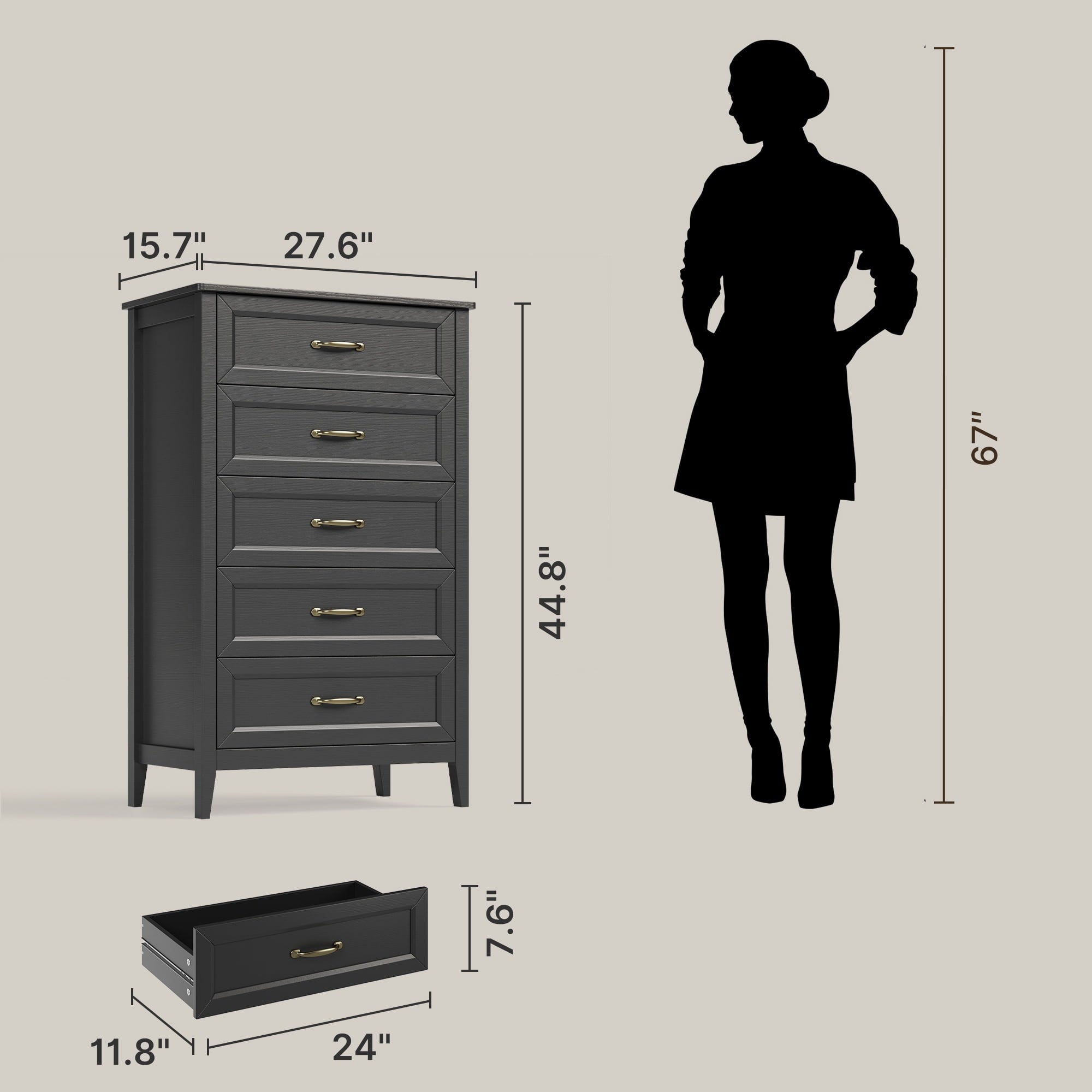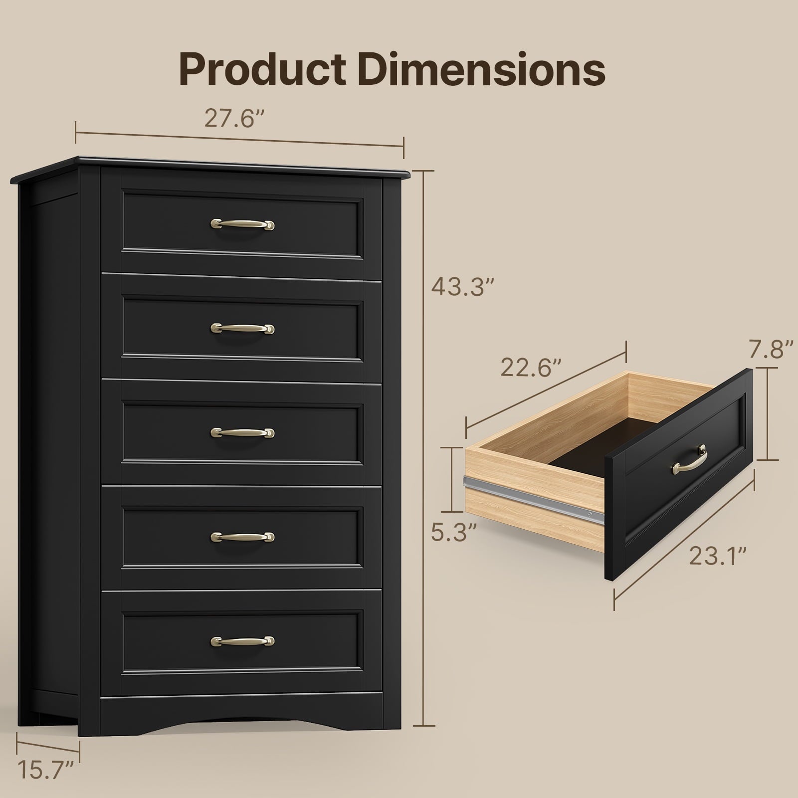 Spacious Storage: 5 smooth-gliding drawers (15.7″D x 23.1″W x 7.8″H).