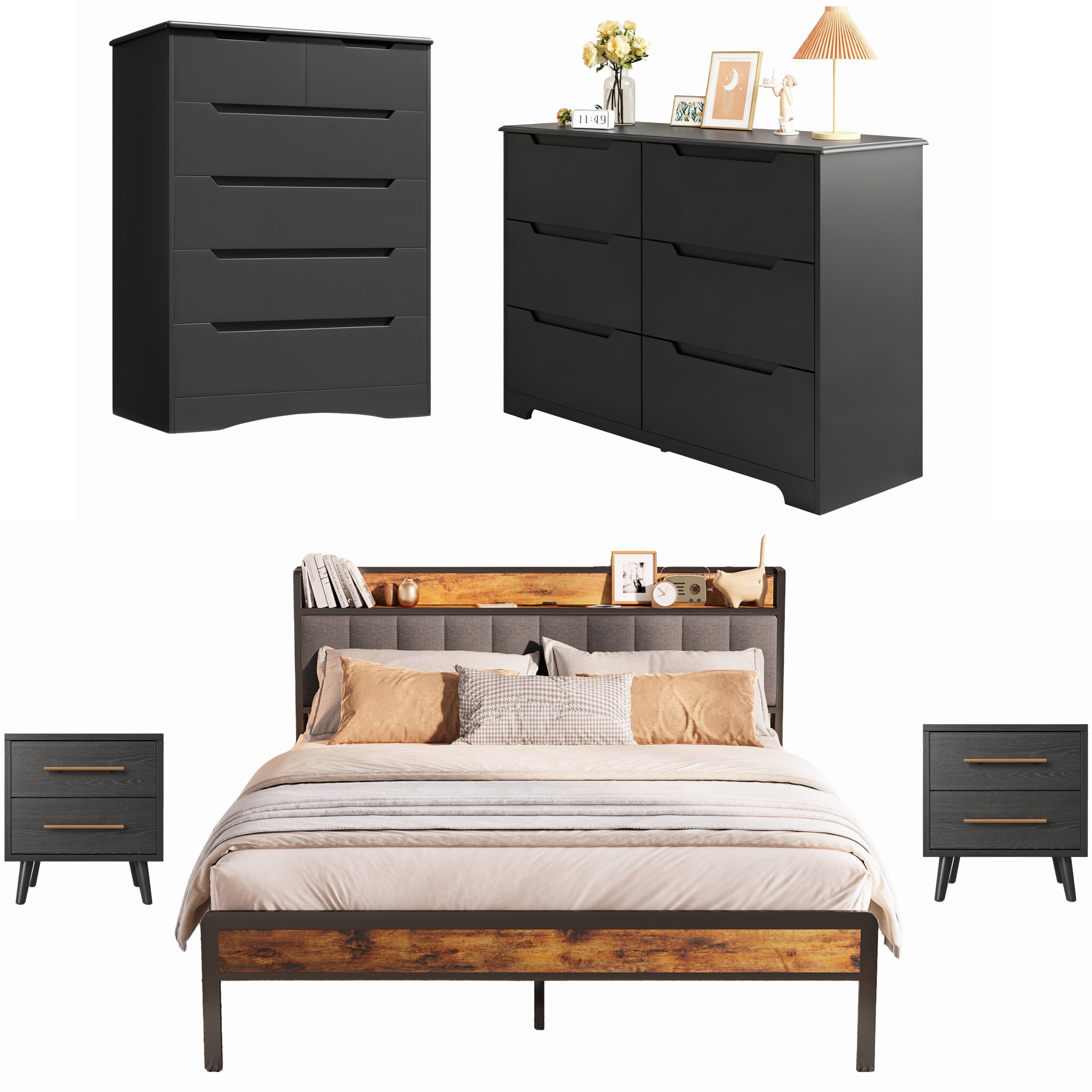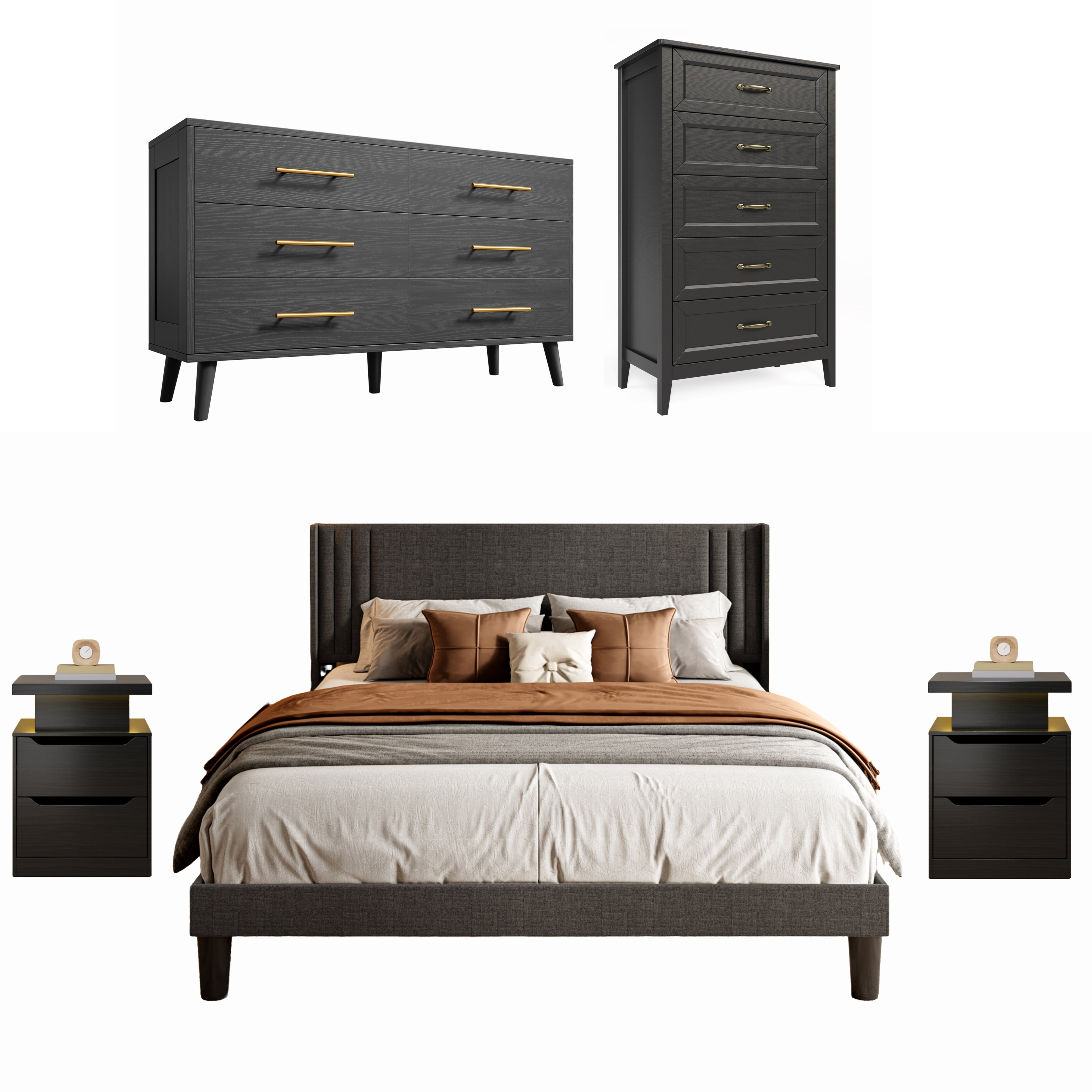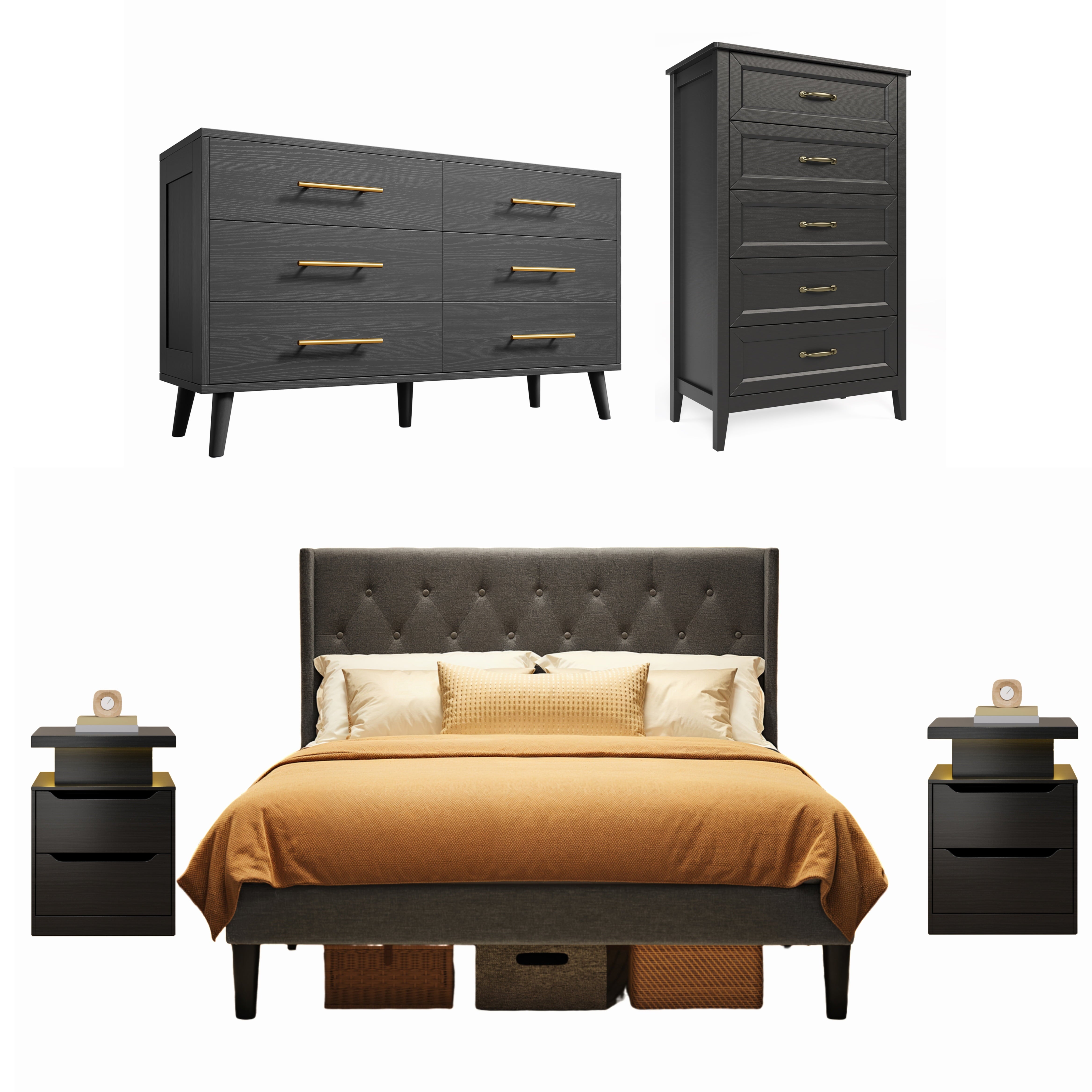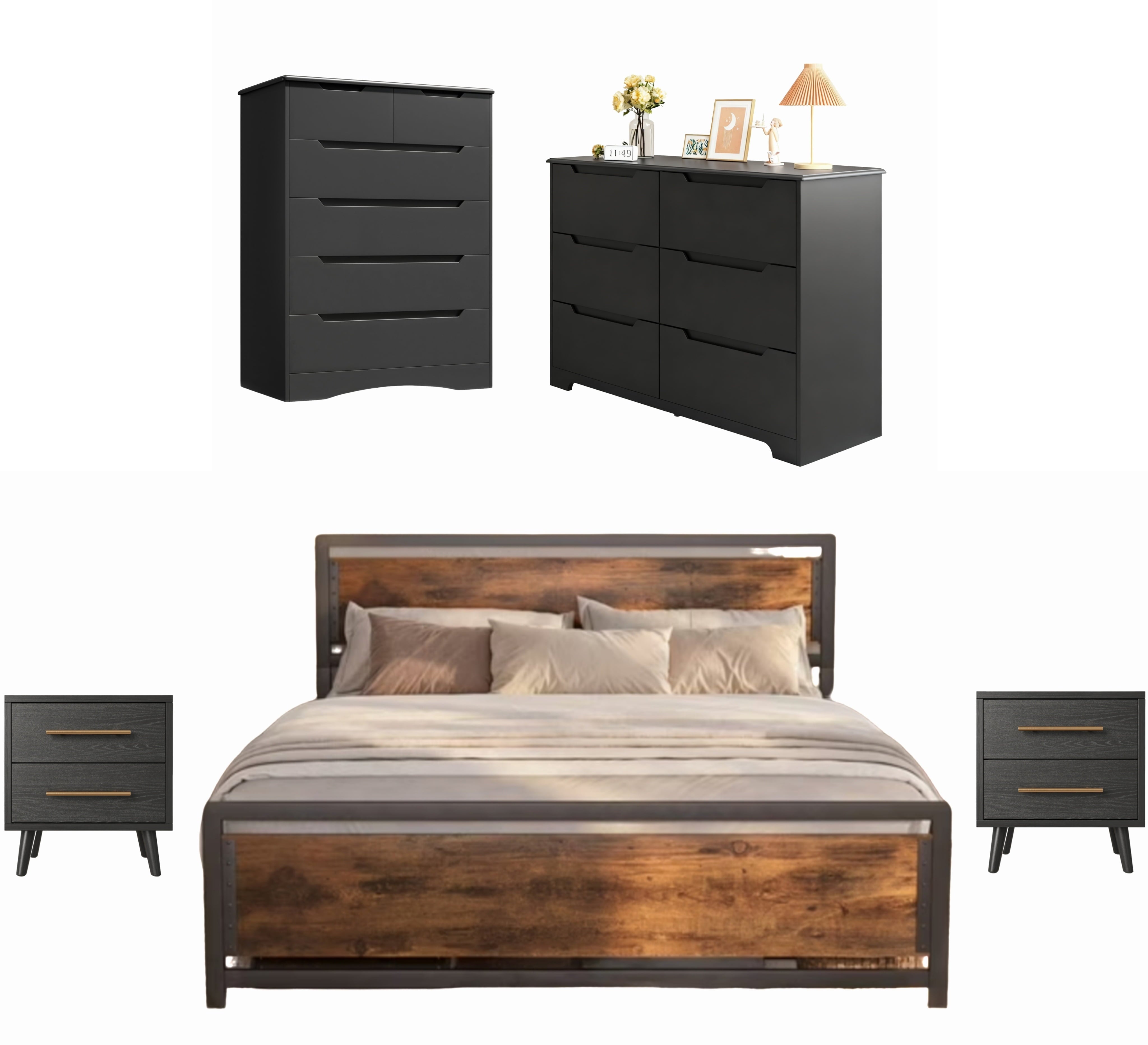Create a perfectly coordinated bedroom with the Asofer Complete Bedroom Set. This bundle includes a king bed frame with a convenient storage headboard, two matching nightstands, a 5-drawer, and a 6-drawer dresser. Enjoy massive storage space, a unified modern design in black and dark gray, and exceptional durability. All pieces are designed for easy assembly and are backed by our 30-day guarantee.