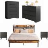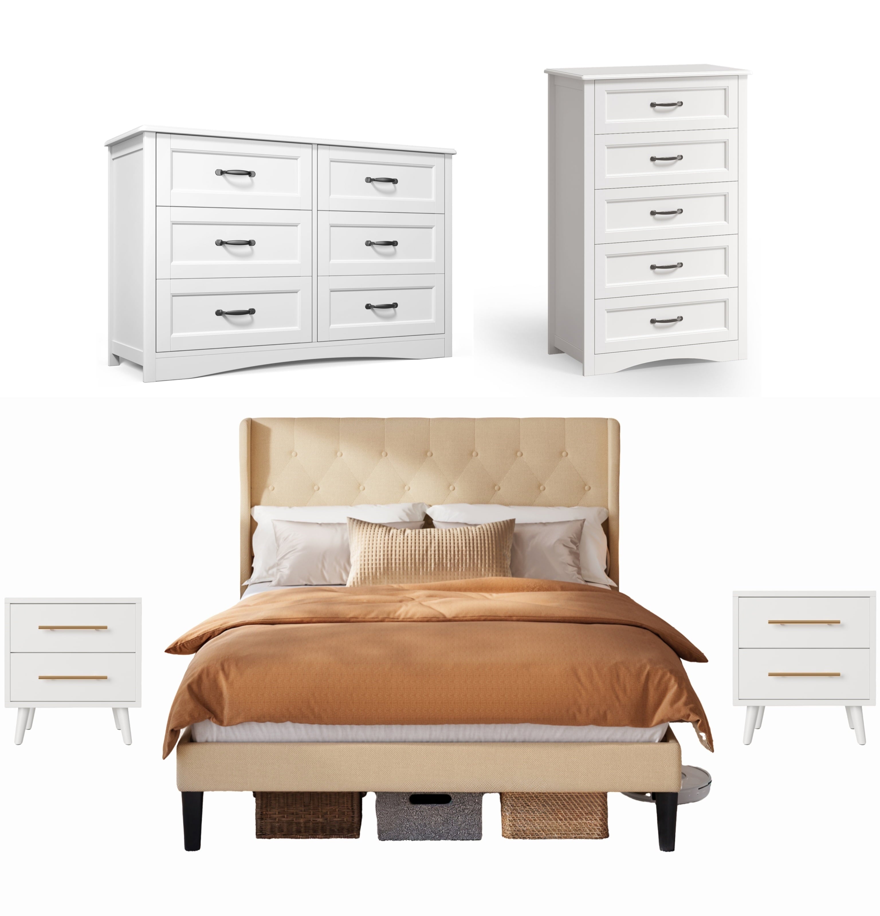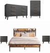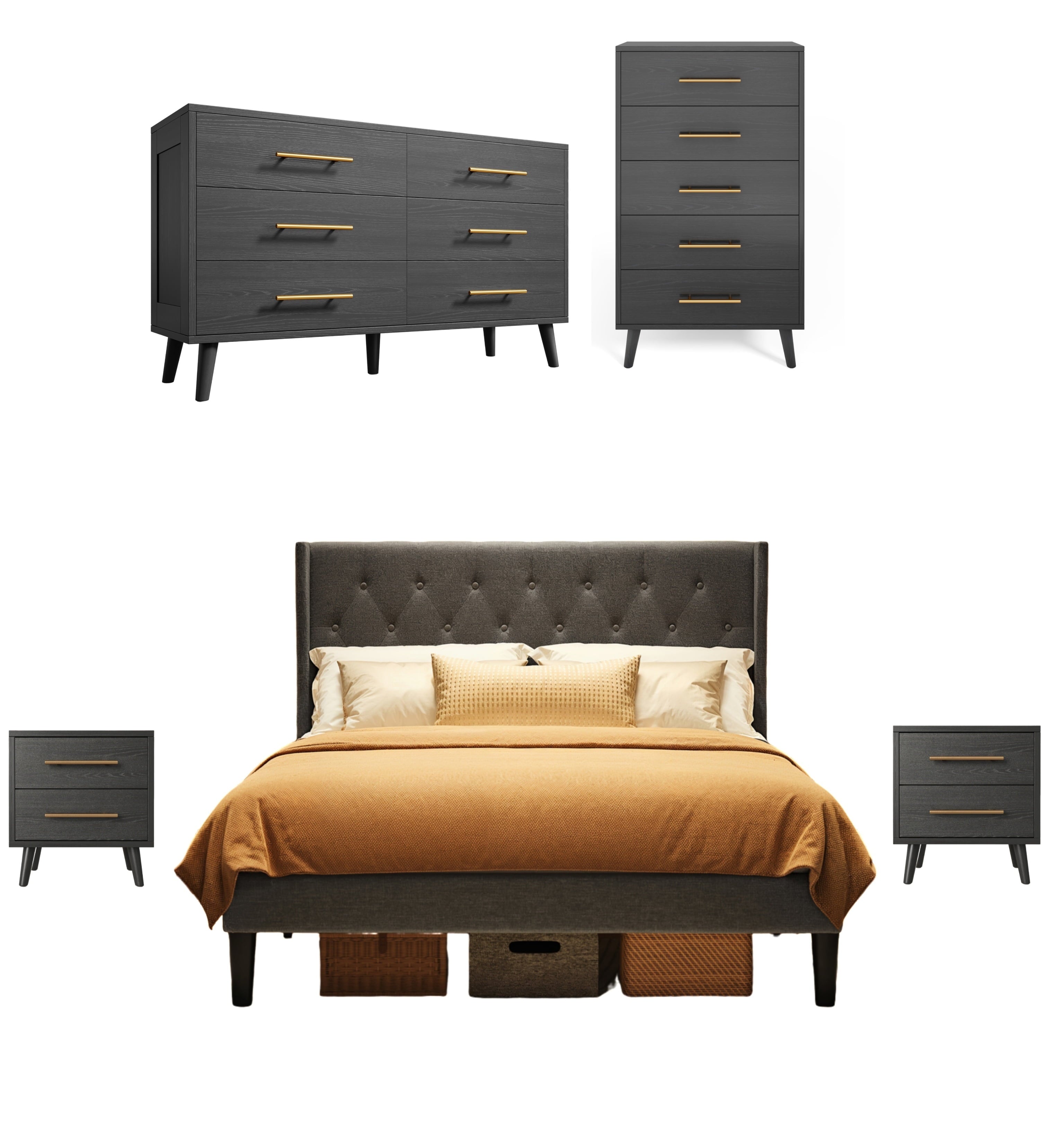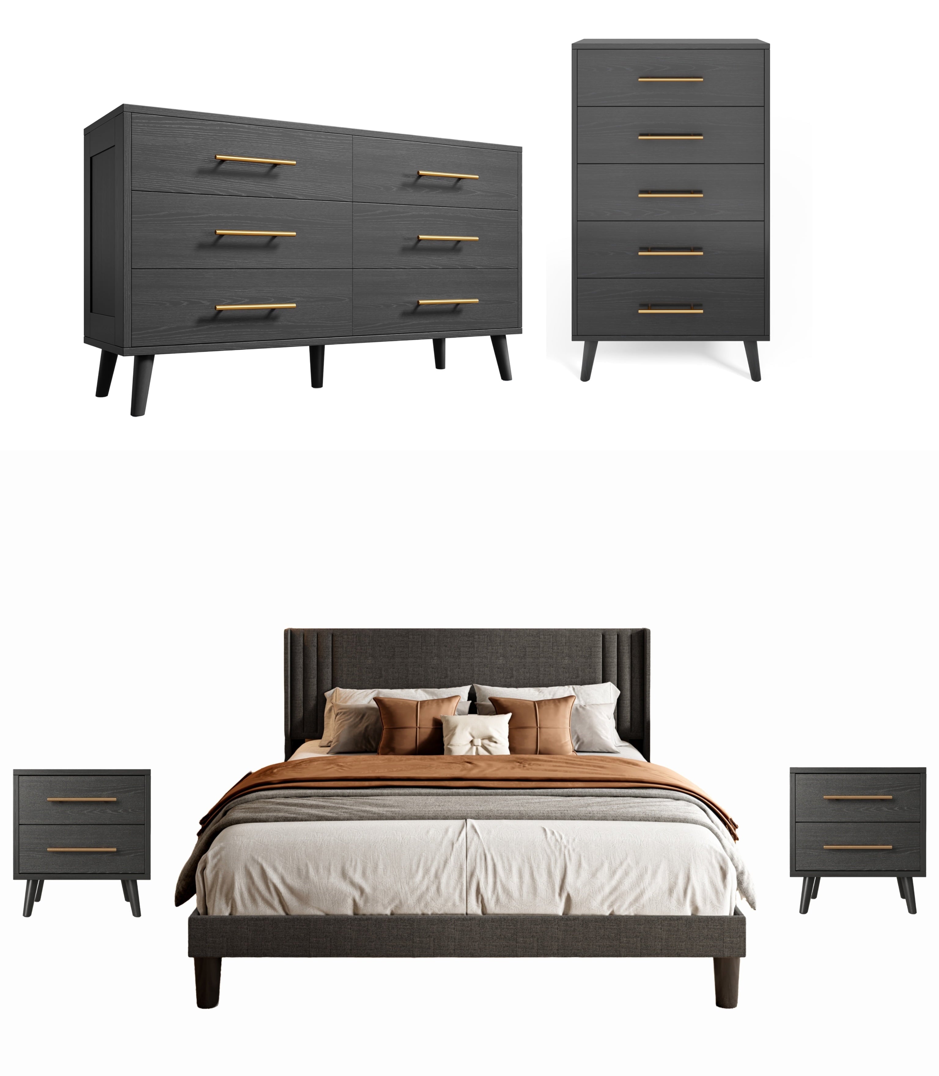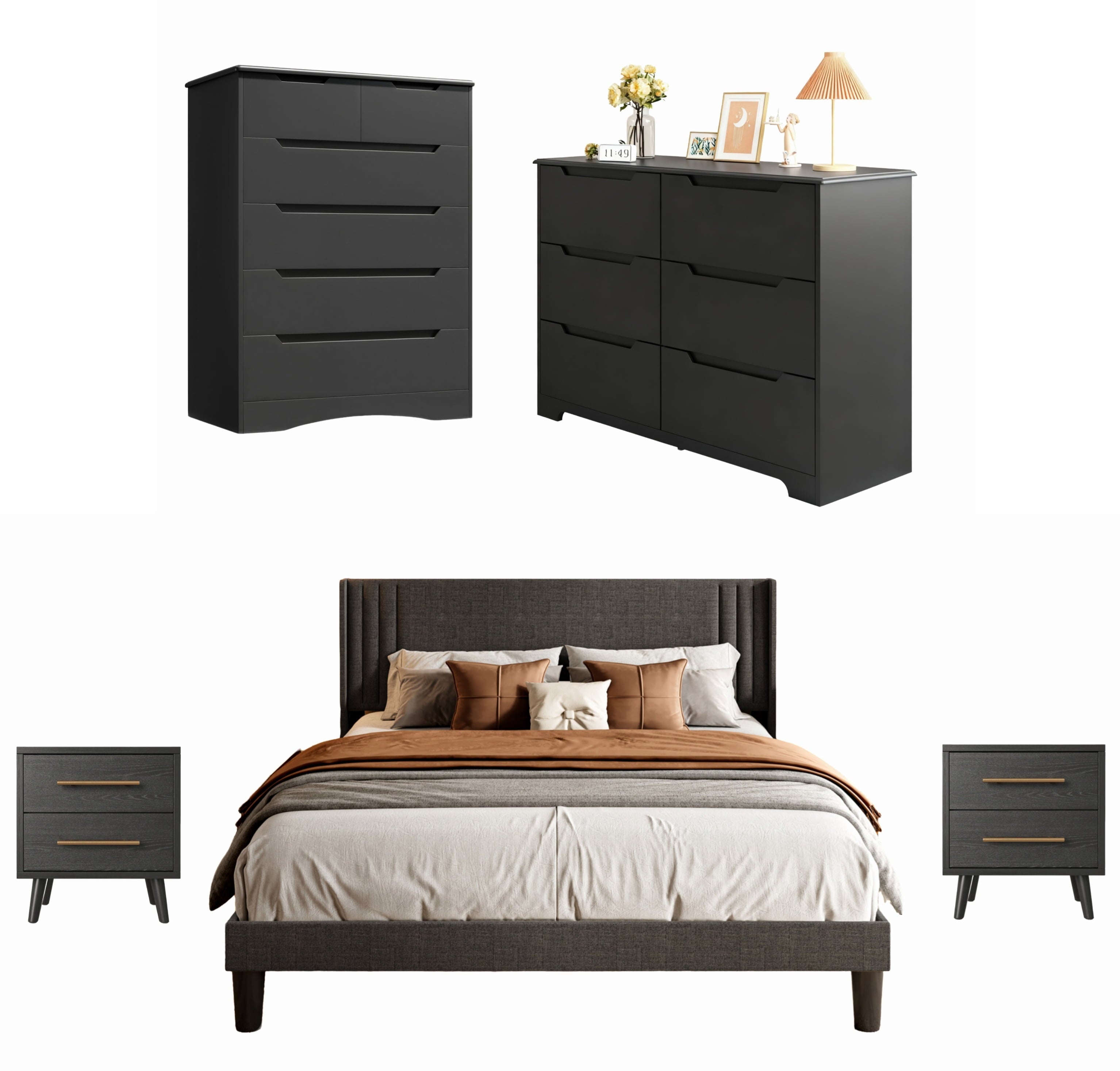 Create a perfectly coordinated bedroom with the Asofer Complete Bedroom Set. This bundle includes a king bed frame with a convenient storage headboard, two matching nightstands, a 5-drawer, and a 6-drawer dresser. Enjoy massive storage space, a unified modern design in black and dark gray, and exceptional durability. All pieces are designed for easy assembly and are backed by our 30-day guarantee.
