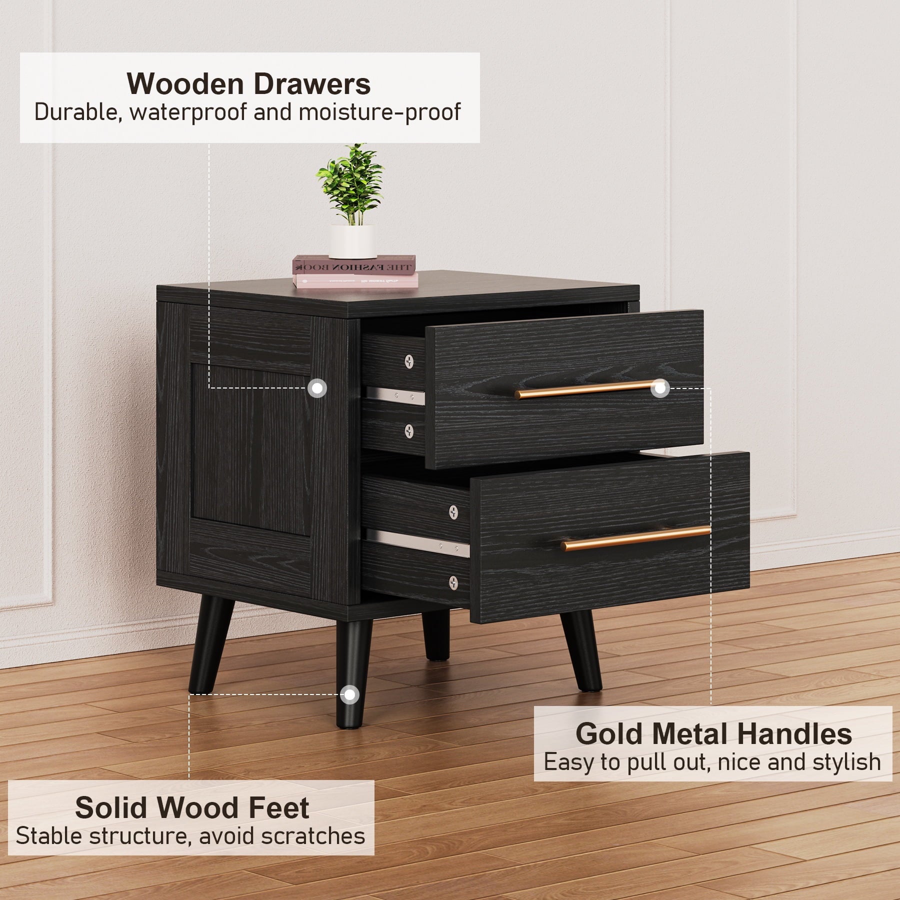 Durable Construction: High-quality engineered wood with metal slides.