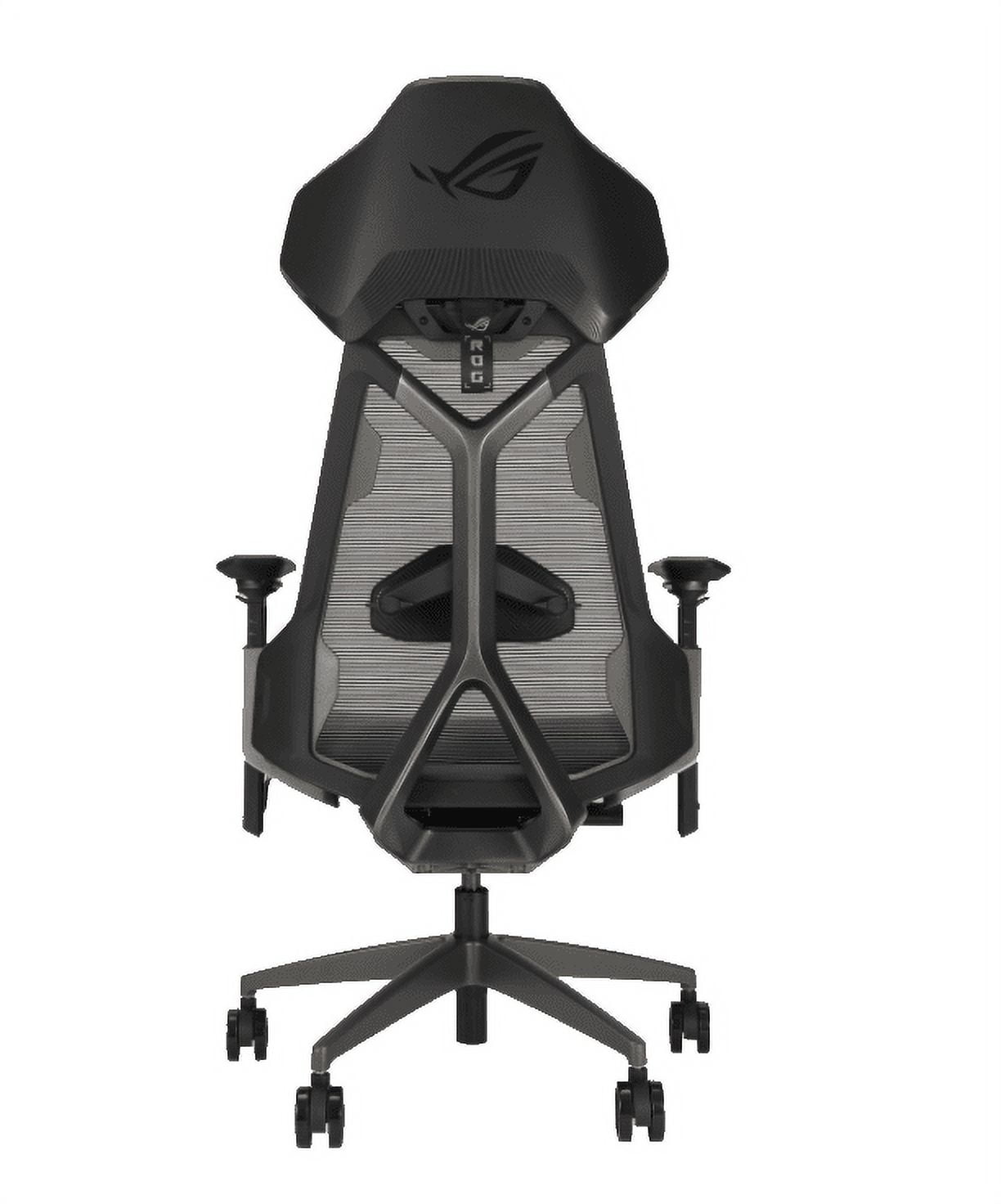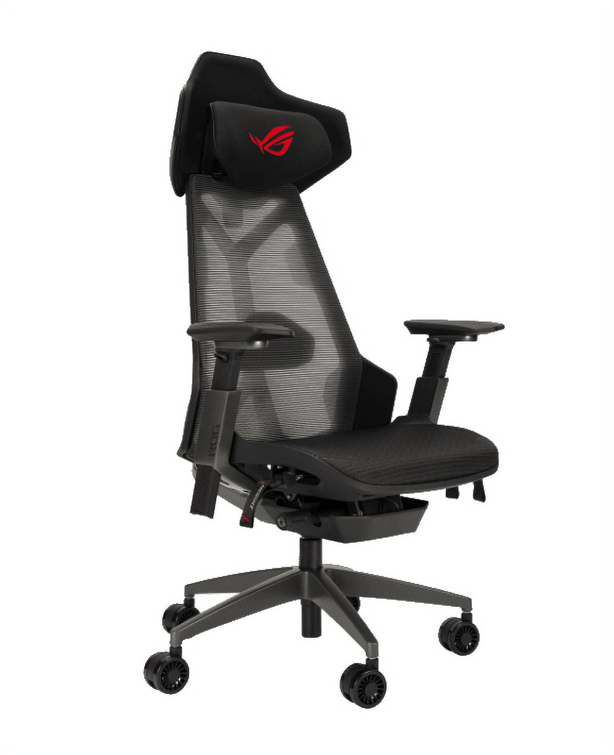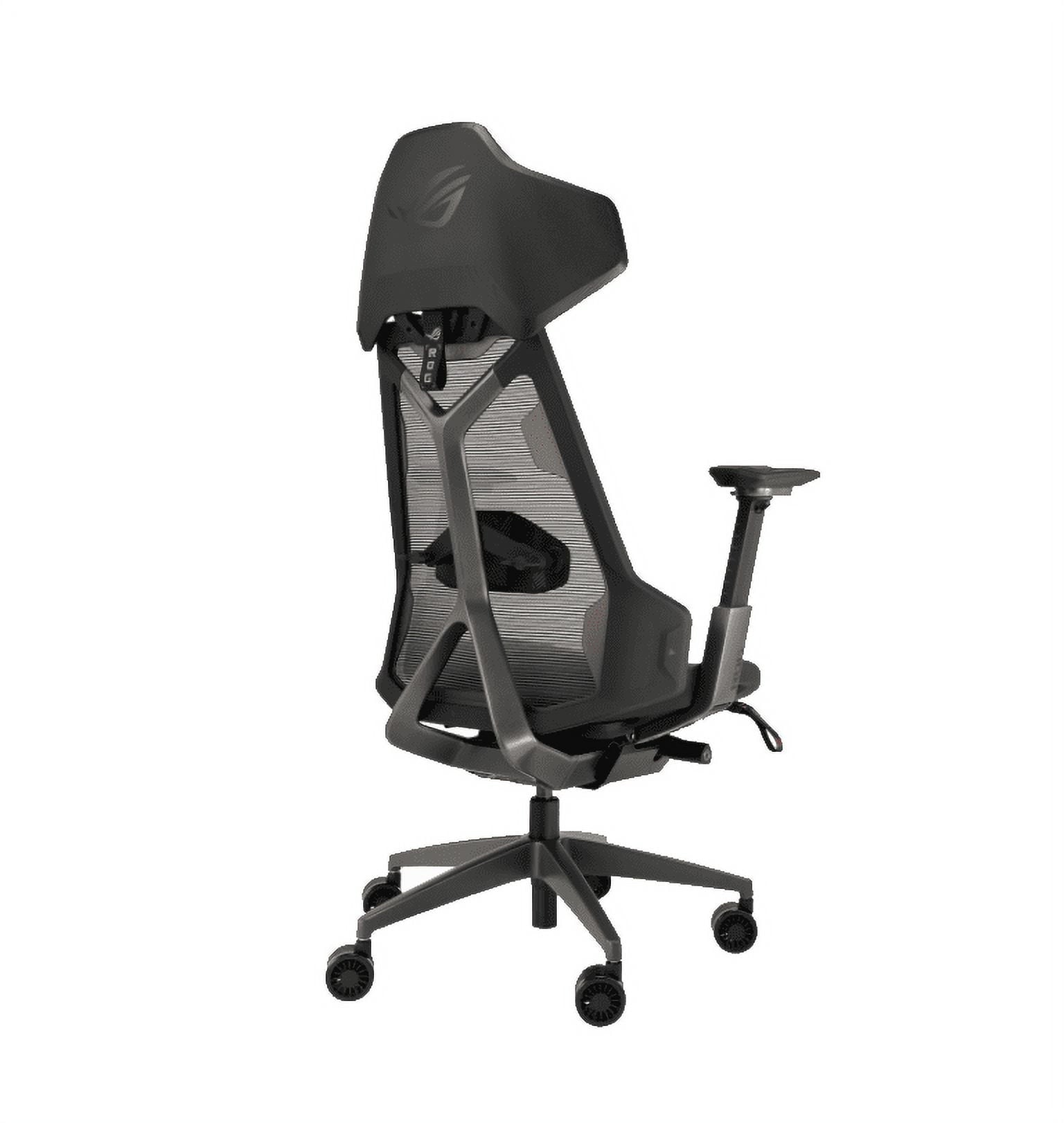 ROG Destrier Ergo Gaming Chair with futuristic cyborg aesthetic, versatile seat adjustments for the perfect posture, mobile gaming arm support mode, and acoustic panel for less distraction and more immersive gaming experience.
