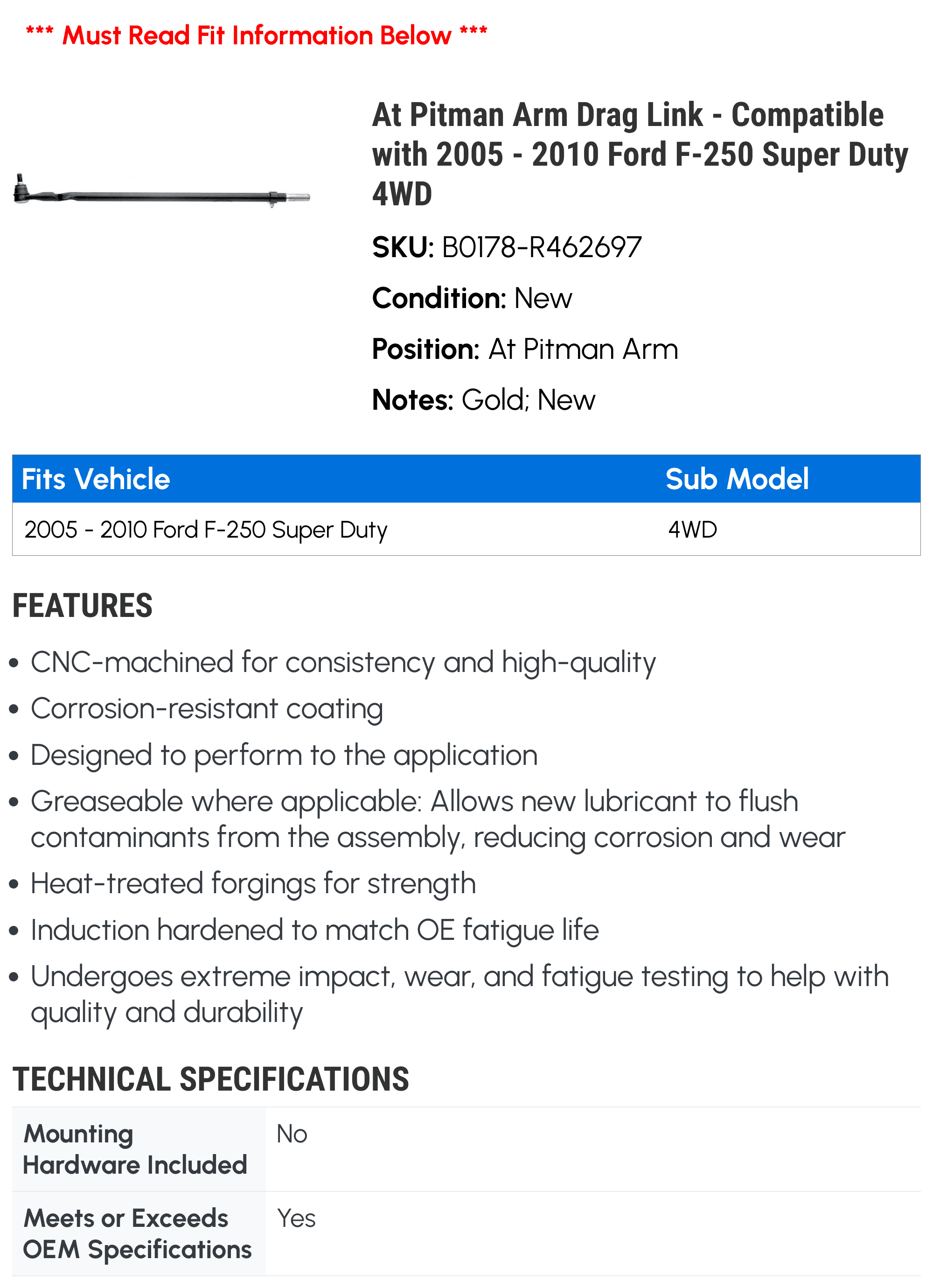 At Pitman Arm Drag Link – Compatible with 2005 – 2010 Ford F-250 Super Duty 4WD